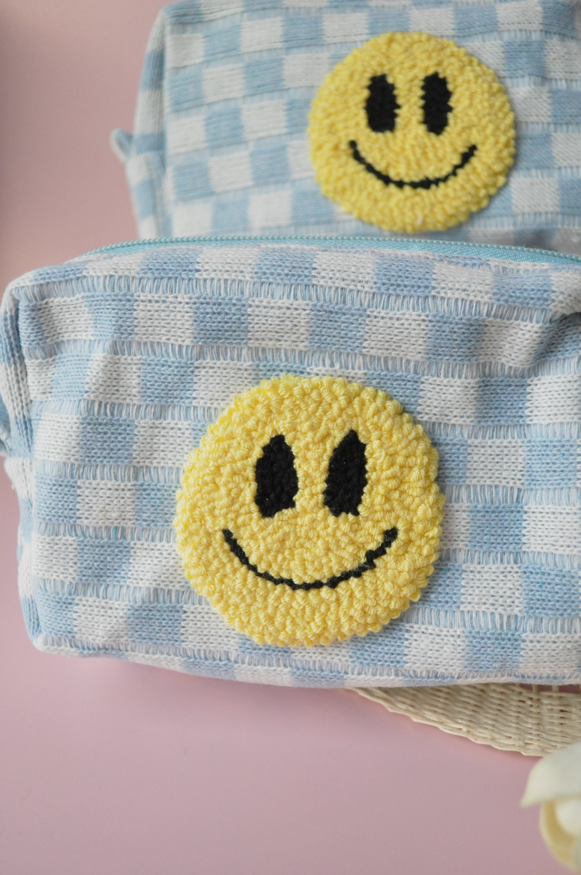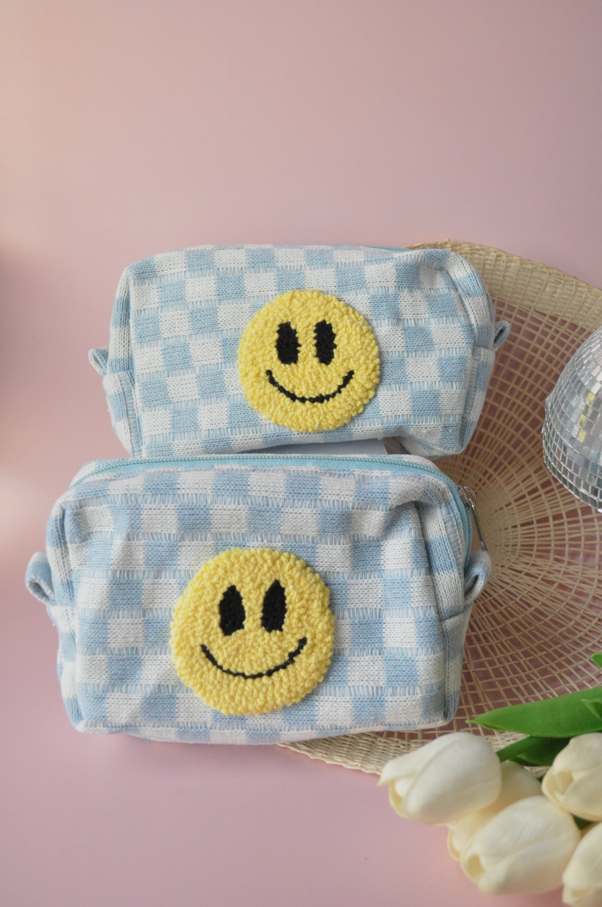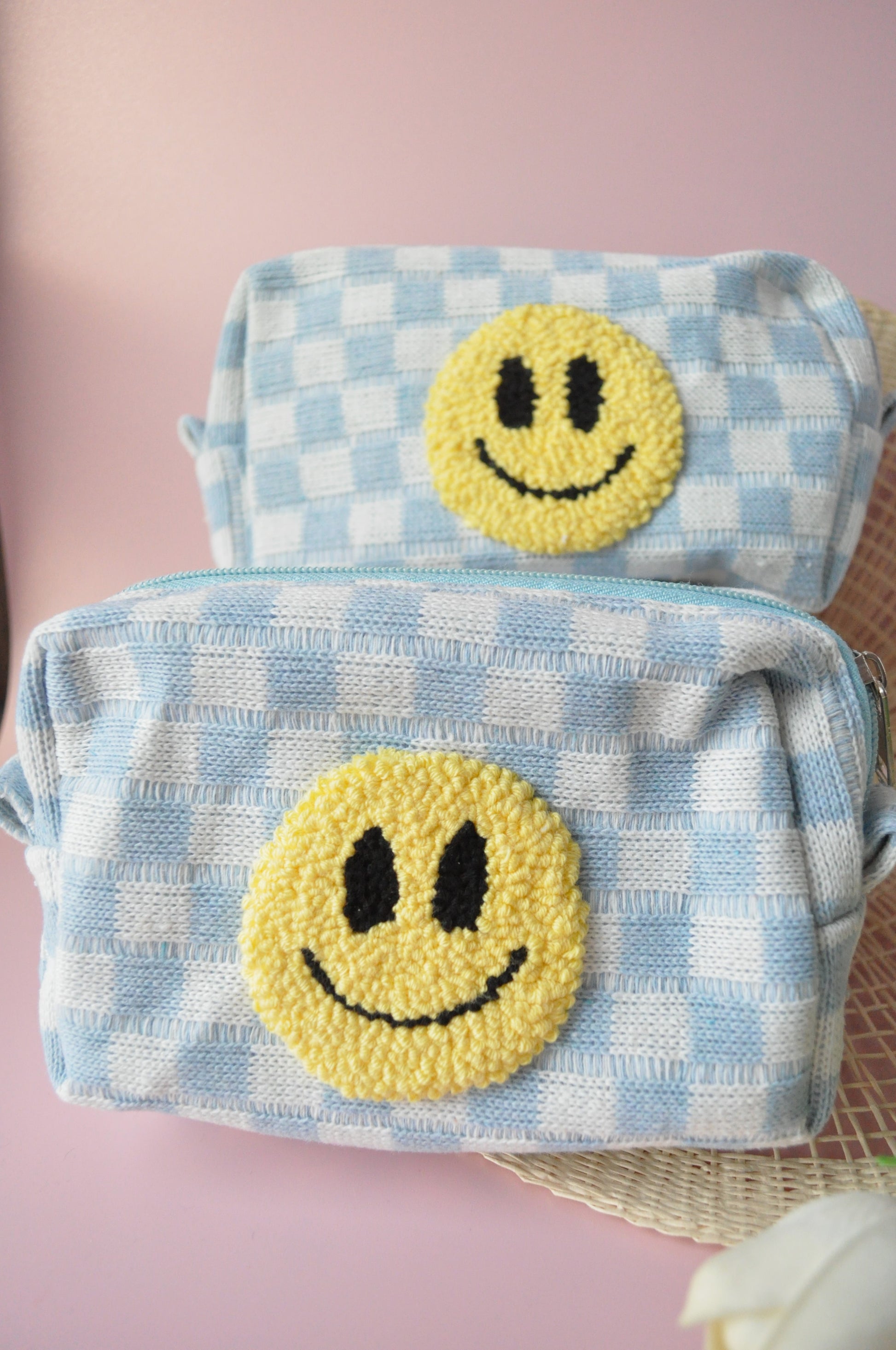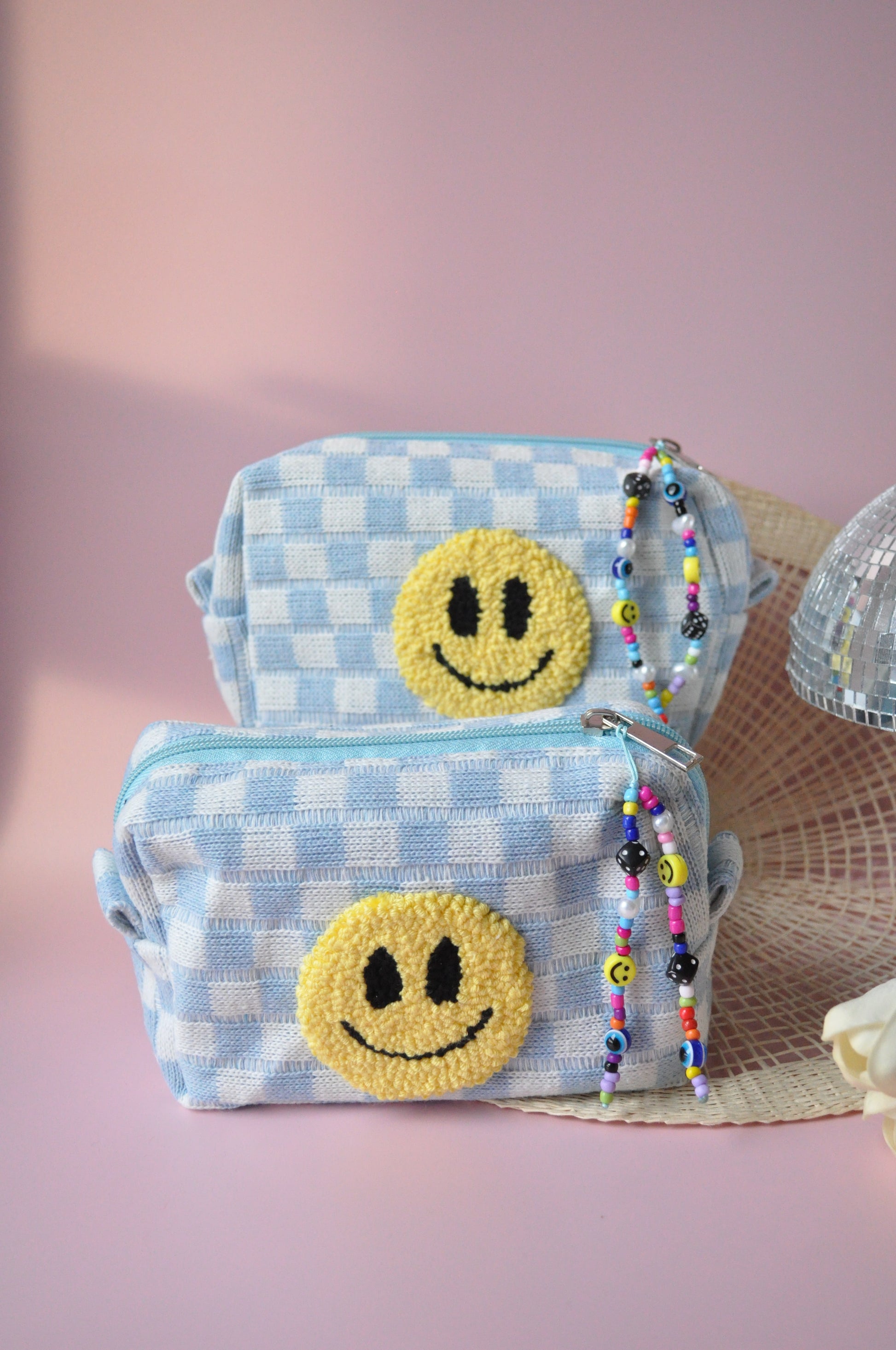 Brighten up your everyday routine with the Baby Blue Checkered Pattern Zipper Bag. Featuring a playful handmade punch needle smiley emoji, this bag is the perfect mix of fun and style. Its chic checkered design in soft baby blue is complemented by a secure zip closure and a cute beaded chain puller for added charm. Ideal as a makeup bag or pencil case, it’s the perfect way to keep your essentials organised with flair. Add a touch of colour and personality to your day with this must-have accessory!