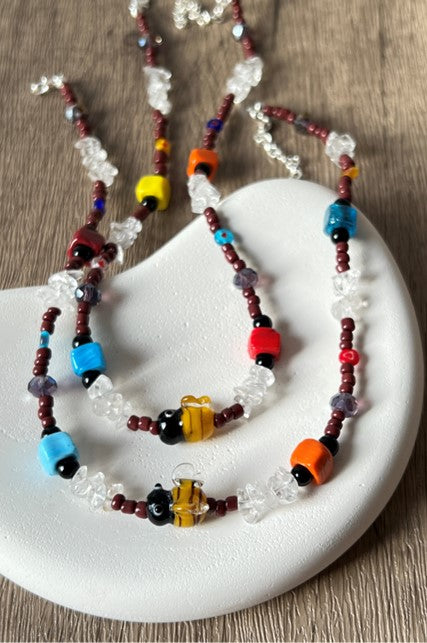 Embrace elegance with our Bee Charm Murano Glass and White Quartz Bead Necklace. This unique piece combines vibrant Murano glass beads, smooth white quartz, and a playful bee charm for a distinctive look. The mix of cube Murano and smooth glass beads creates a dynamic, eye-catching design, while the white quartz adds a touch of sophistication. Perfect for adding a pop of colour and charm to any outfit, this necklace is a versatile accessory that effortlessly elevates your style.