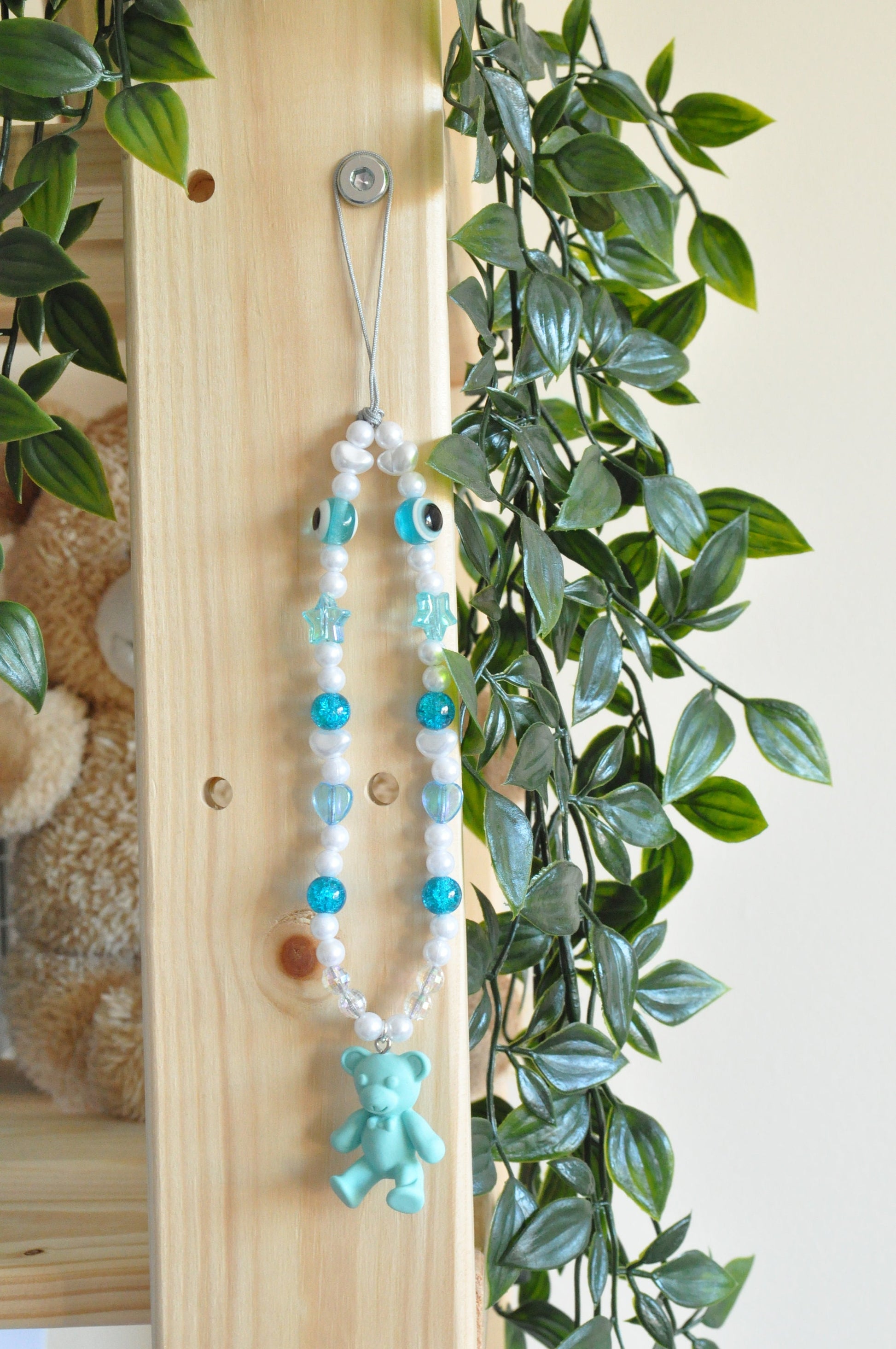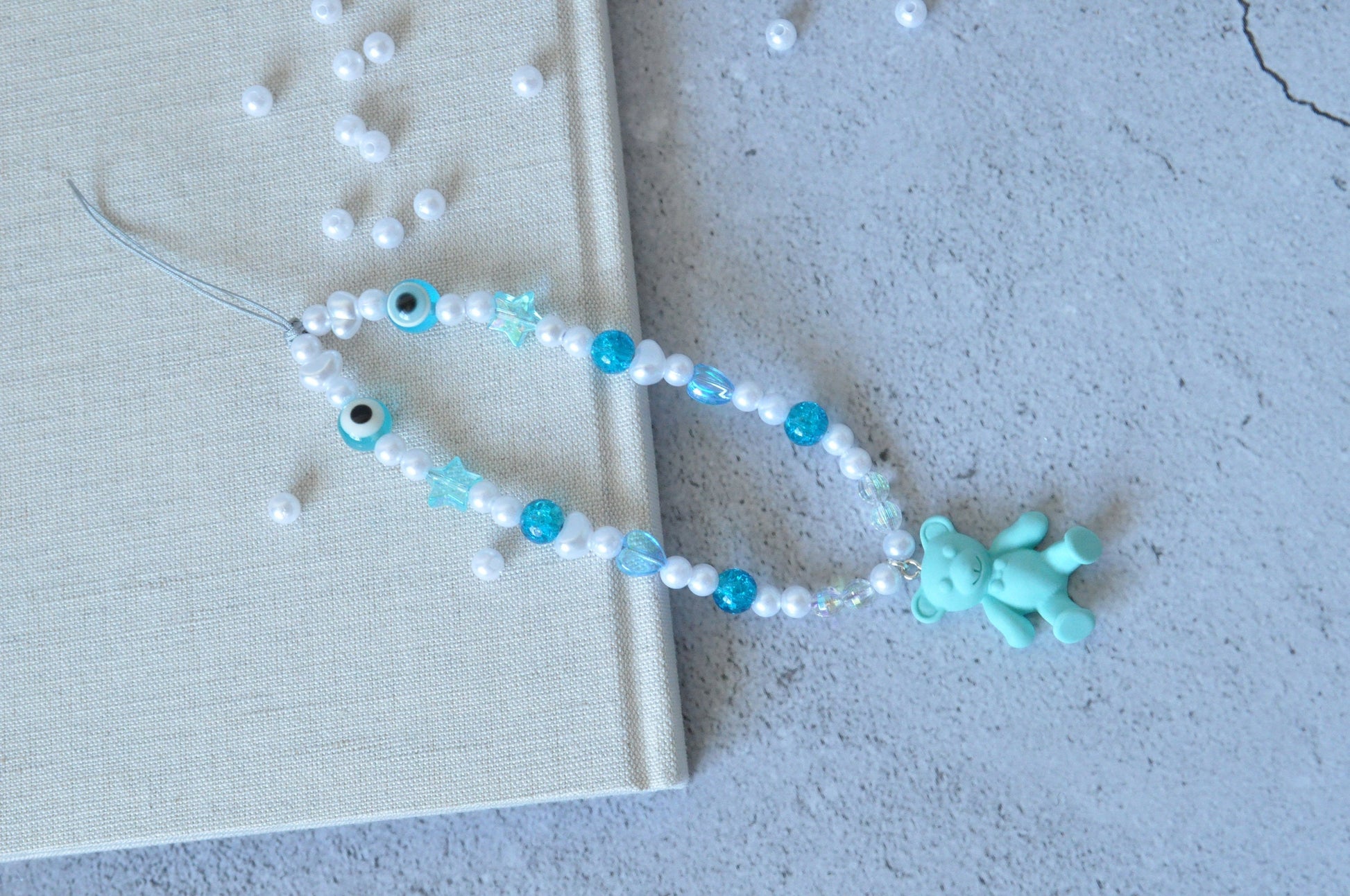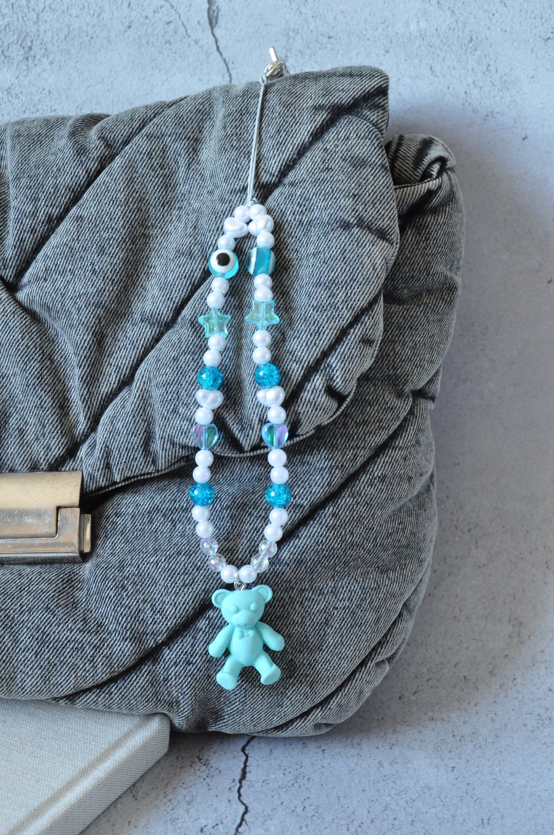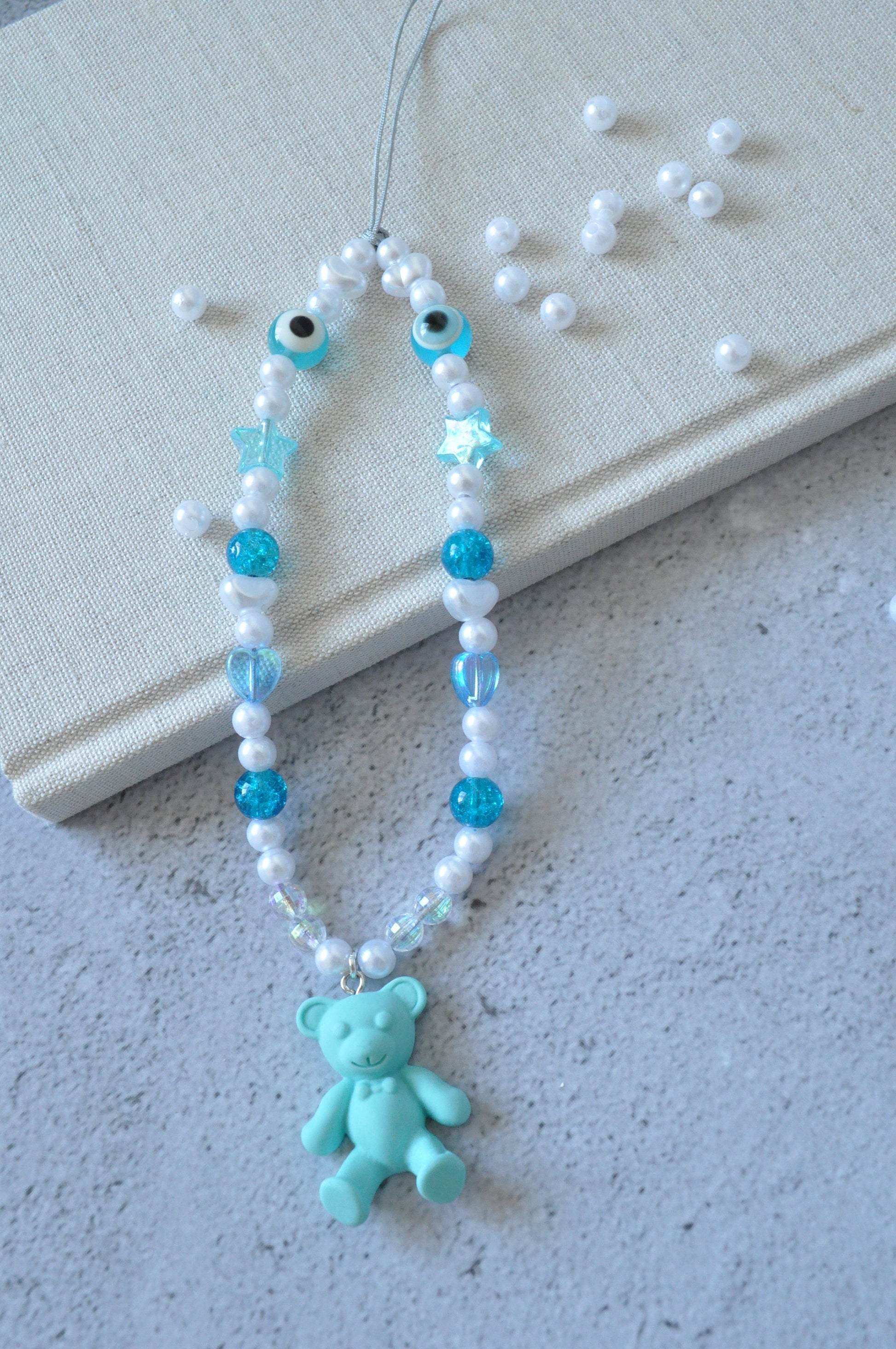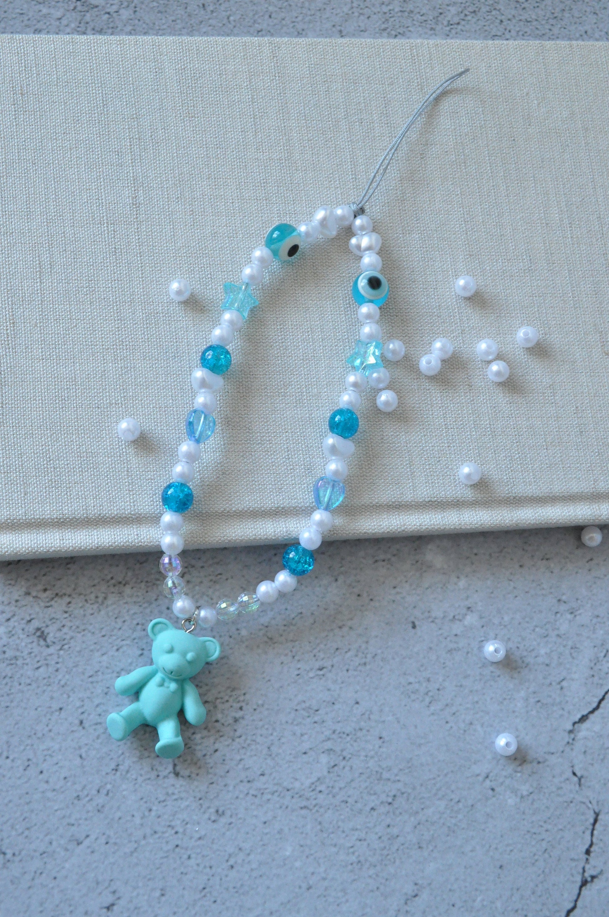 This blue teddy bear phone charm with evil eye beads is perfect for anyone looking to stay stylish and safe. This unique phone charm strap features a cute teddy bear, glass beads and protective evil eyes made of colourful beads, each featuring its own distinctive design.