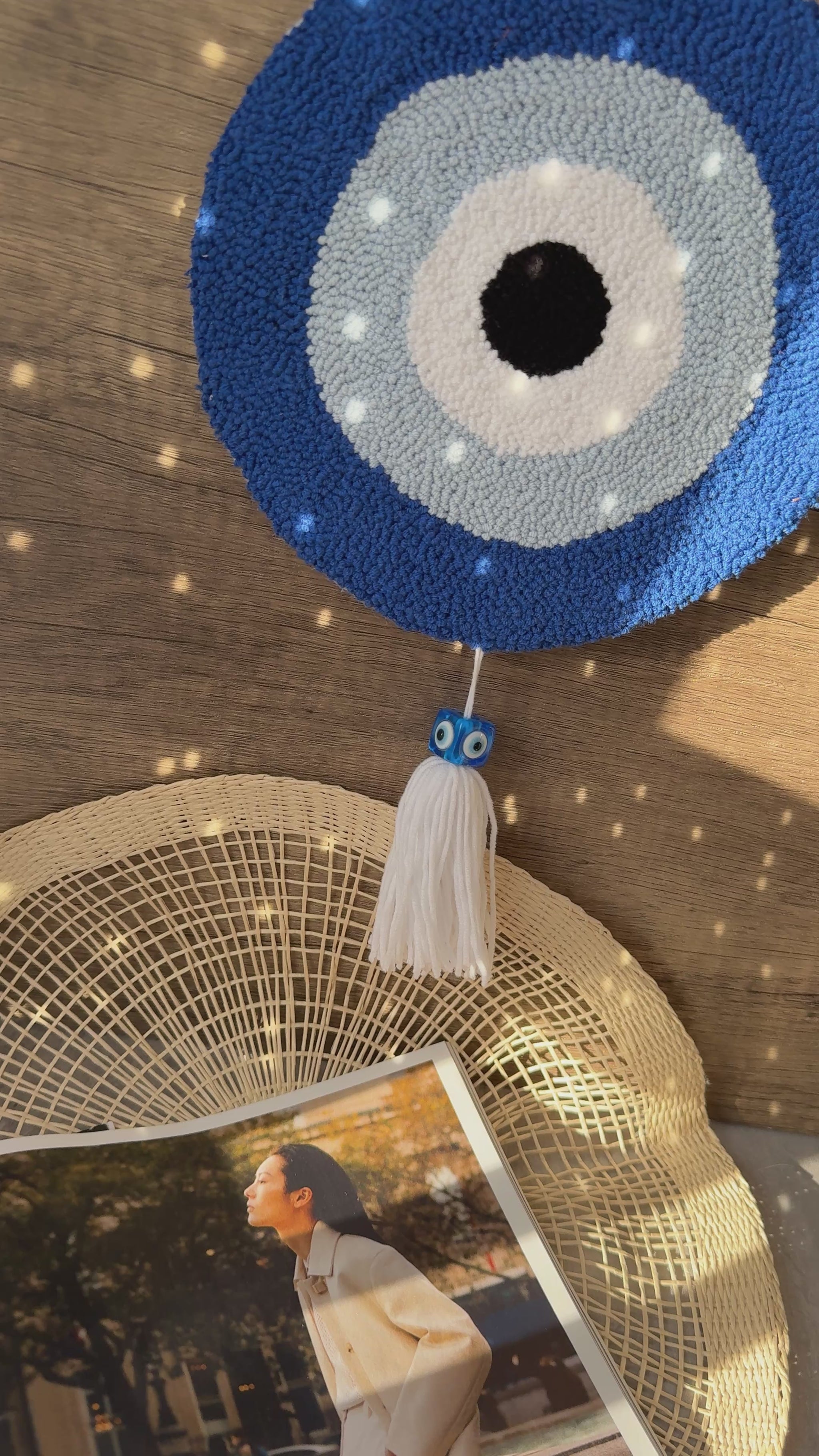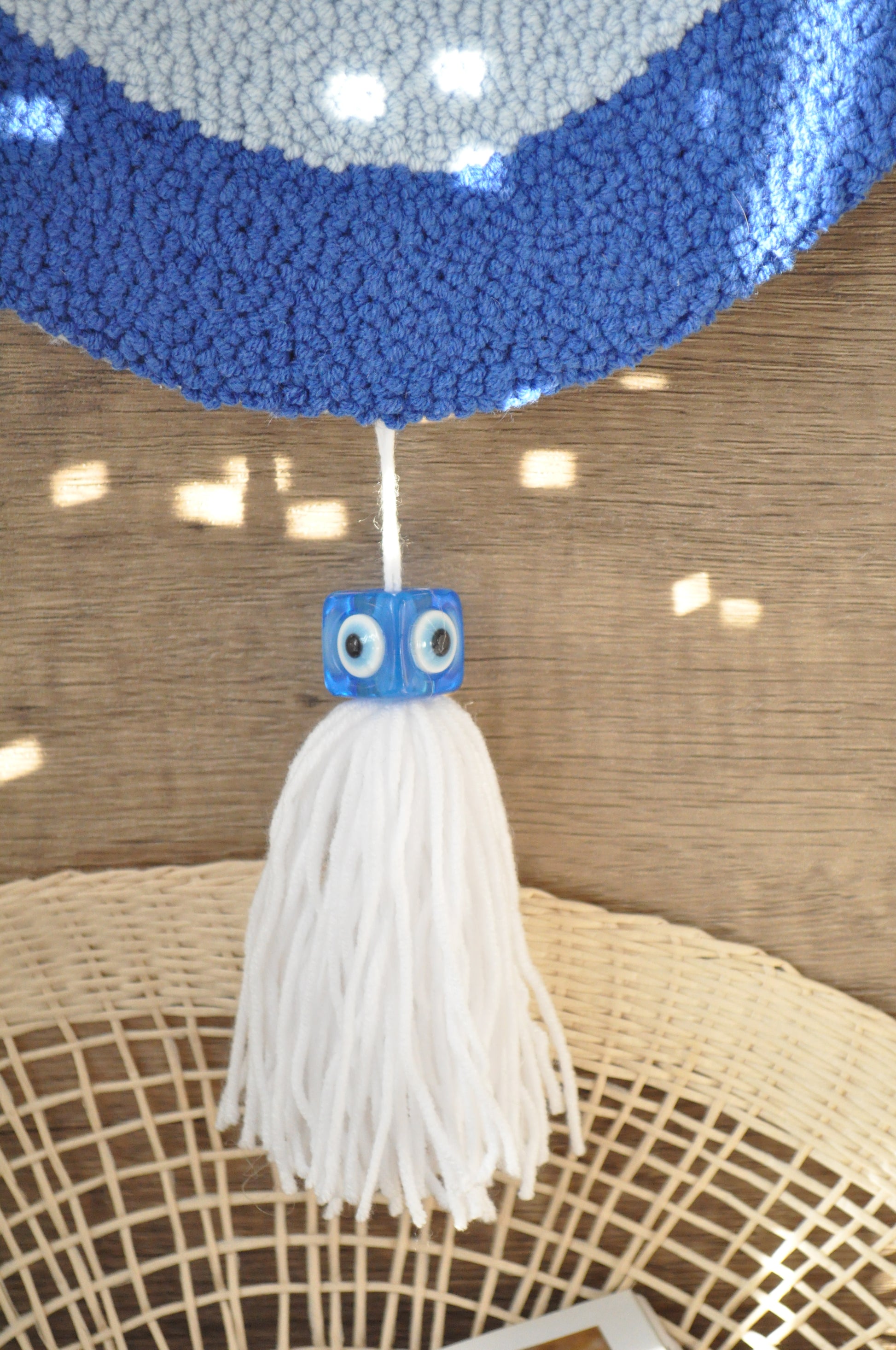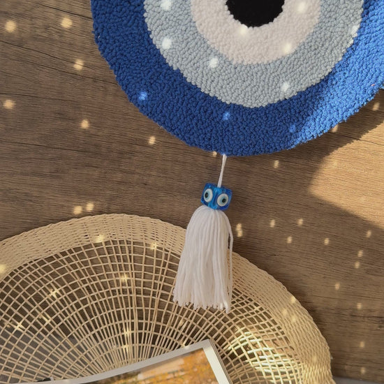 Bring tradition and positive energy into your home with this beautifully handmade punch needle wall art, featuring the classic evil eye design in blue, white, and black. Symbolising protection and warding off negativity, this timeless piece blends cultural significance with artistic craftsmanship.