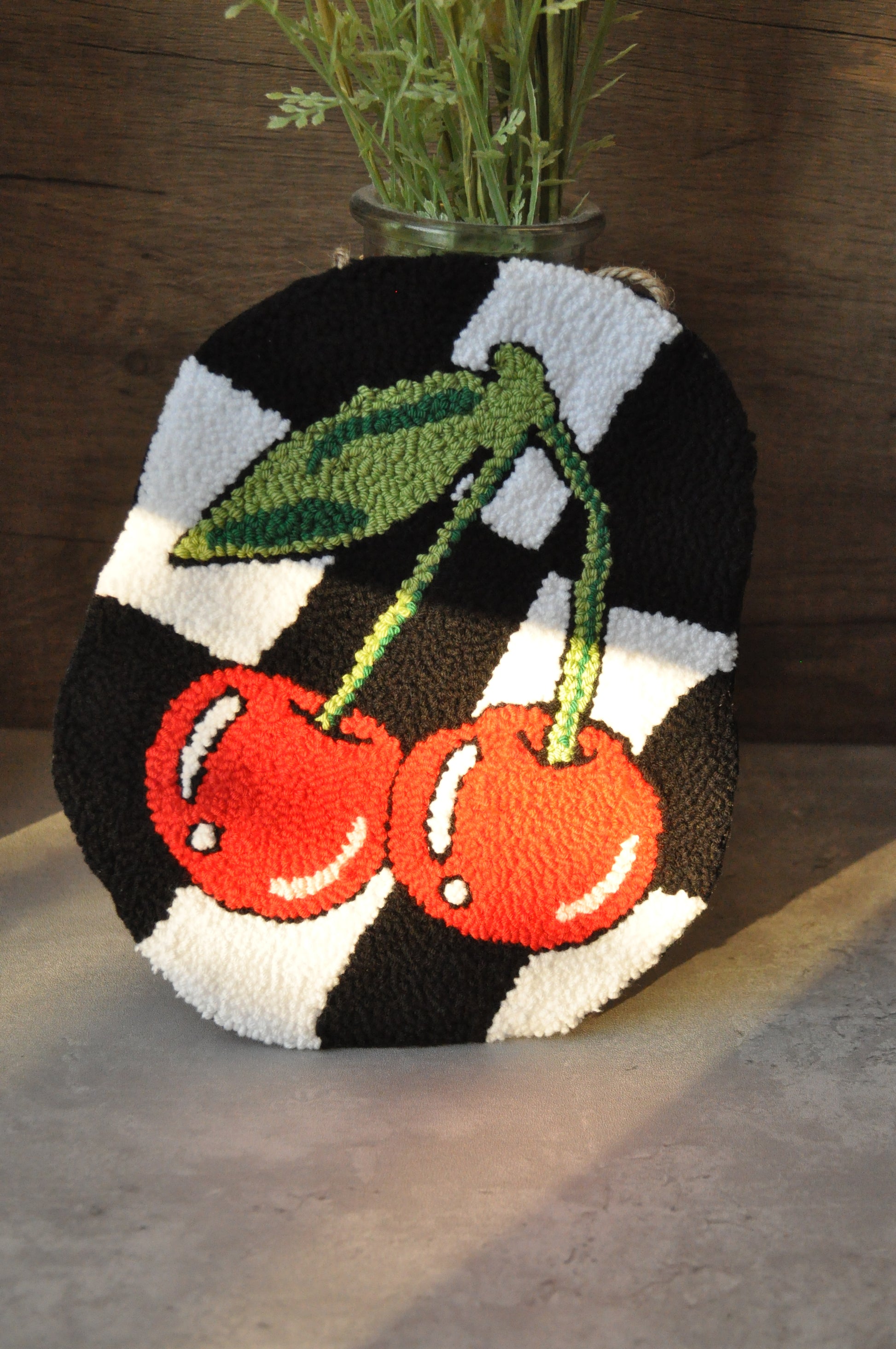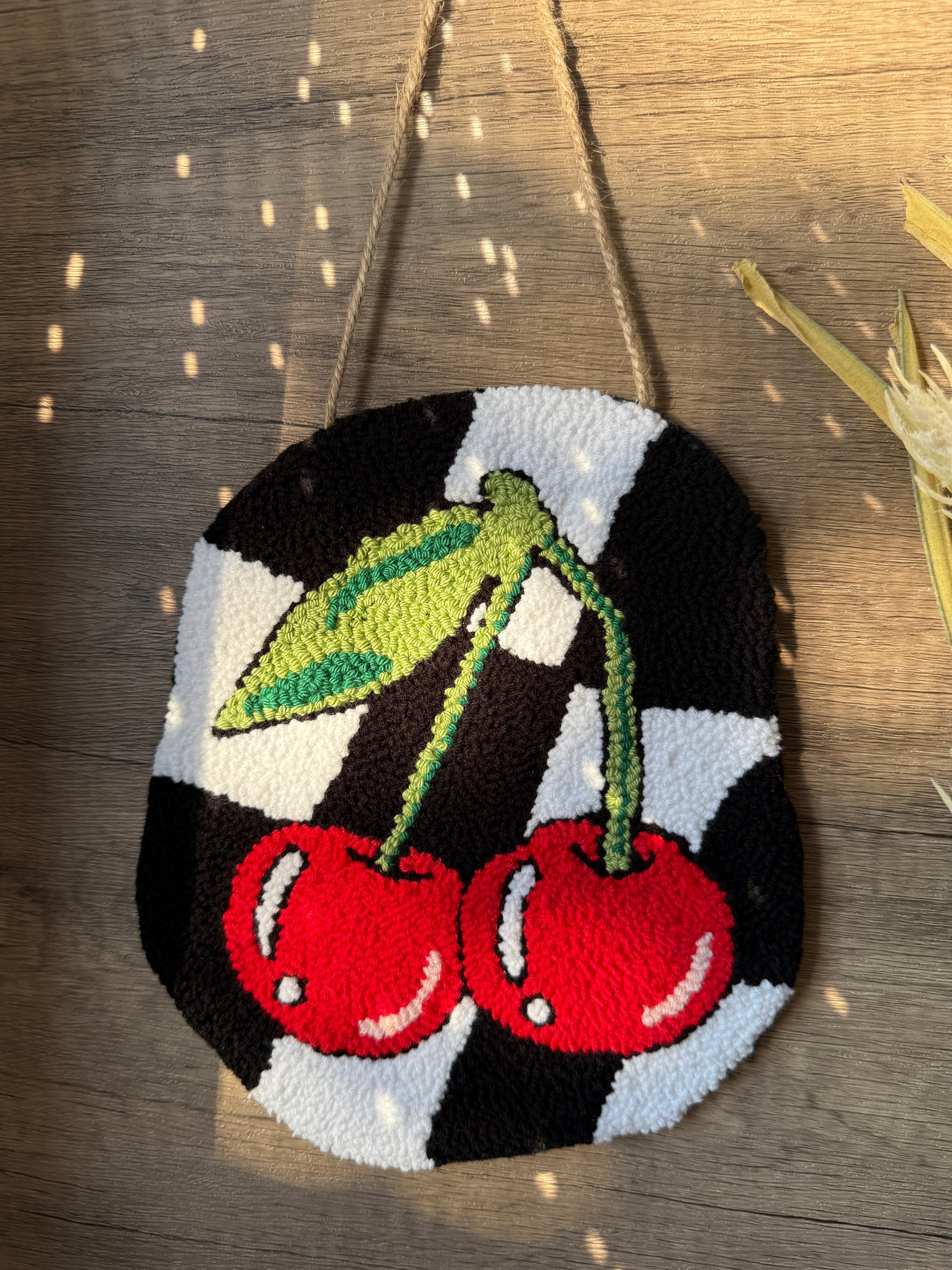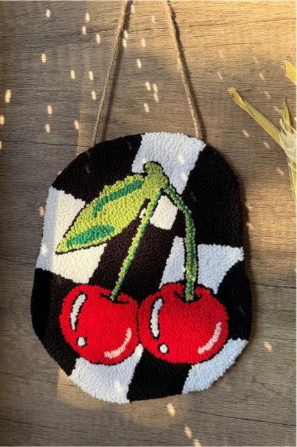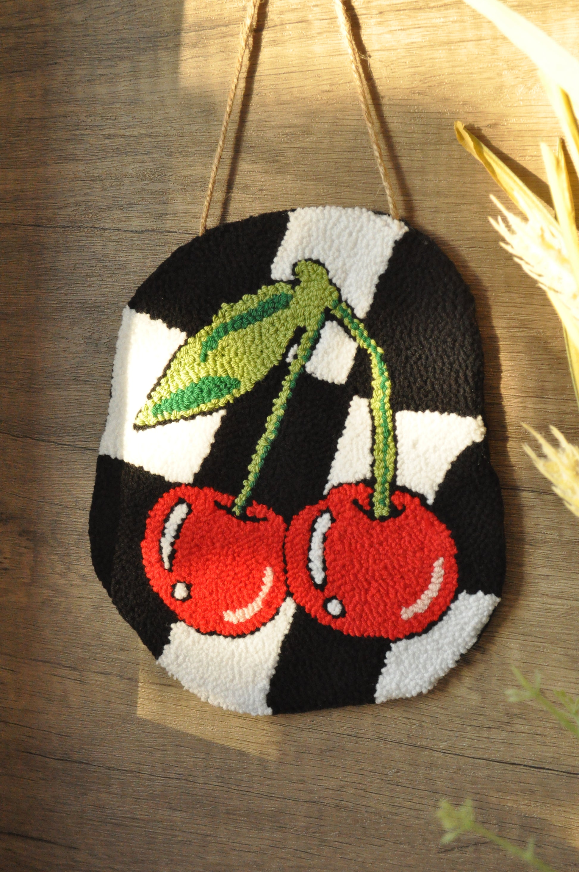 Ideal keywords: punch needle wall art, cherry wall décor, checkered wall art, handmade textile art, modern wall hanging, fruit design wall art, unique home décor, handcrafted artwork.