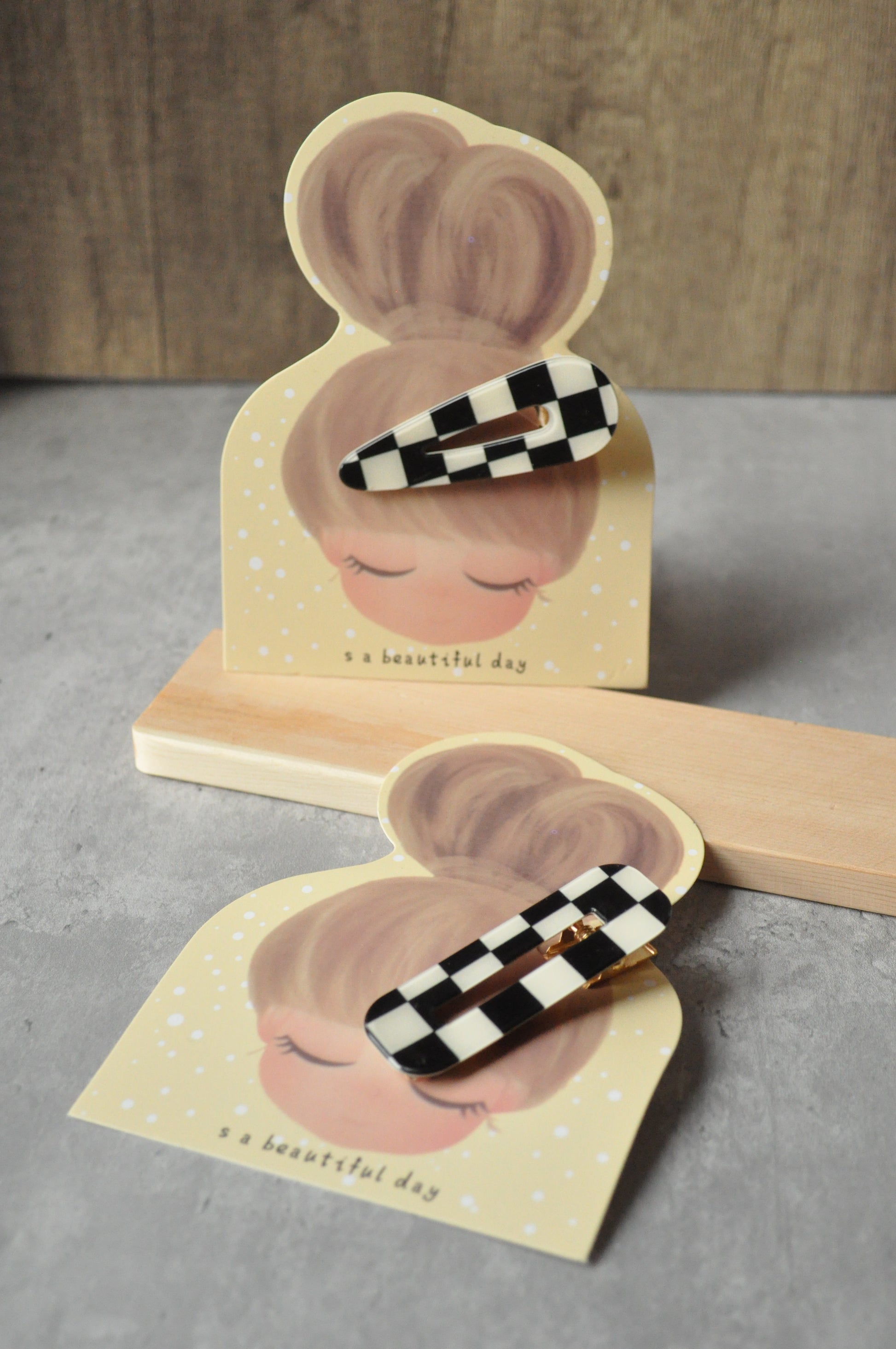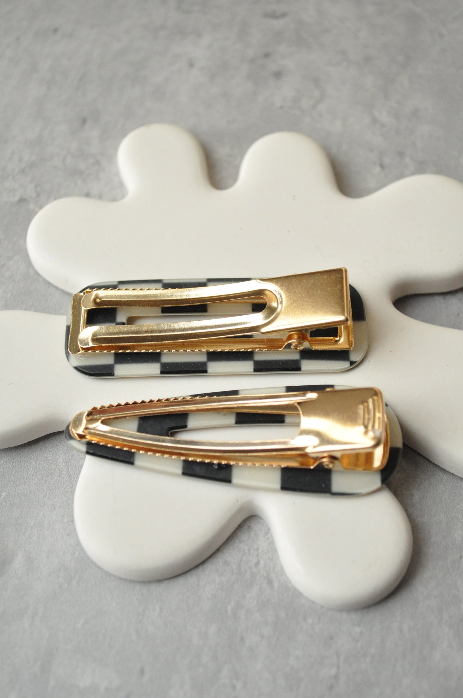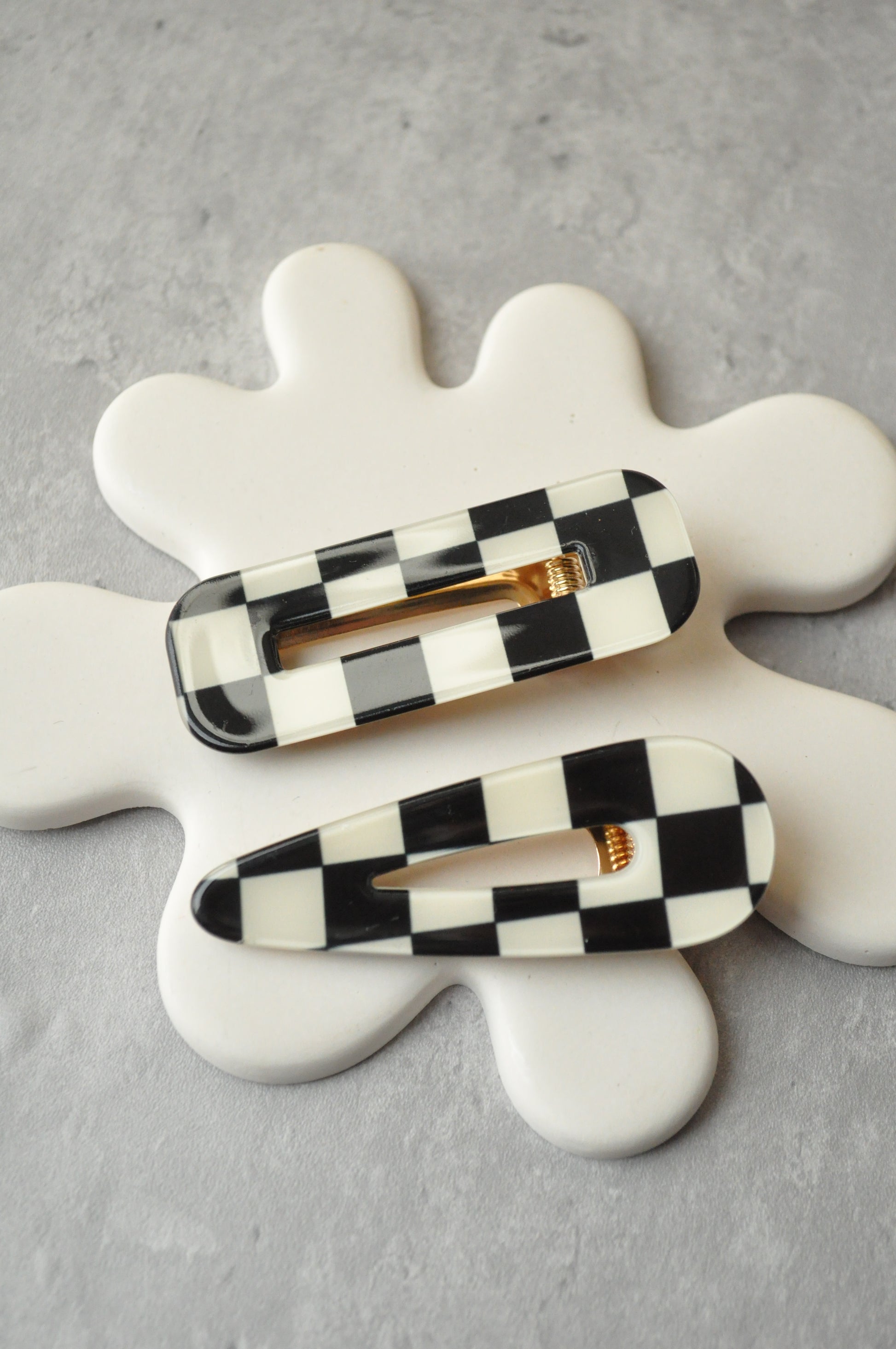 Add a bold touch to your look with this checkered duo hair clip set. Featuring a classic black and cream checkerboard pattern, these clips bring a playful yet chic vibe to any hairstyle. Perfect for mix-and-match styling, this set includes two distinct shapes to suit your mood. Secure and stylish, they’re a fun accessory to enhance your everyday ensemble.