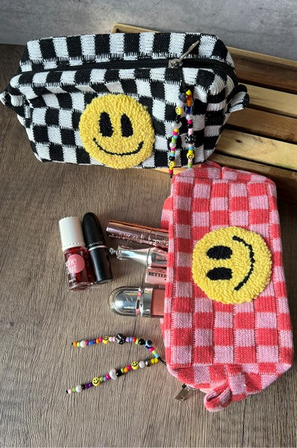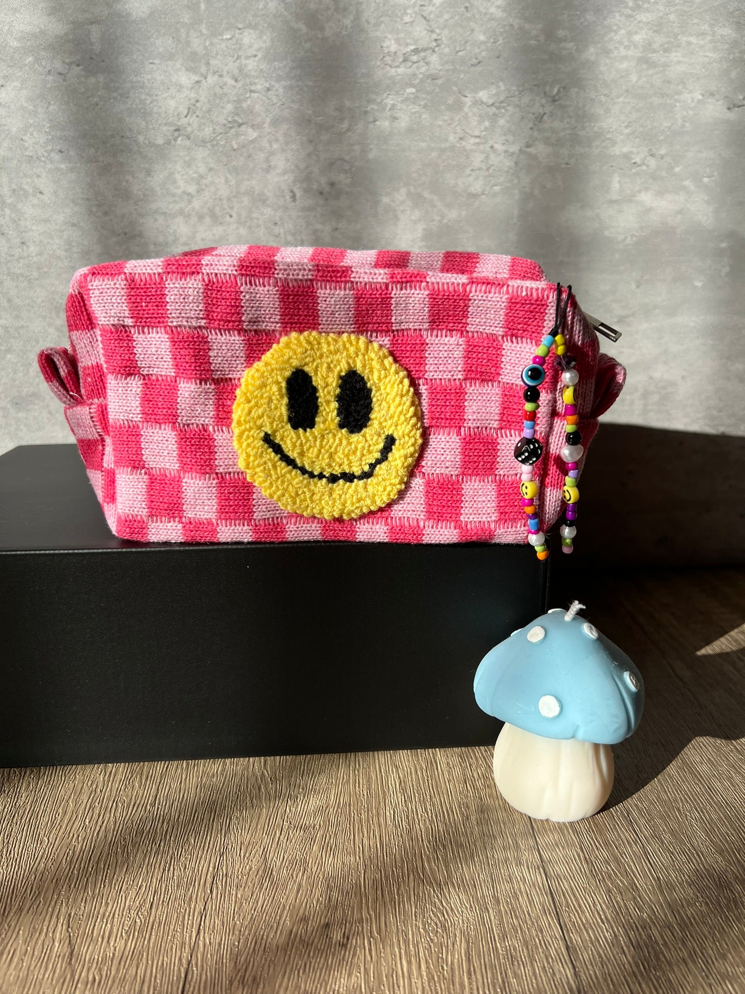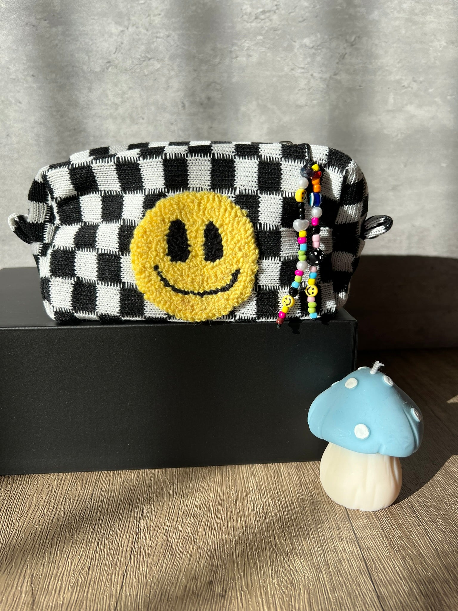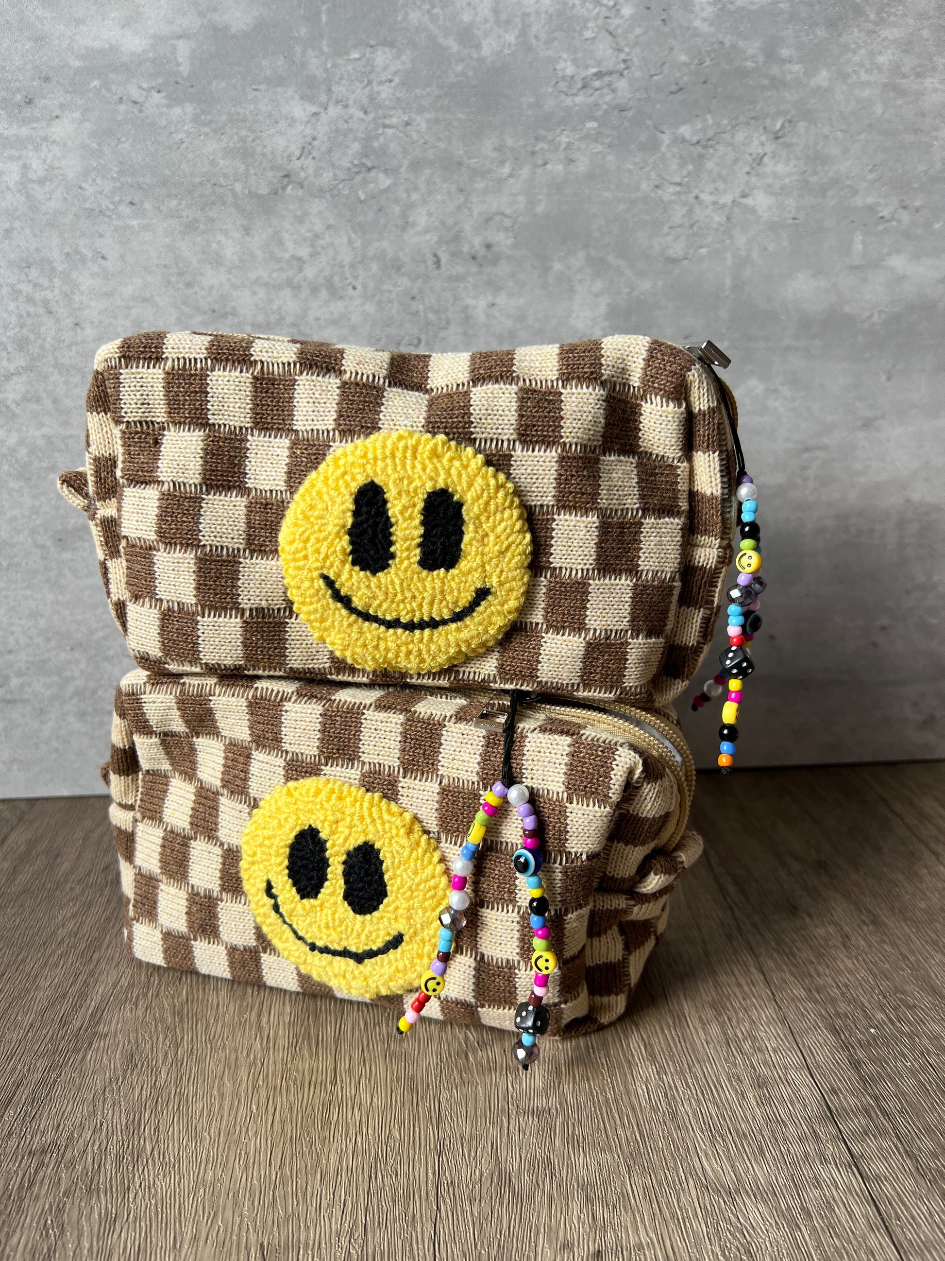 Add a pop of colour and personality to your daily routine with our Checkered Pattern Zipper Bag, featuring a playful handmade punch needle smiley emoji. Available in four stylish colours—baby blue, pink, brown, and black—this bag combines a chic checkered design with a fun smiley detail. The zip closure ensures your essentials stay secure, while the beaded chain puller adds a cute finishing touch. Whether you use it as a makeup bag or pencil case, this trendy accessory is perfect for keeping your items organised in style. Make a statement with the Checkered Pattern Zipper Bag today!