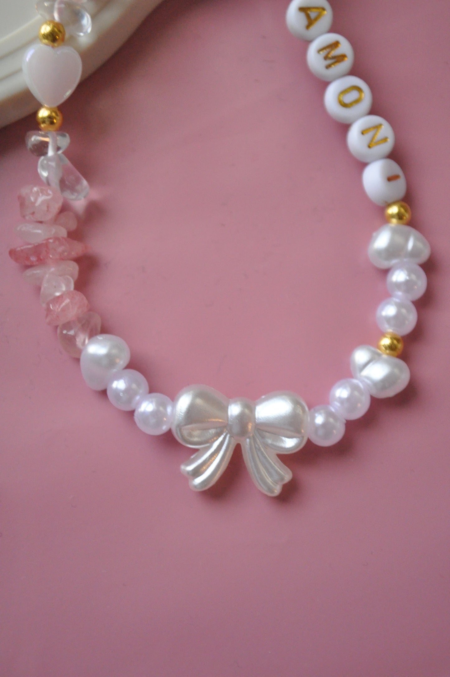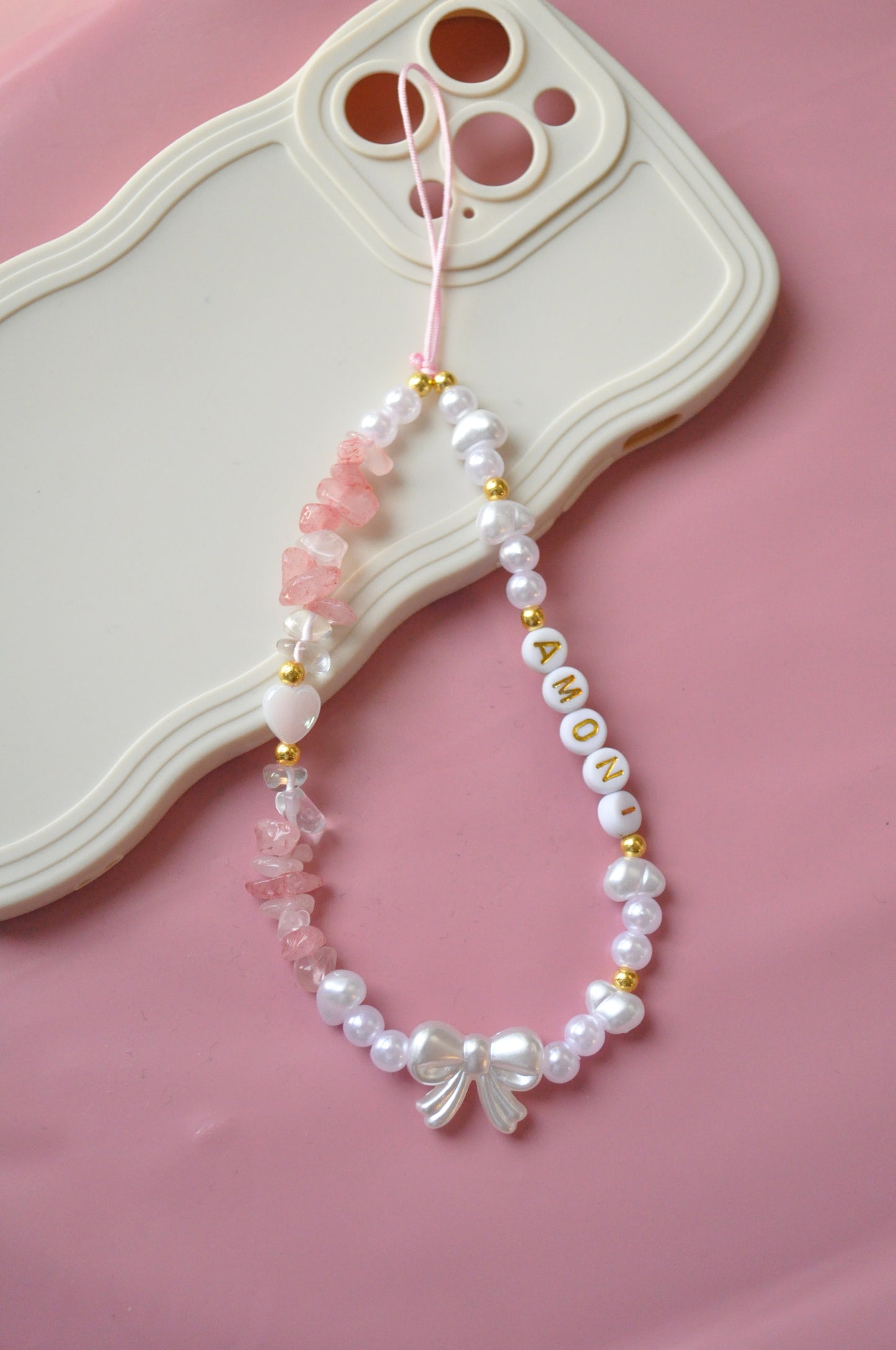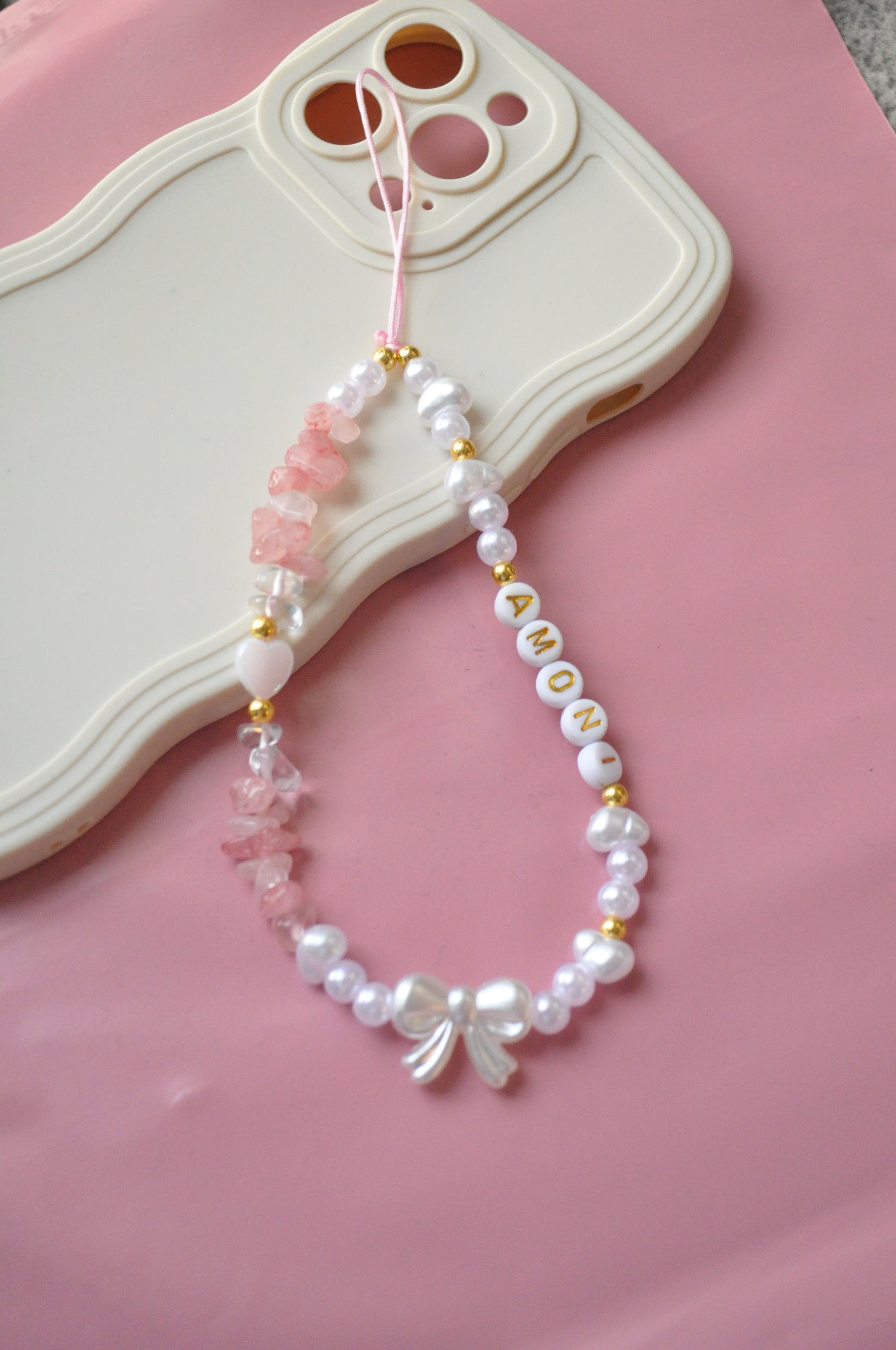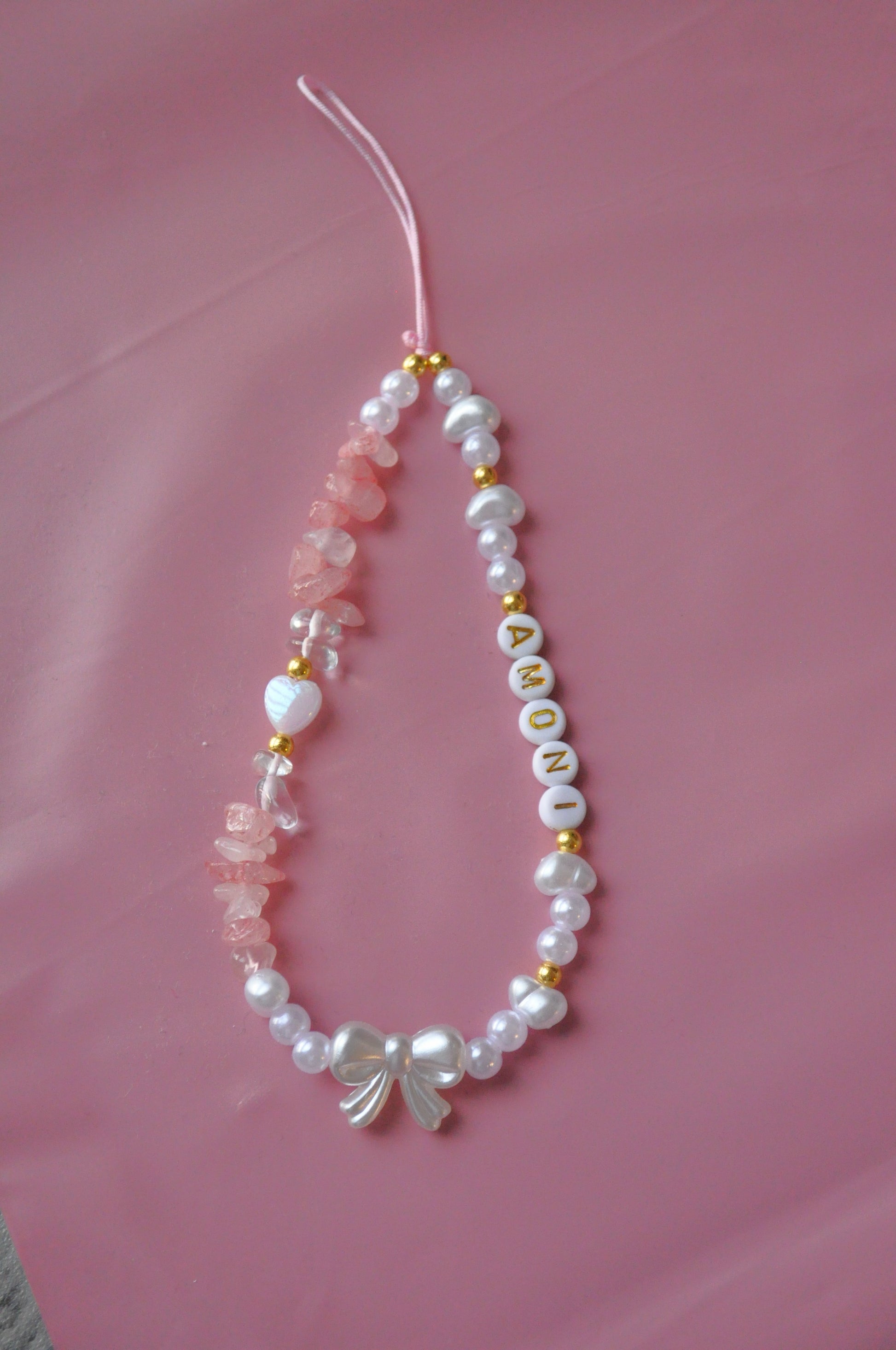 Add elegance to your phone with this personalised charm, featuring a bow bead, faux pearls, and gemstones: rose quartz, aquamarine, amethyst, and amazonite.