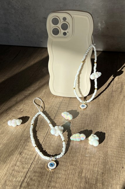 Enhance your phone’s look with our handmade Cloud Bead Phone Strap. Designed with a standout chunky cloud bead, sleek white glass seed beads, and a meaningful Evil Eye pendant, this strap is both stylish and functional. Its durable design ensures everyday reliability, while the unique charm adds a touch of individuality. A beautiful accessory for yourself or a thoughtful gift!