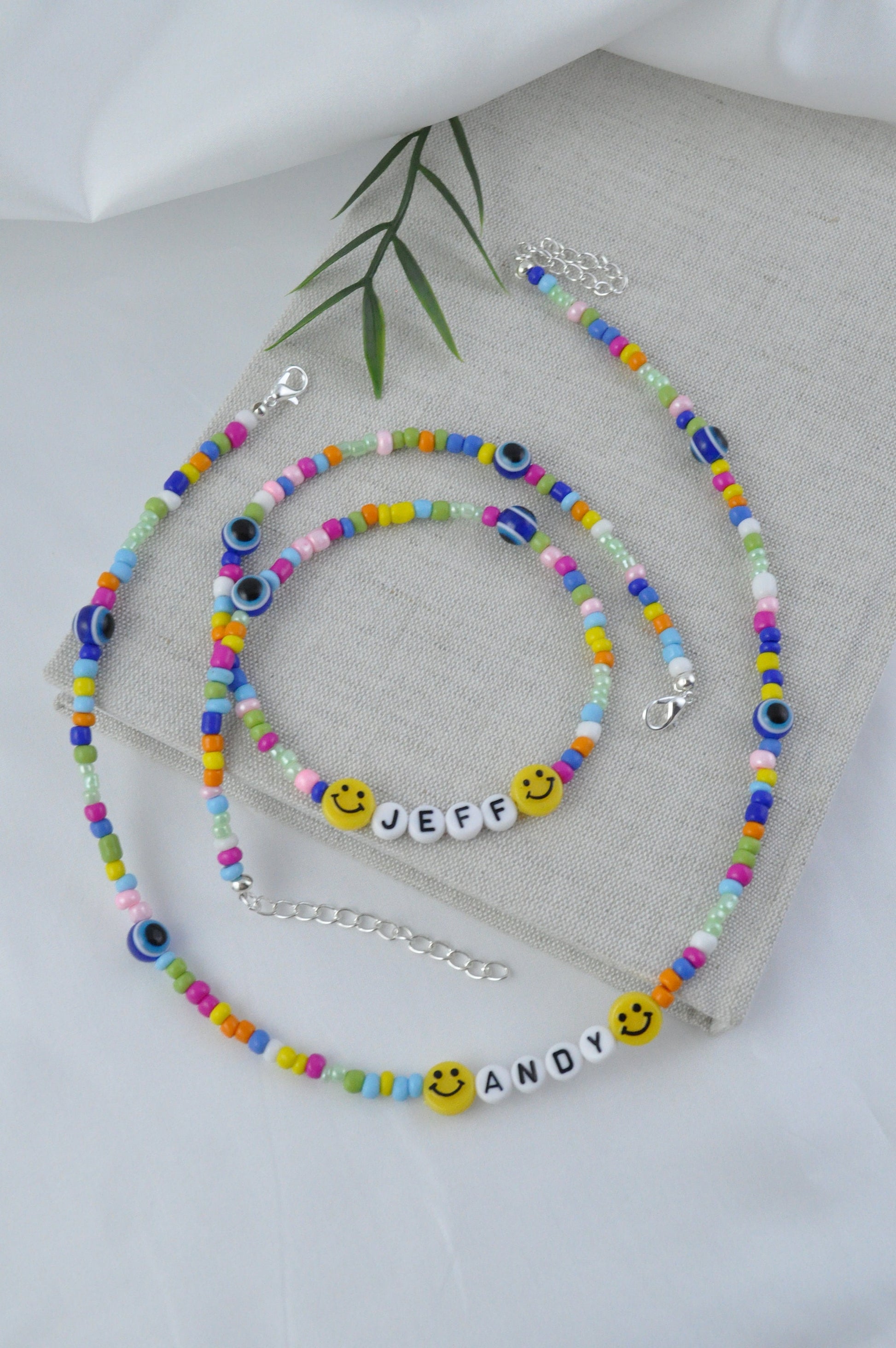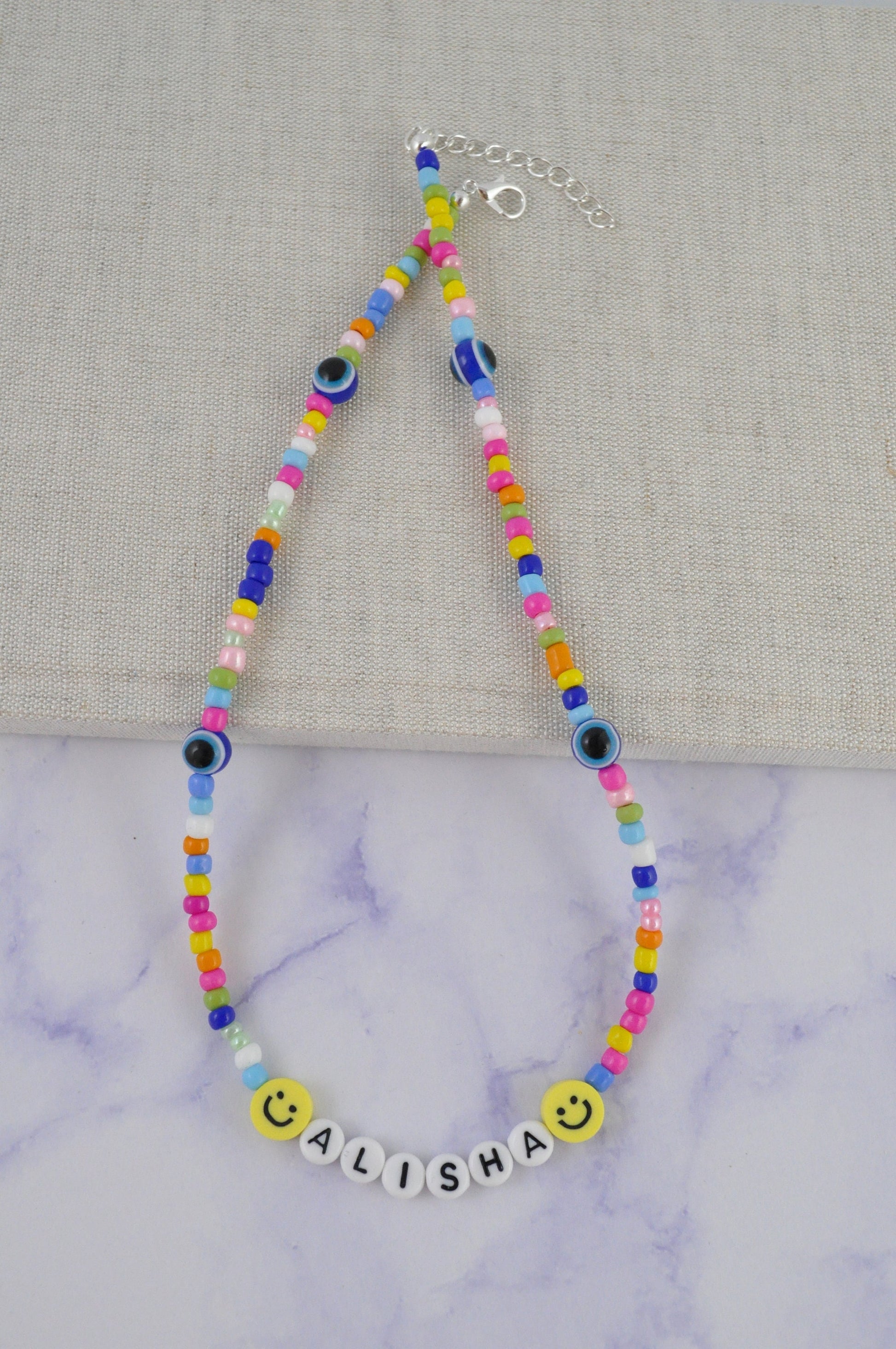 Our personalised beaded necklace features smiley beads, glass seed beads, and evil eye beads for a unique, stylish look. Customisable with your initials or a short message, this high-quality necklace offers protection and adds a pop of colour to any outfit. Adjustable to fit various neck sizes, it’s perfect for any occasion.