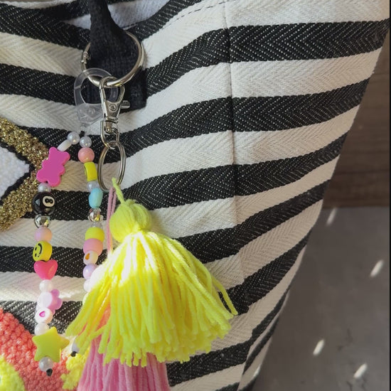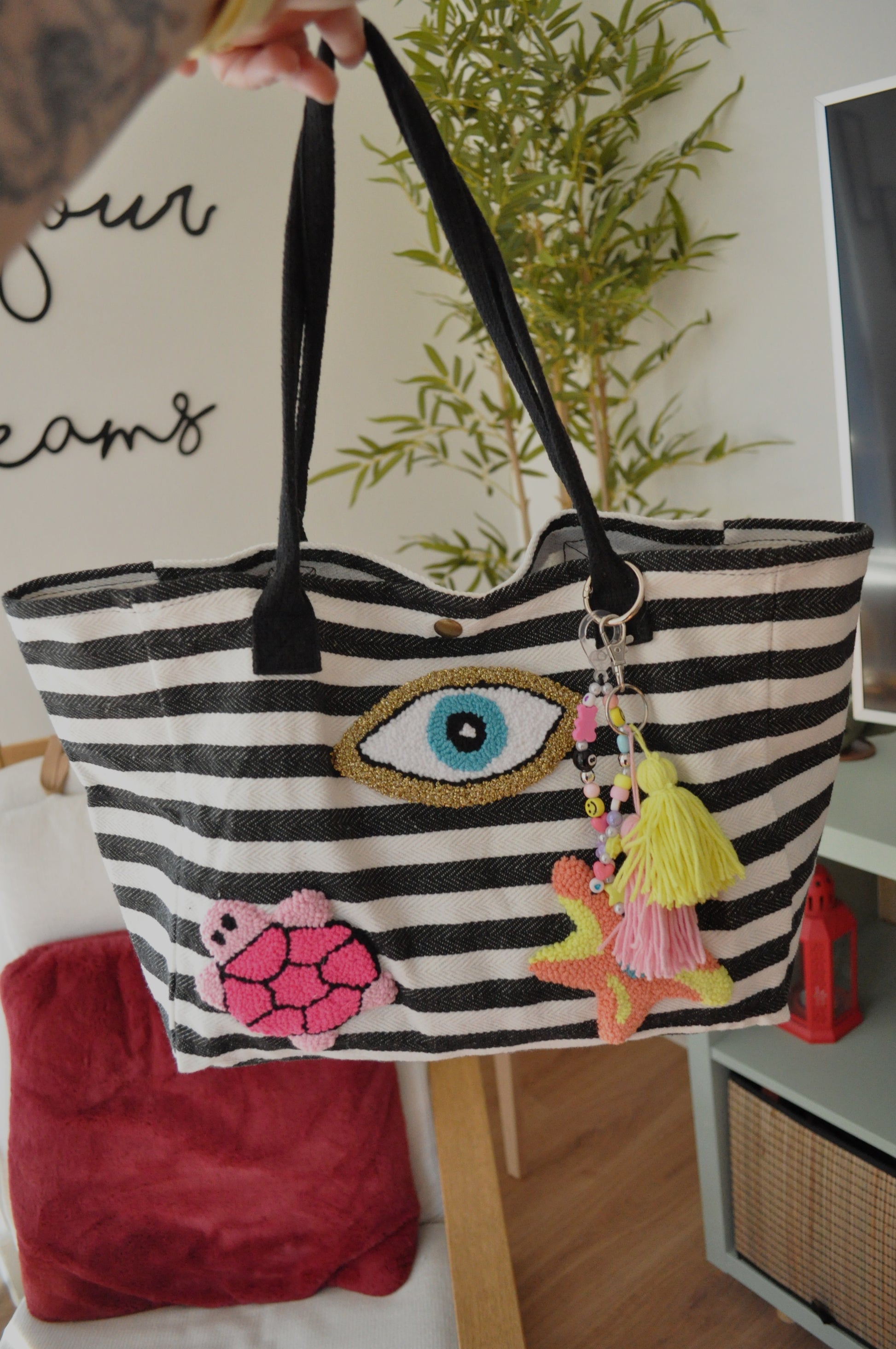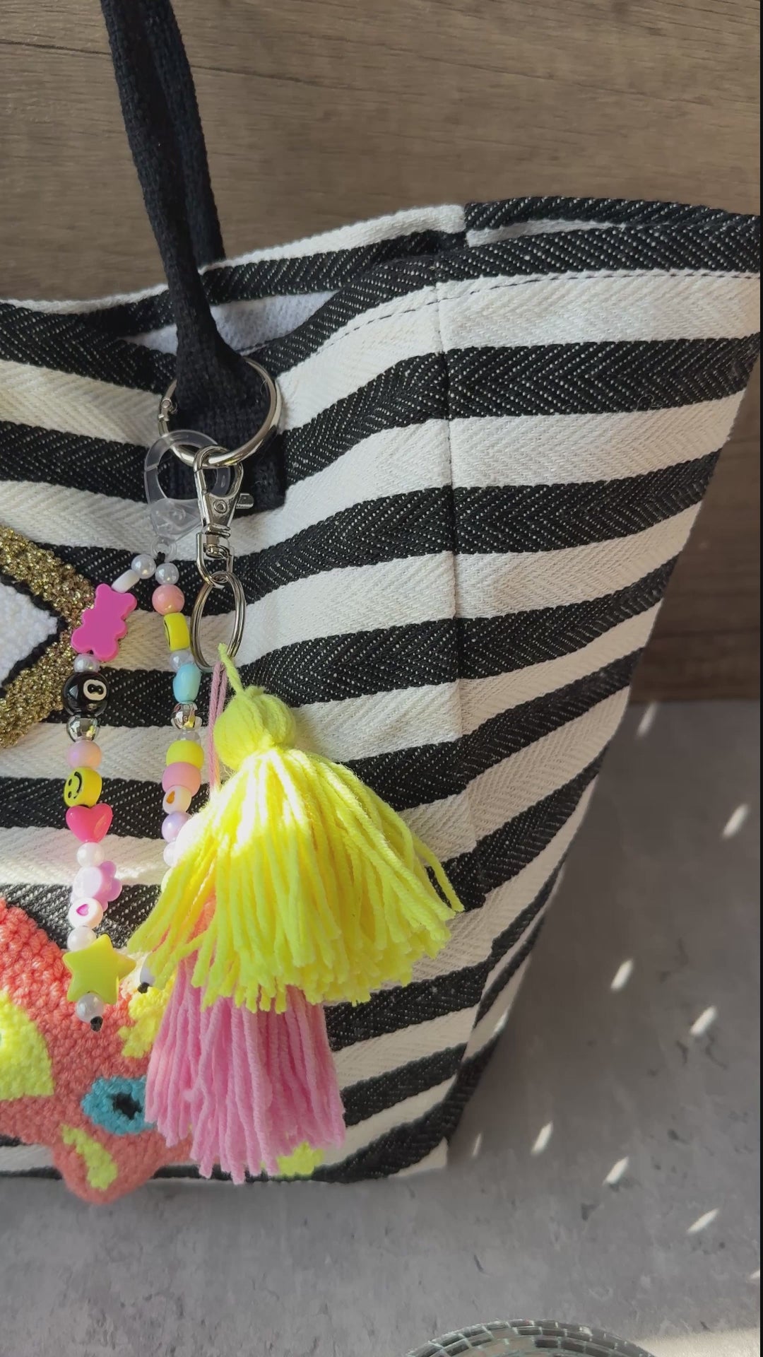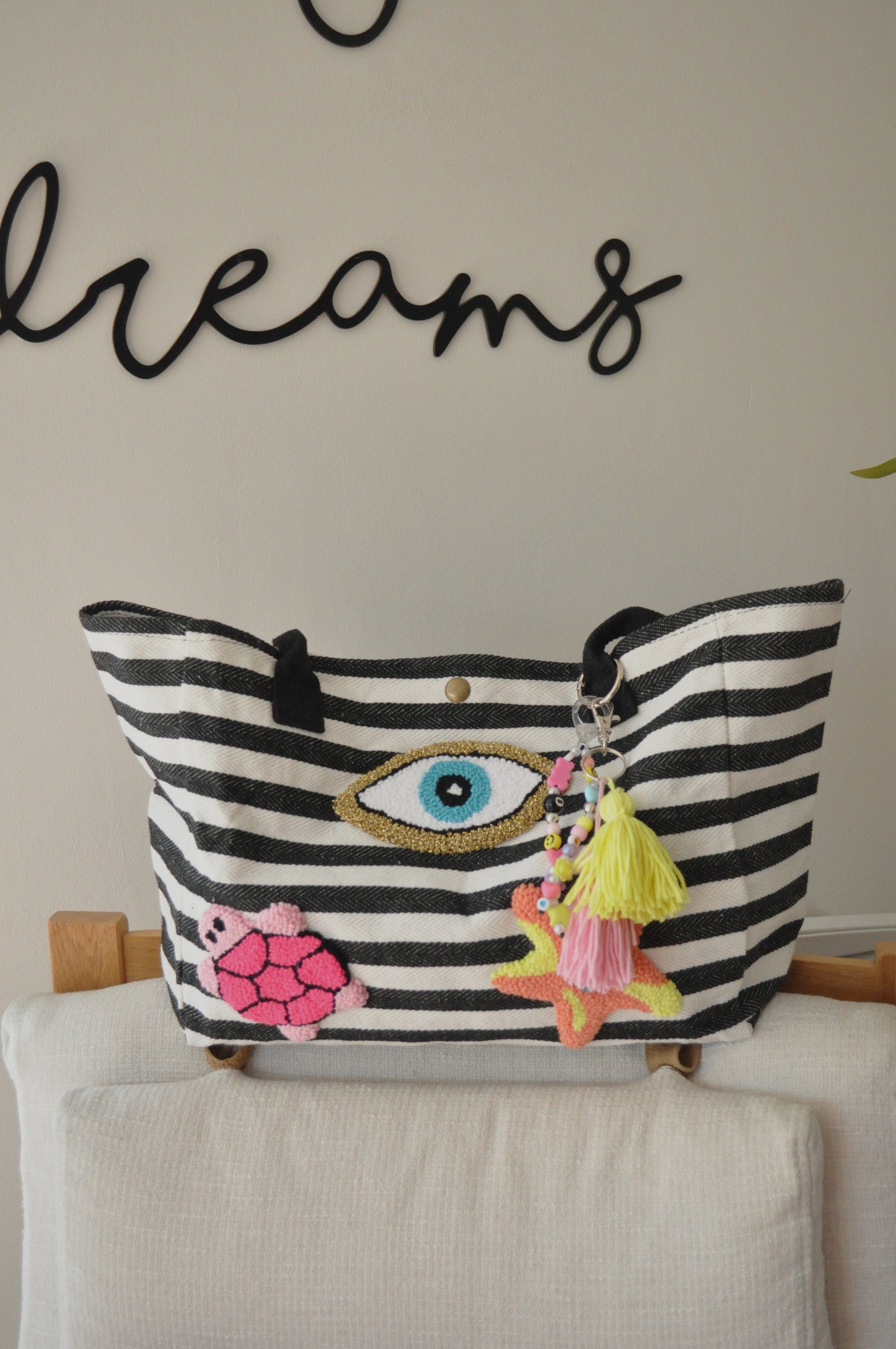 Make a bold, playful statement with this handmade striped tote bag featuring punch needle art—a blue eye, pink turtle, and starfish. Comes with a colourful tassel and beaded bag charm for extra personality. Spacious, soft-structured and lightweight, it’s perfect for beach days, market strolls or travel. Spot clean only.
