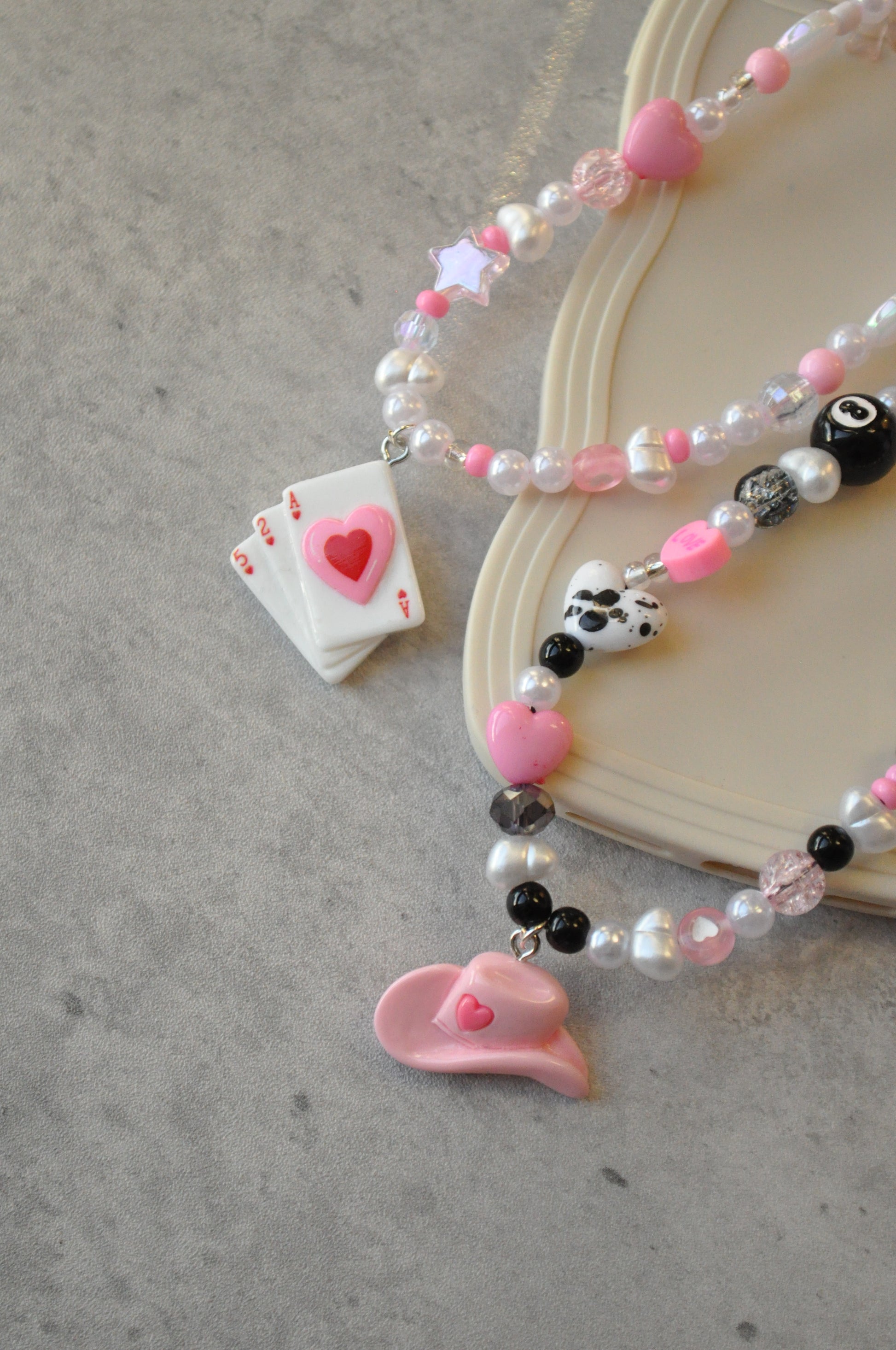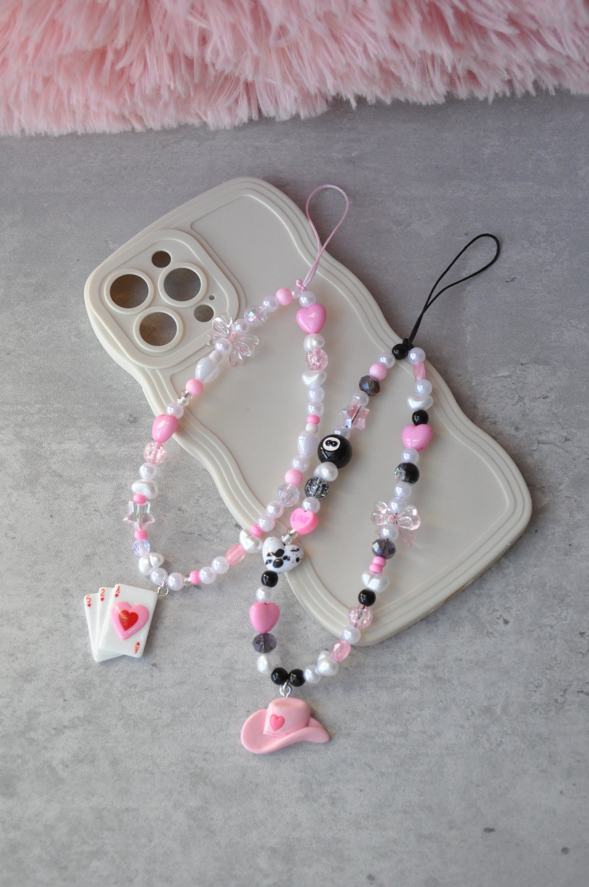 Add a playful Western twist to your accessories with these pink cowboy-themed personalised beaded phone charms! Choose between adorable cowboy hat or playing card pendants, paired with soft pink, pearl, and heart beads for a girly touch. Customisable with your favourite colour combinations, each charm is handmade with high-quality beads, making it the perfect blend of fun and style. A cute way to keep your phone secure while making a statement – ideal for gifting or treating yourself!