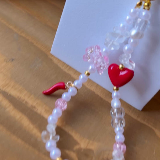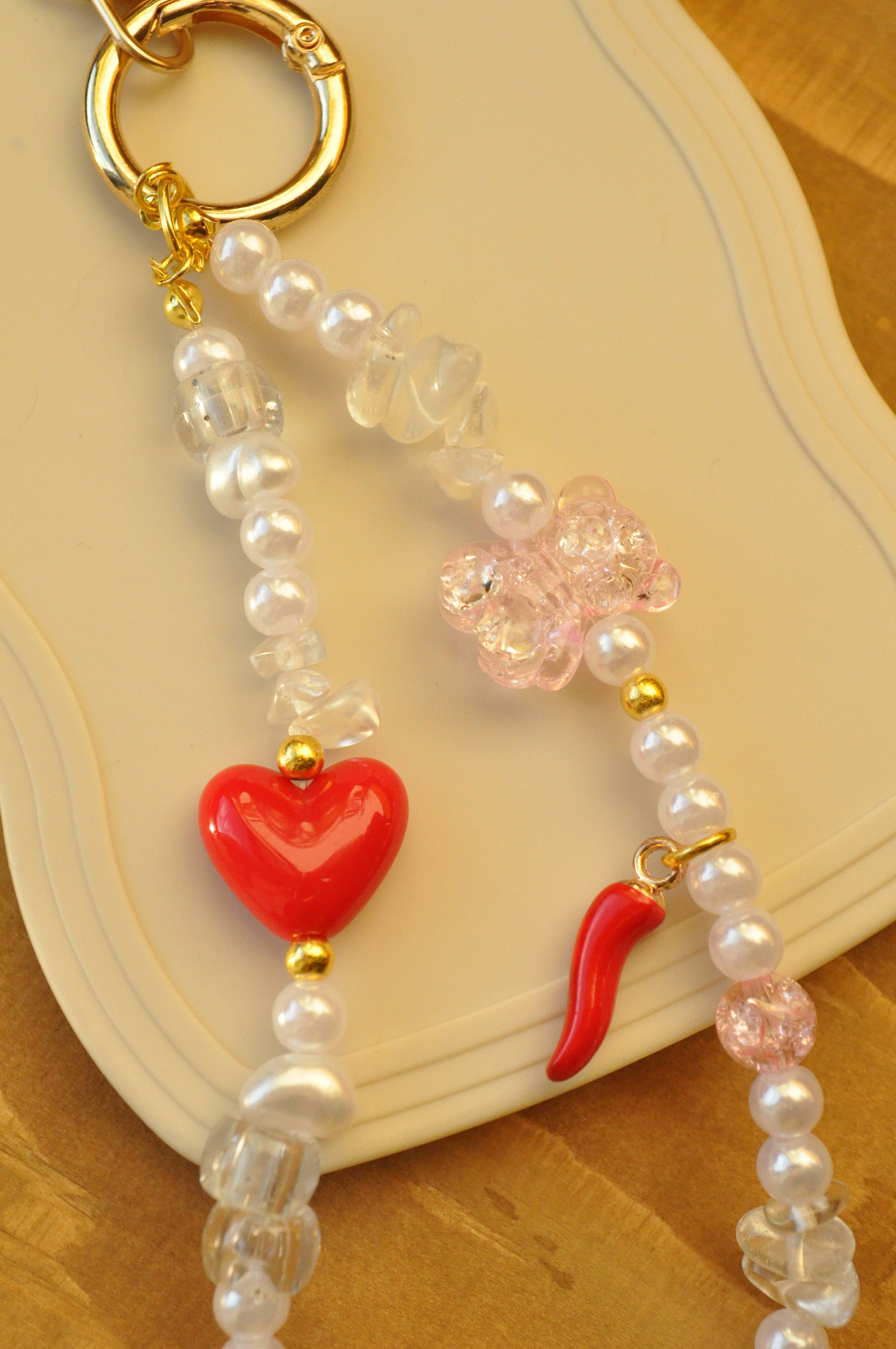 Bring some colour and character to your everyday accessories with this handmade beaded charm. Designed with clear quartz chips, pearl-style beads, pink accents, a cute pink teddy bead, a glossy red heart bead, and a tiny chilli pepper charm, it strikes the perfect balance between sweet and playful.