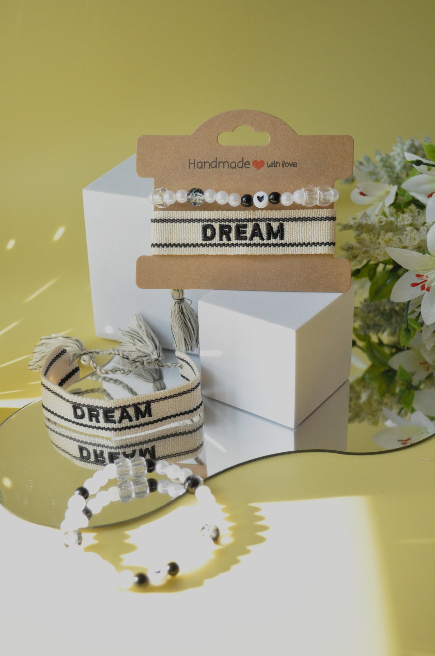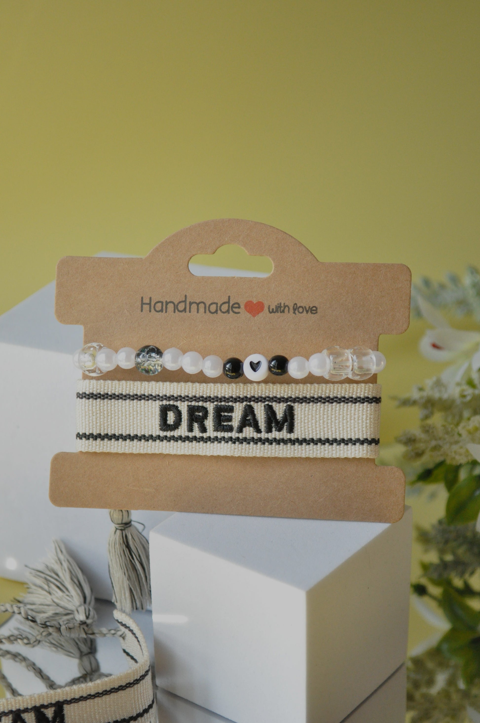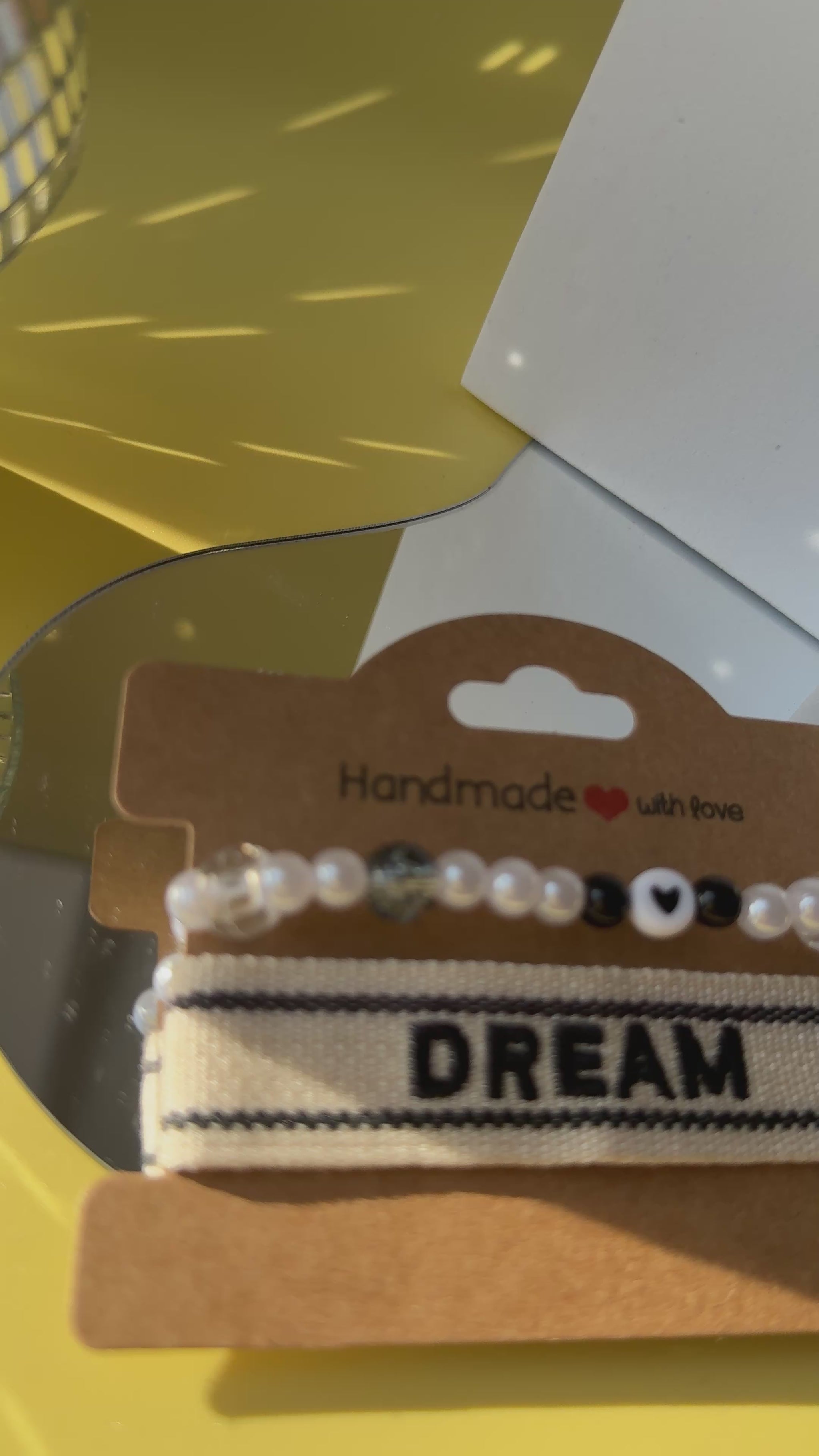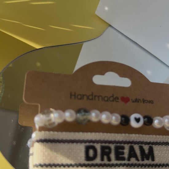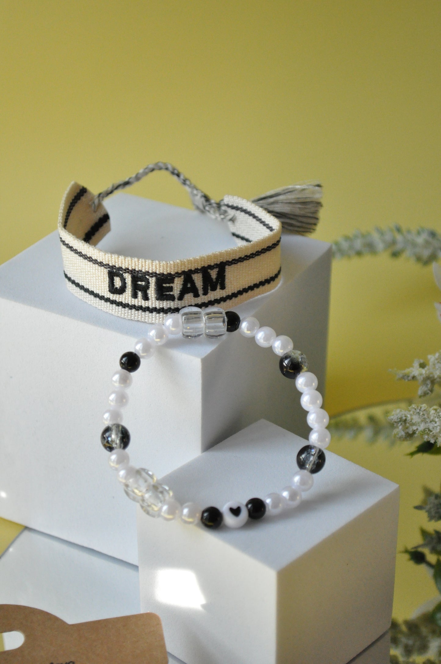 A chic cream and black braided bracelet paired with a pearl and black beaded bracelet for a sleek, timeless stack. Perfect for dressing up or down.