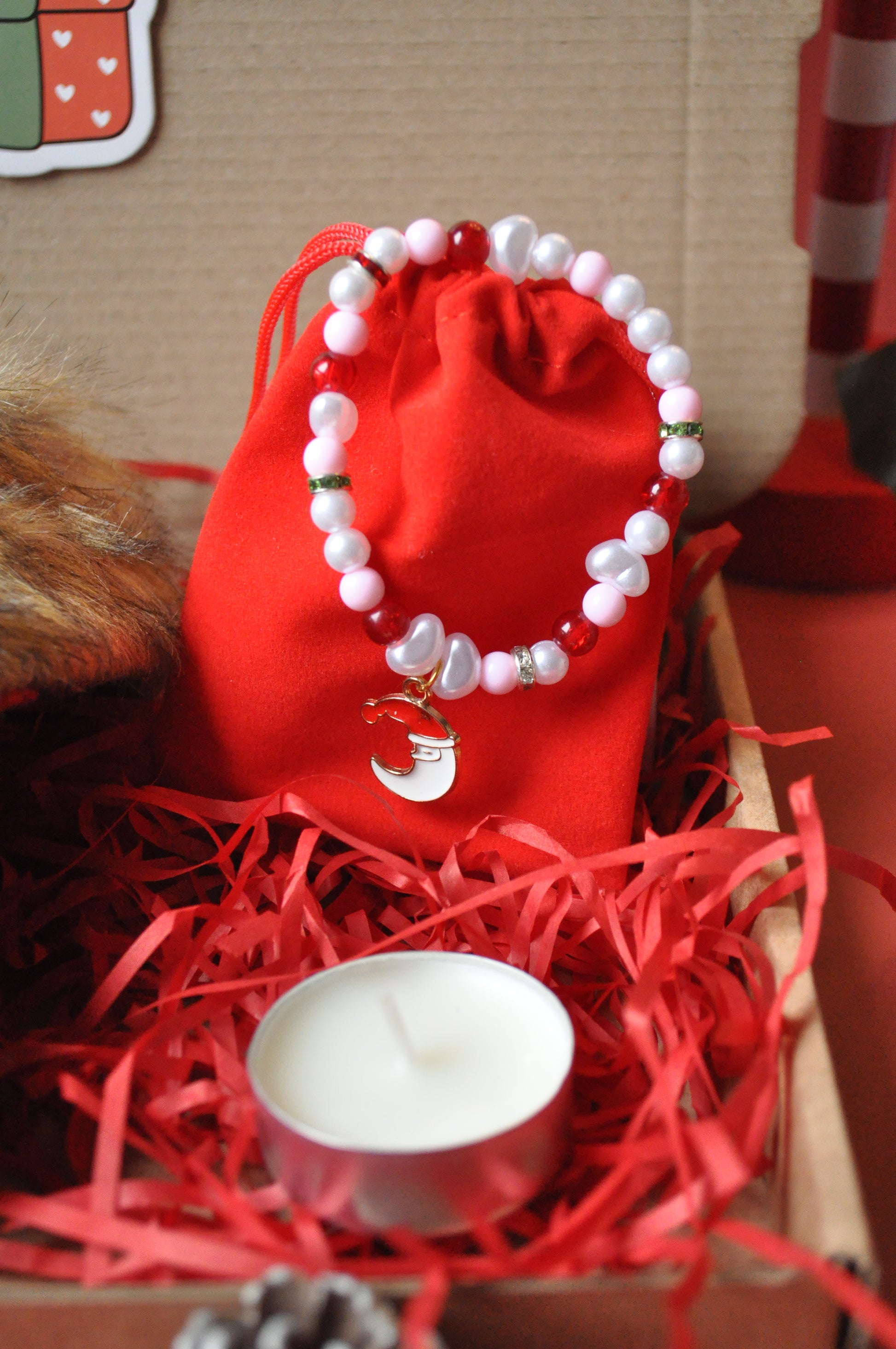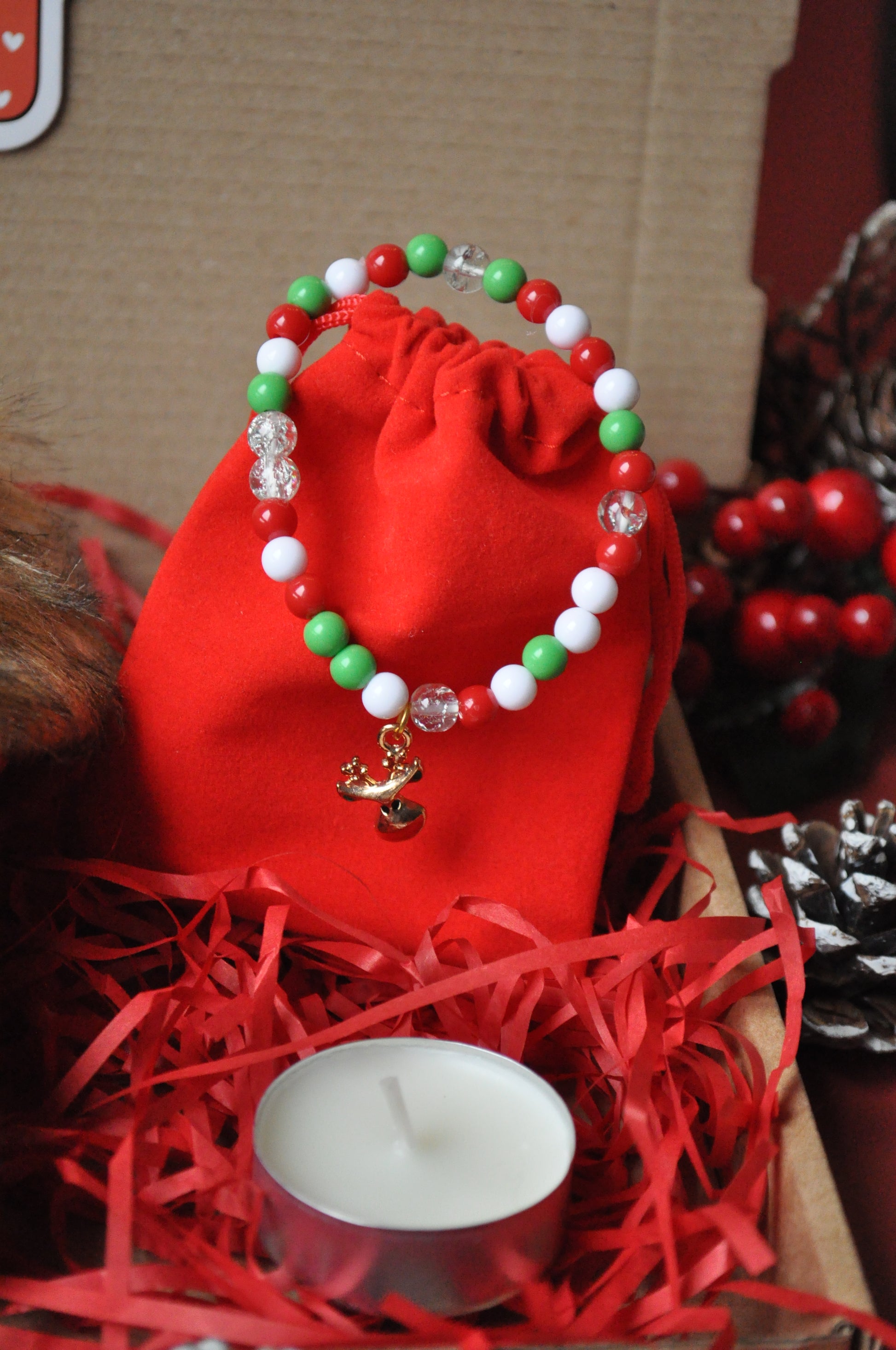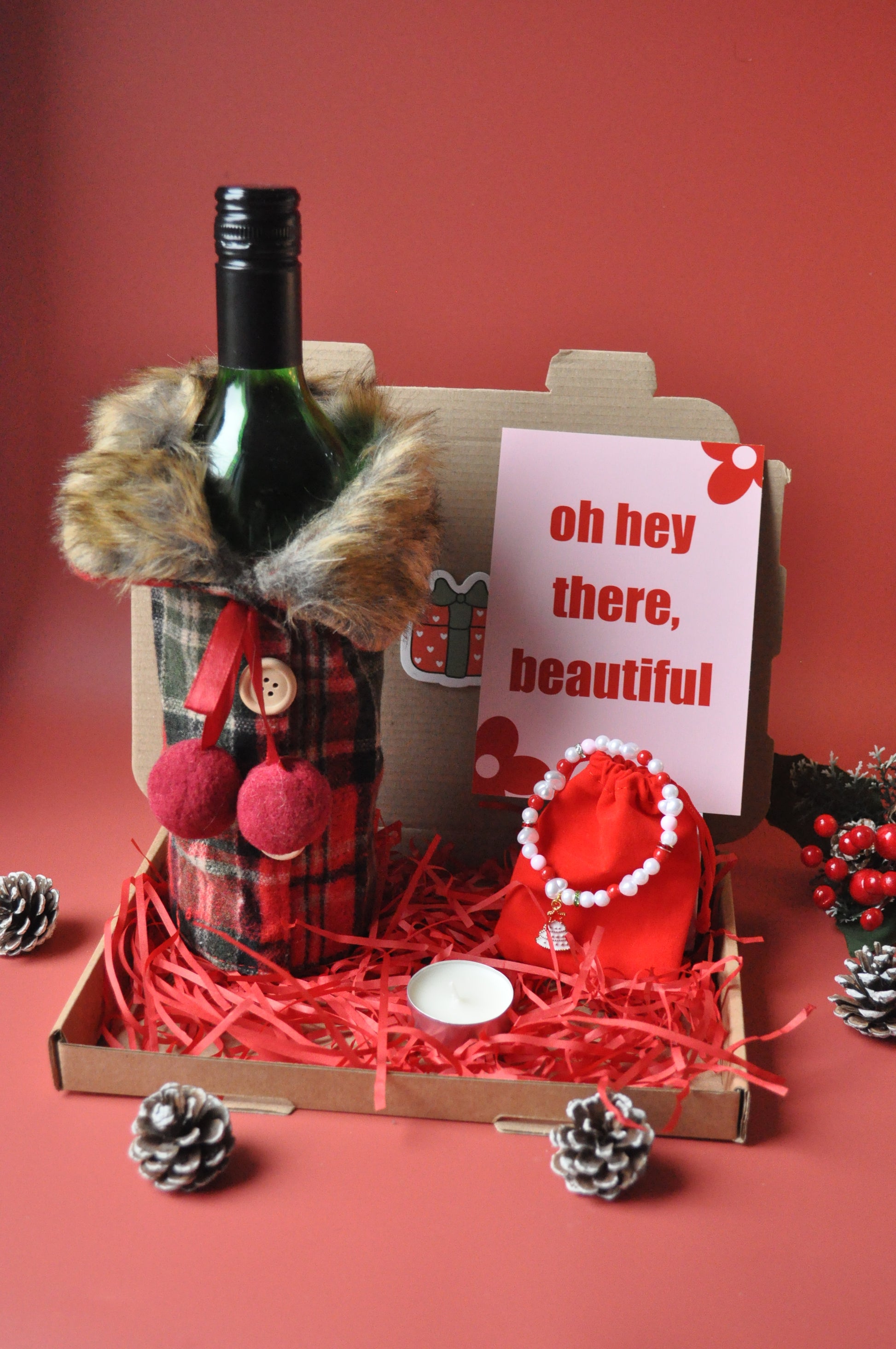 Celebrate the festive season with this charming gift set, perfect for holiday gatherings and thoughtful gifting. The set includes a cosy plaid wine bottle wrap adorned with faux fur and a decorative bottle necklace (which doubles as a stretch bracelet). Enjoy the warm ambience of a scented tealight, all presented in festive packaging. Choose from two bracelet options – a classic red and green theme or a playful pink and red design. Ideal for spreading Christmas cheer!
