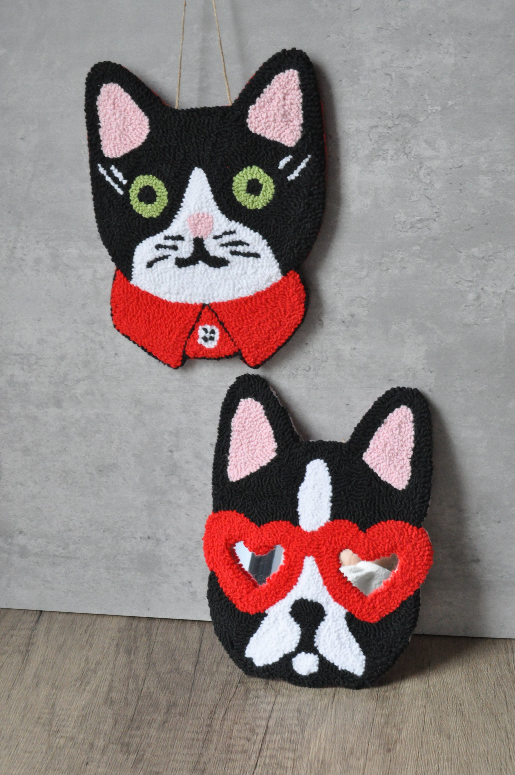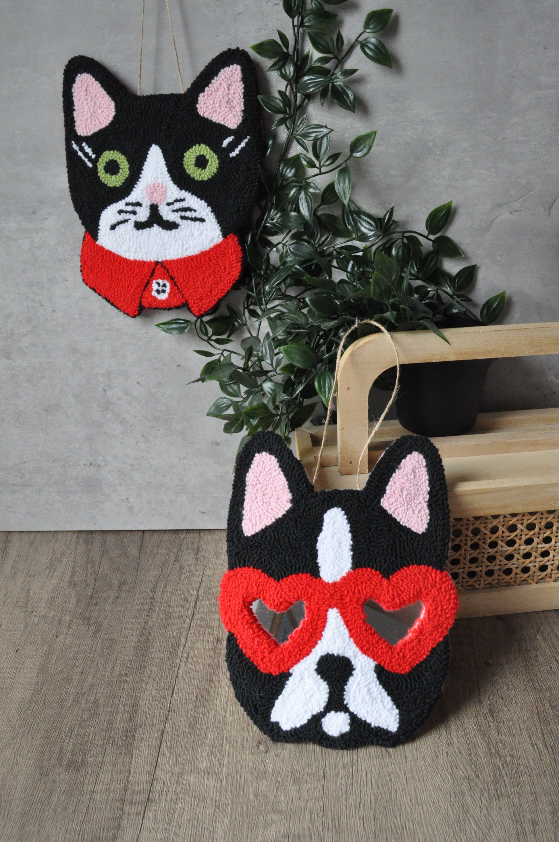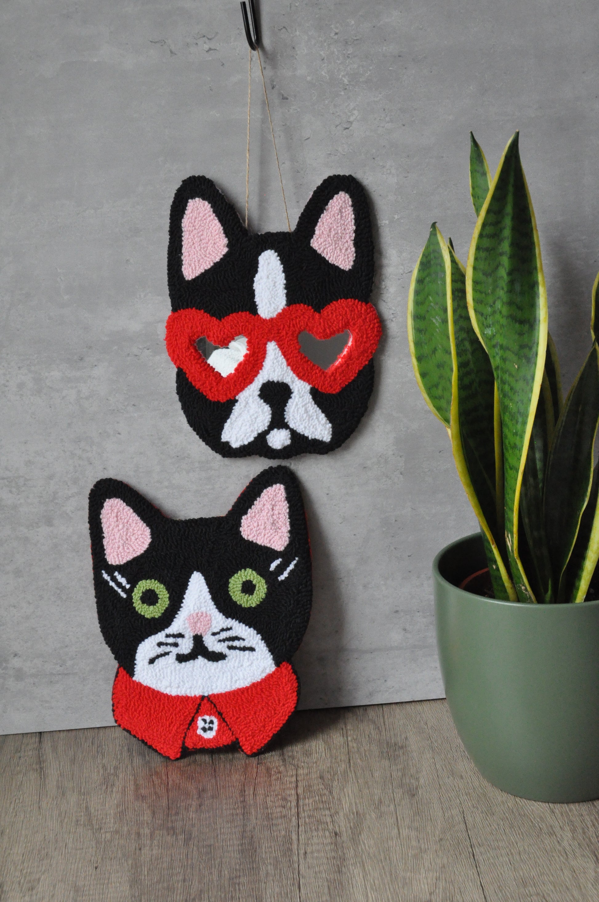 "Funkie Frenchie & Elegant Whiskers Punch Needle Wall Hangings" – a delightful duo to add character and charm to your living space. Opt for the playful "Funkie Frenchie," featuring a French Bulldog sporting heart-shaped red sunglasses with mirrored lenses, or choose the sophisticated "Elegant Whiskers," showcasing a black & white cat adorned with a stylish red collar and a charming button accent.
