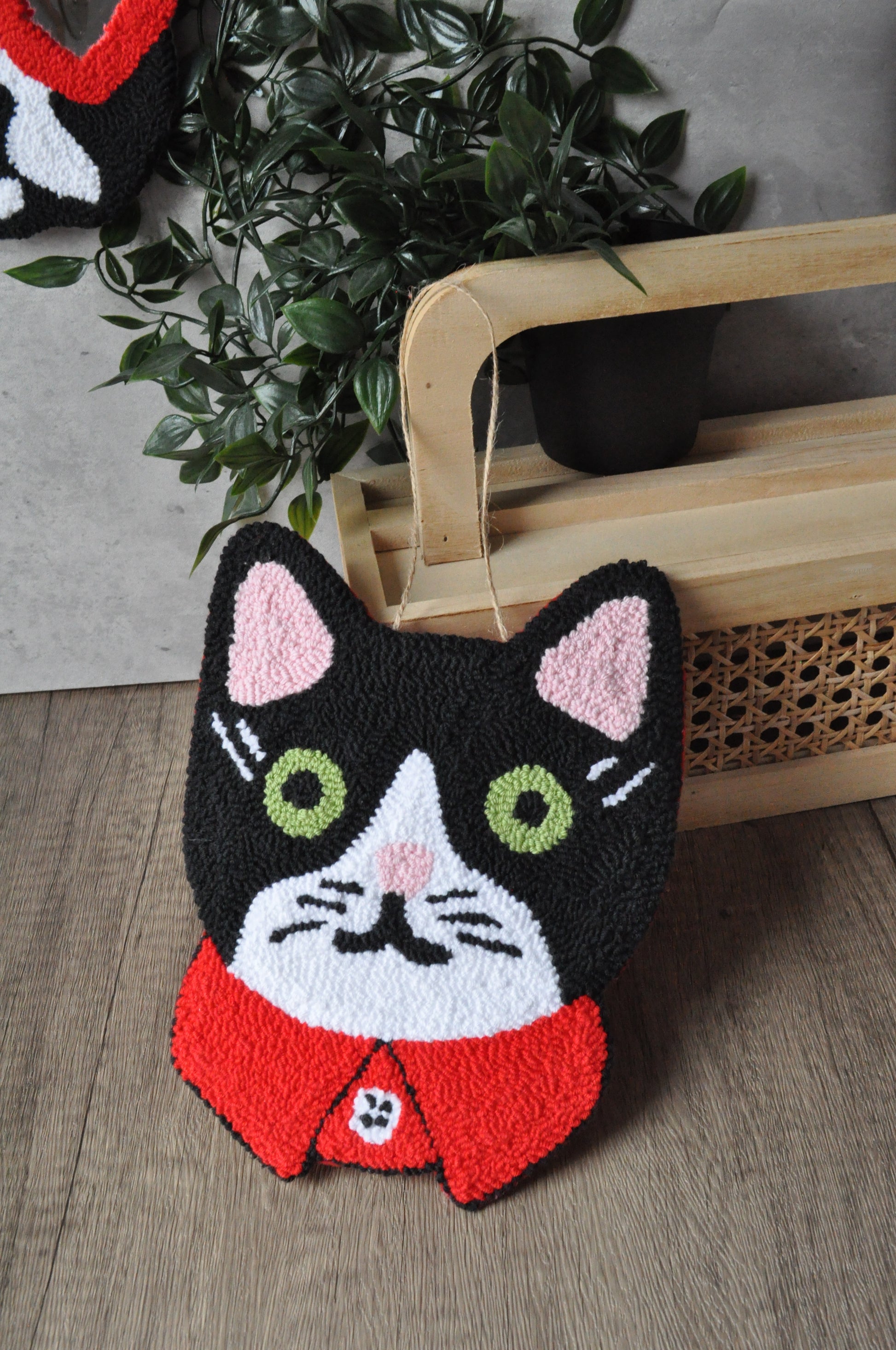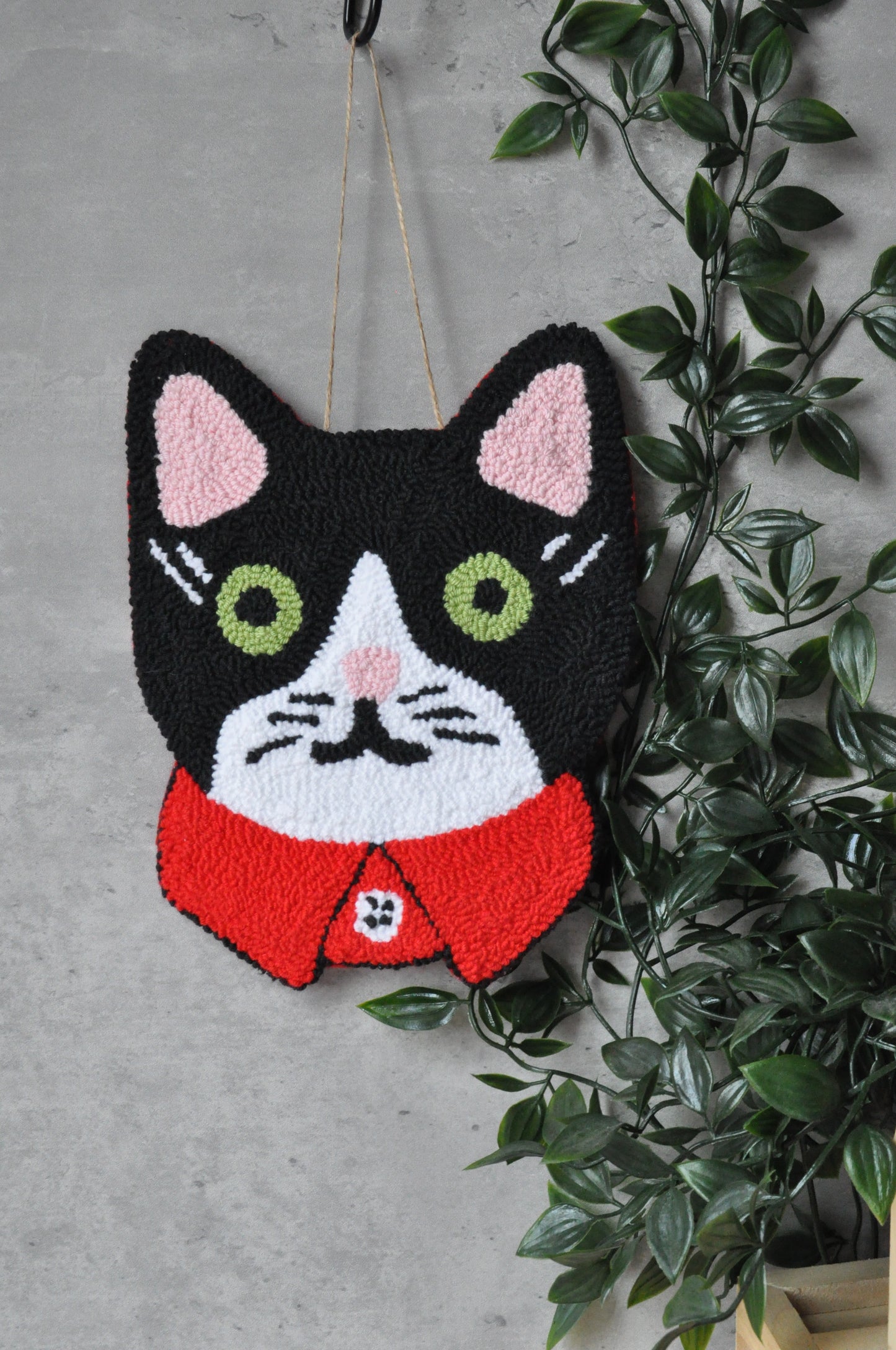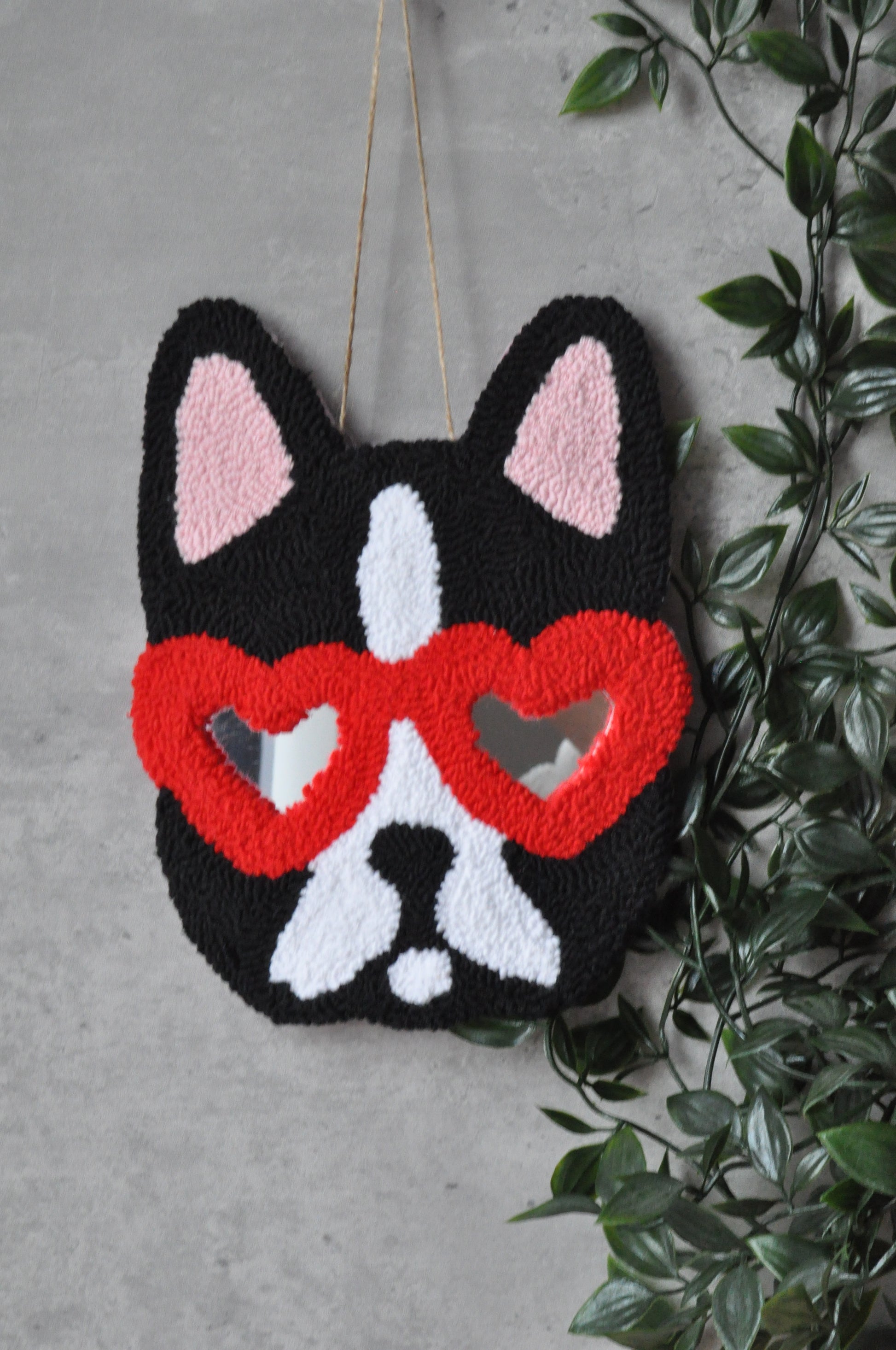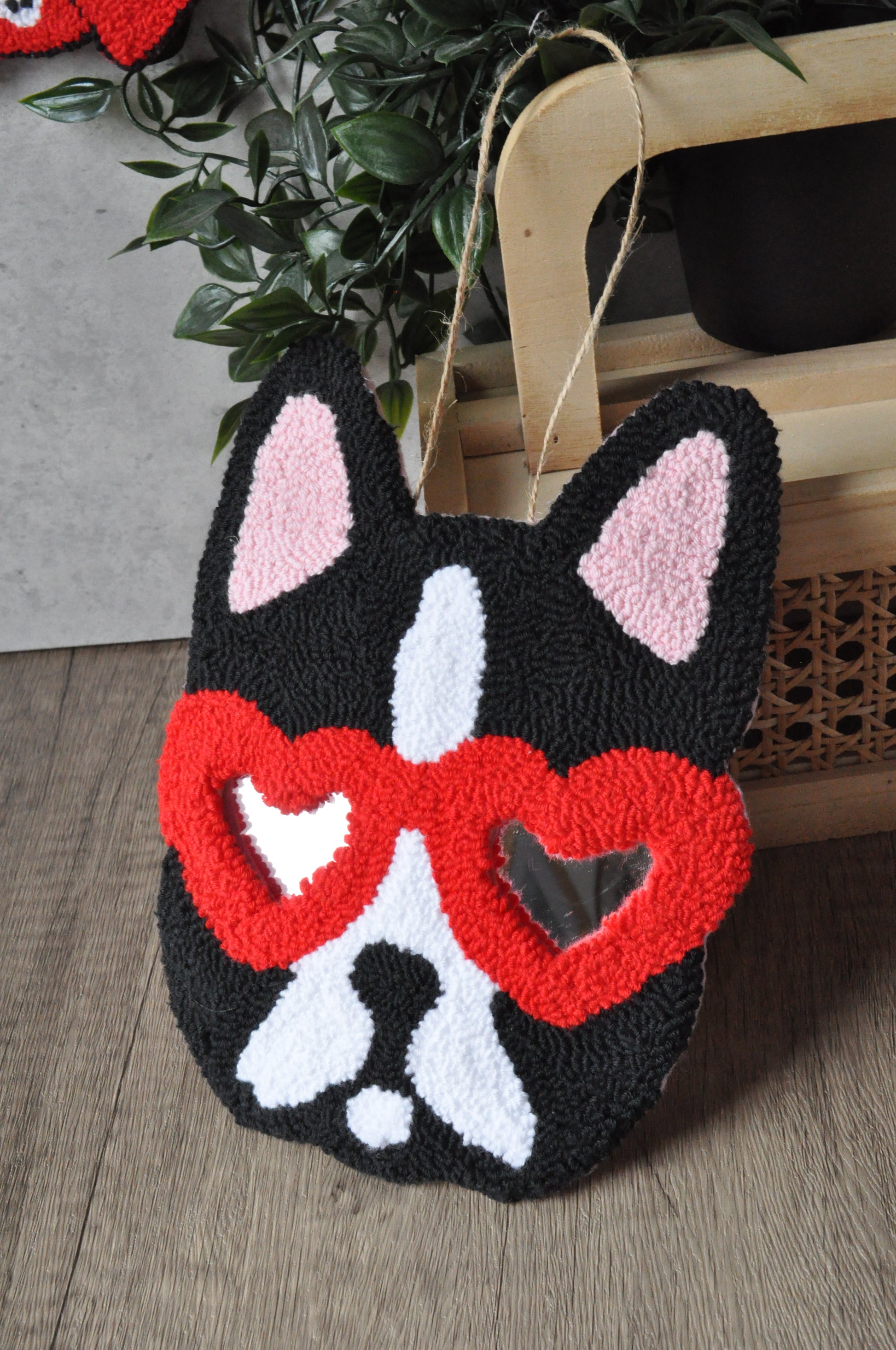 "Funkie Frenchie & Elegant Whiskers Punch Needle Wall Hangings" – a delightful duo to add character and charm to your living space. Opt for the playful "Funkie Frenchie," featuring a French Bulldog sporting heart-shaped red sunglasses with mirrored lenses, or choose the sophisticated "Elegant Whiskers," showcasing a black & white cat adorned with a stylish red collar and a charming button accent.