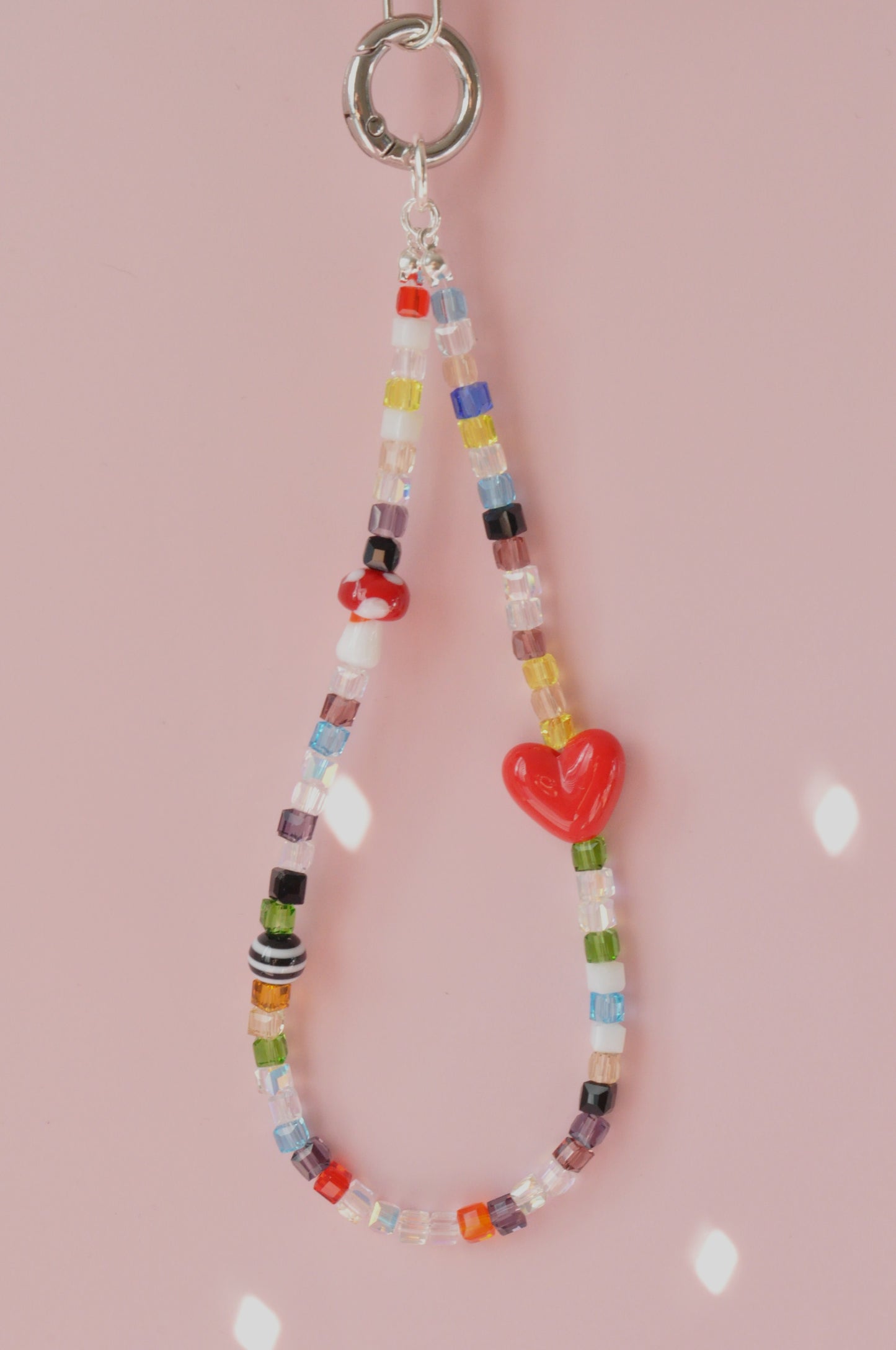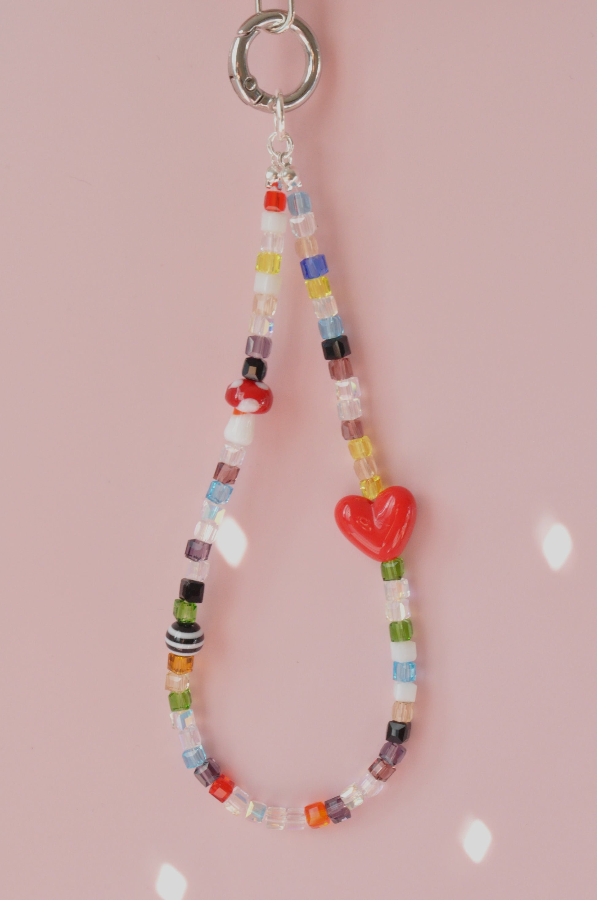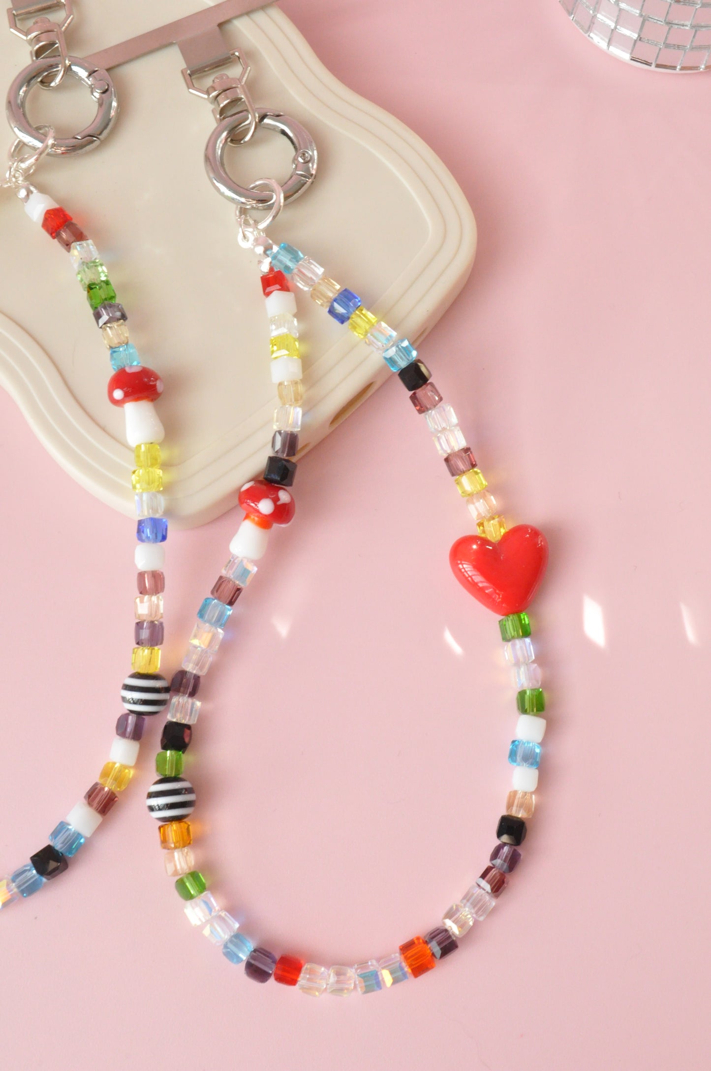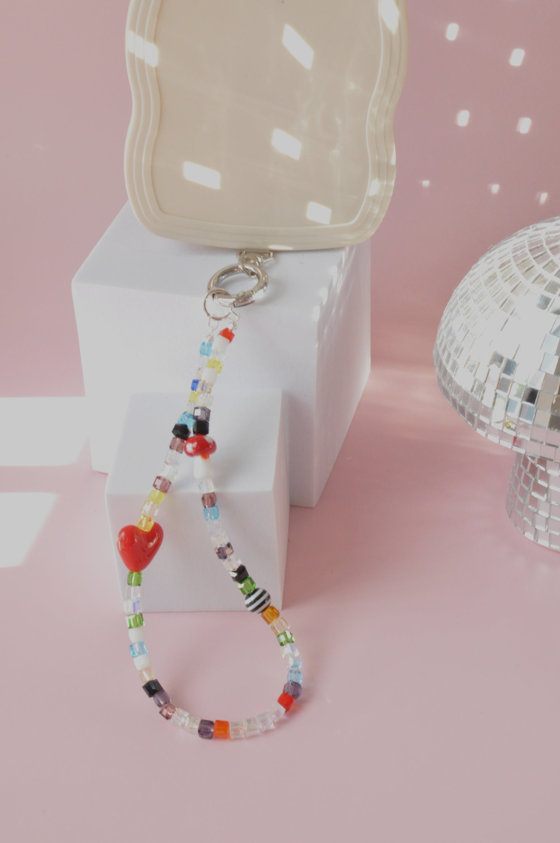 Add a pop of colour to your everyday with our handmade glass beaded phone charm. Featuring multicolour rice beads, a glass heart and a lampwork mushroom bead, this playful strap brings a nostalgic Y2K touch to your phone.