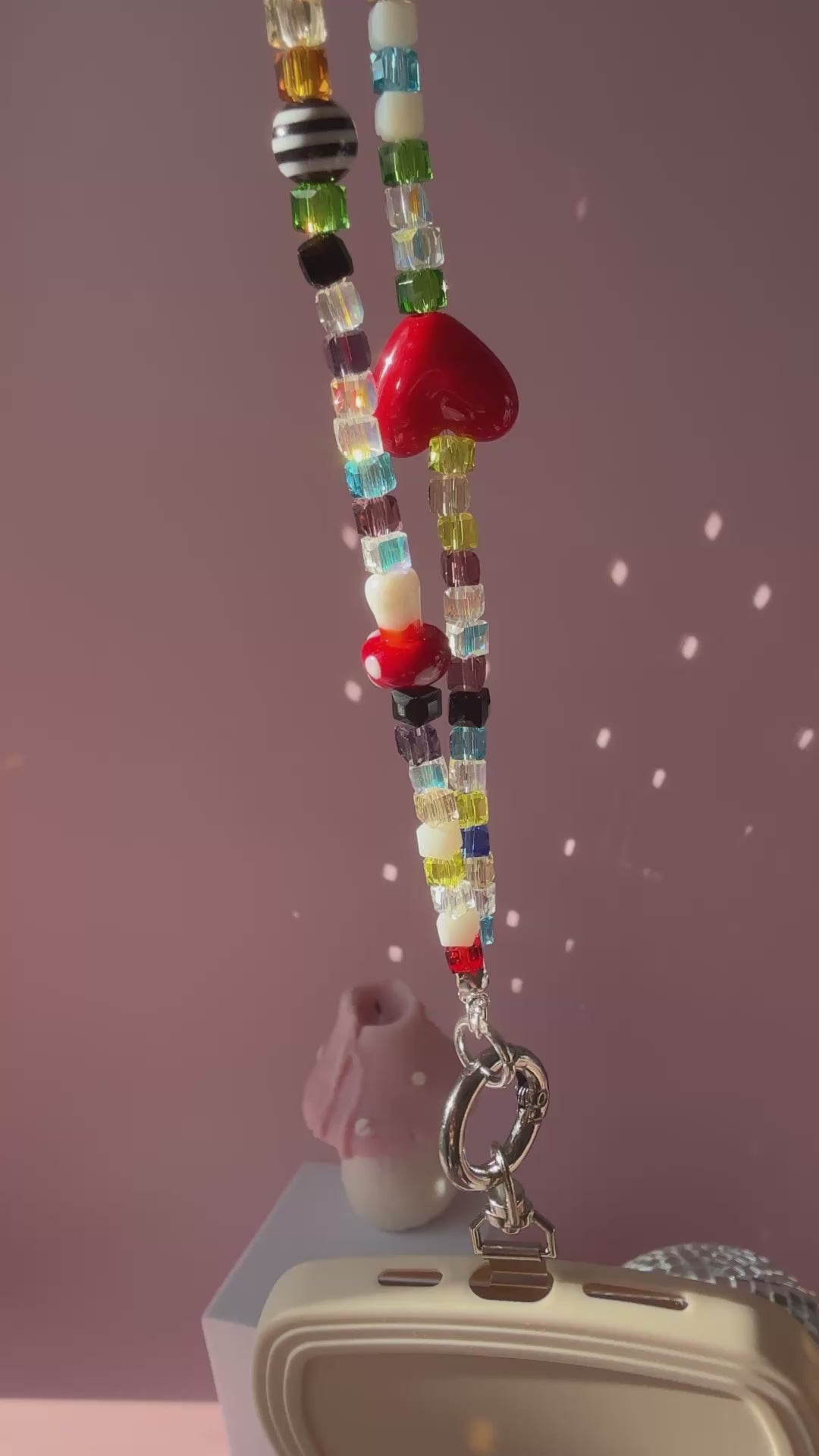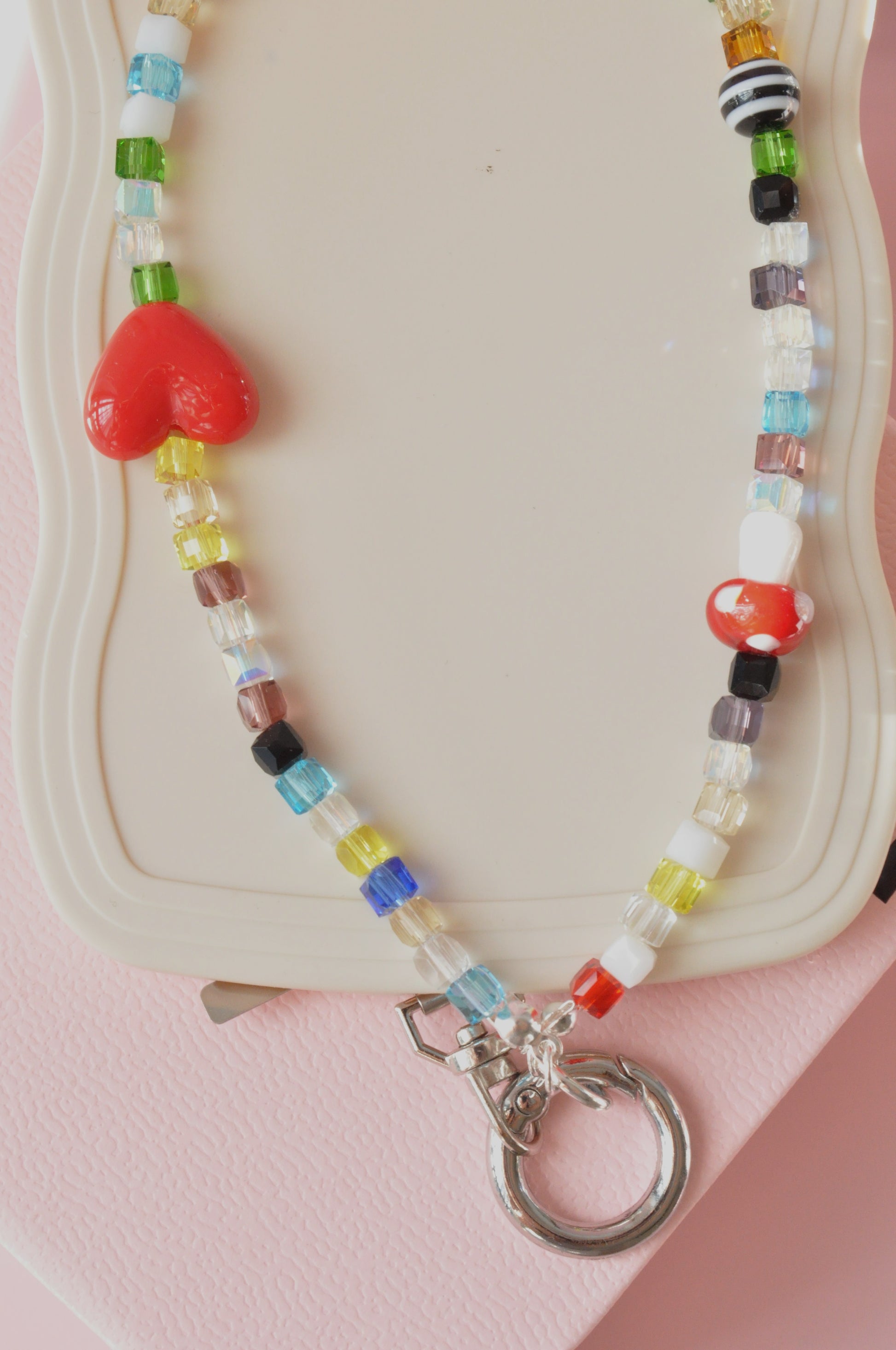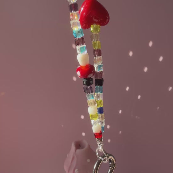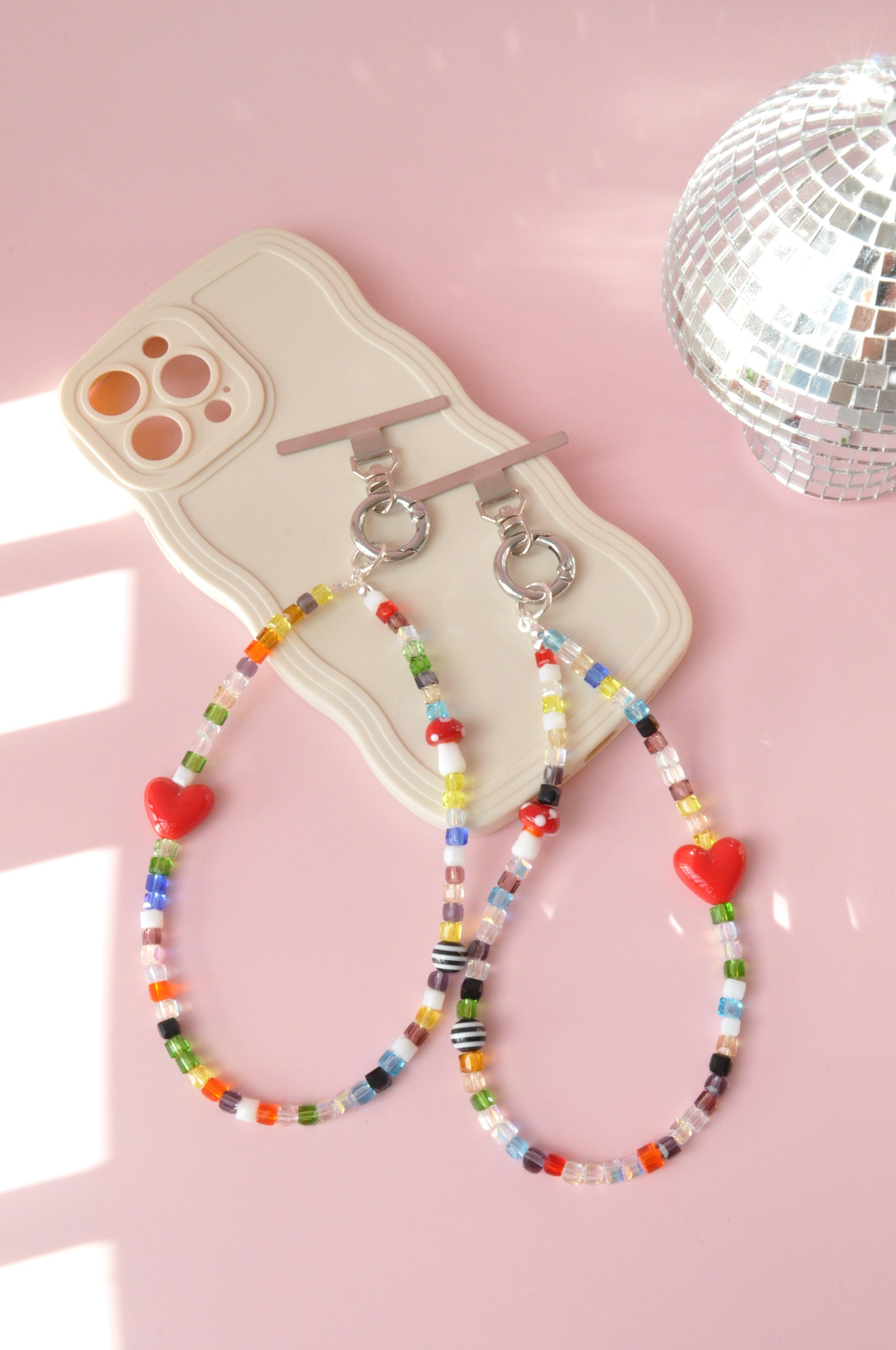 Add a pop of colour to your everyday with our handmade glass beaded phone charm. Featuring multicolour rice beads, a glass heart and a lampwork mushroom bead, this playful strap brings a nostalgic Y2K touch to your phone.