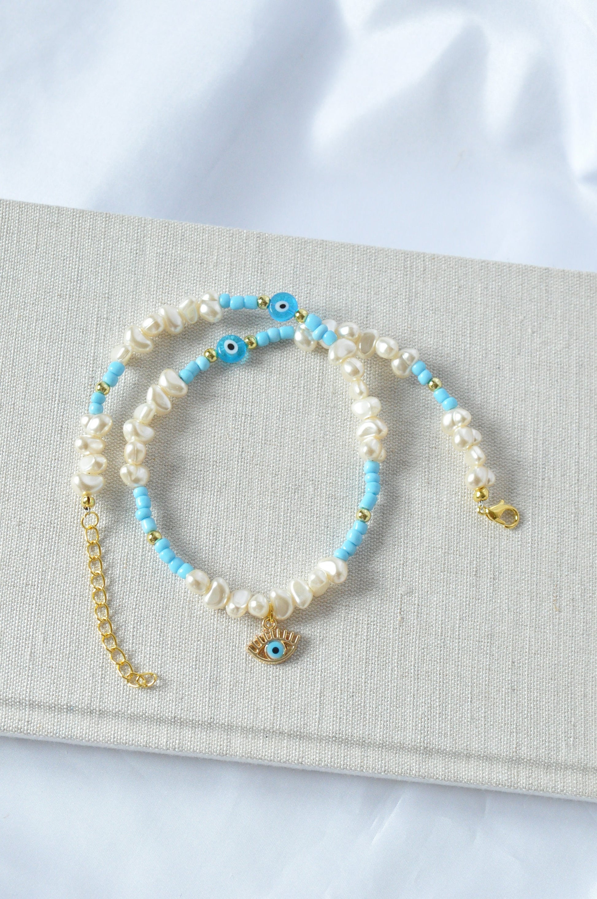Add a touch of protection to your wardrobe with this beautiful necklace. The stunning blue eye pendant is believed to ward off negativity and bring good fortune. With high-quality pearl beads and a dainty design, it's perfect for both everyday wear and special occasions. This necklace also makes a thoughtful gift for a loved one. Limited stock is available, so order today and embrace the benefits of this ancient symbol of protection!