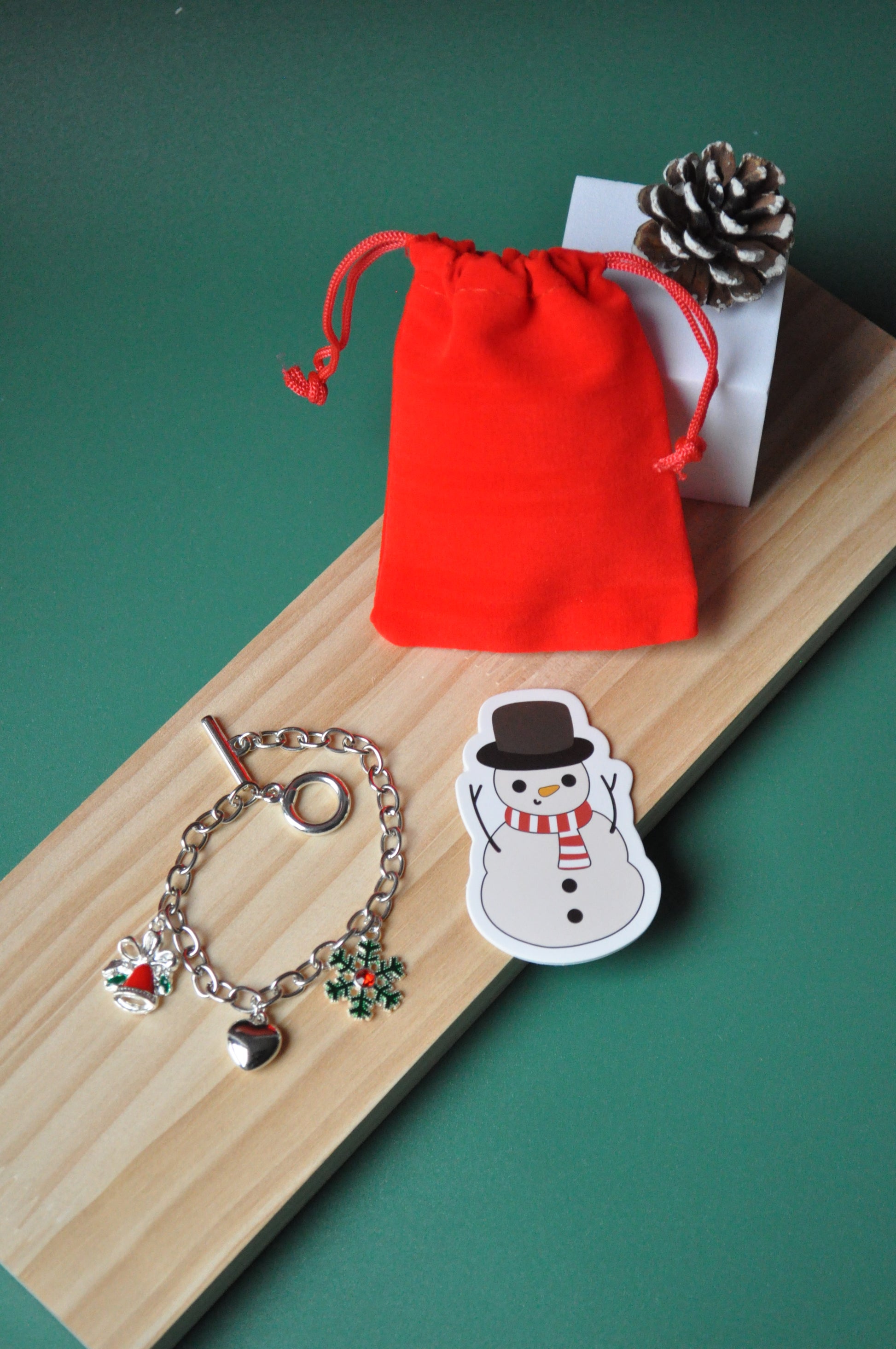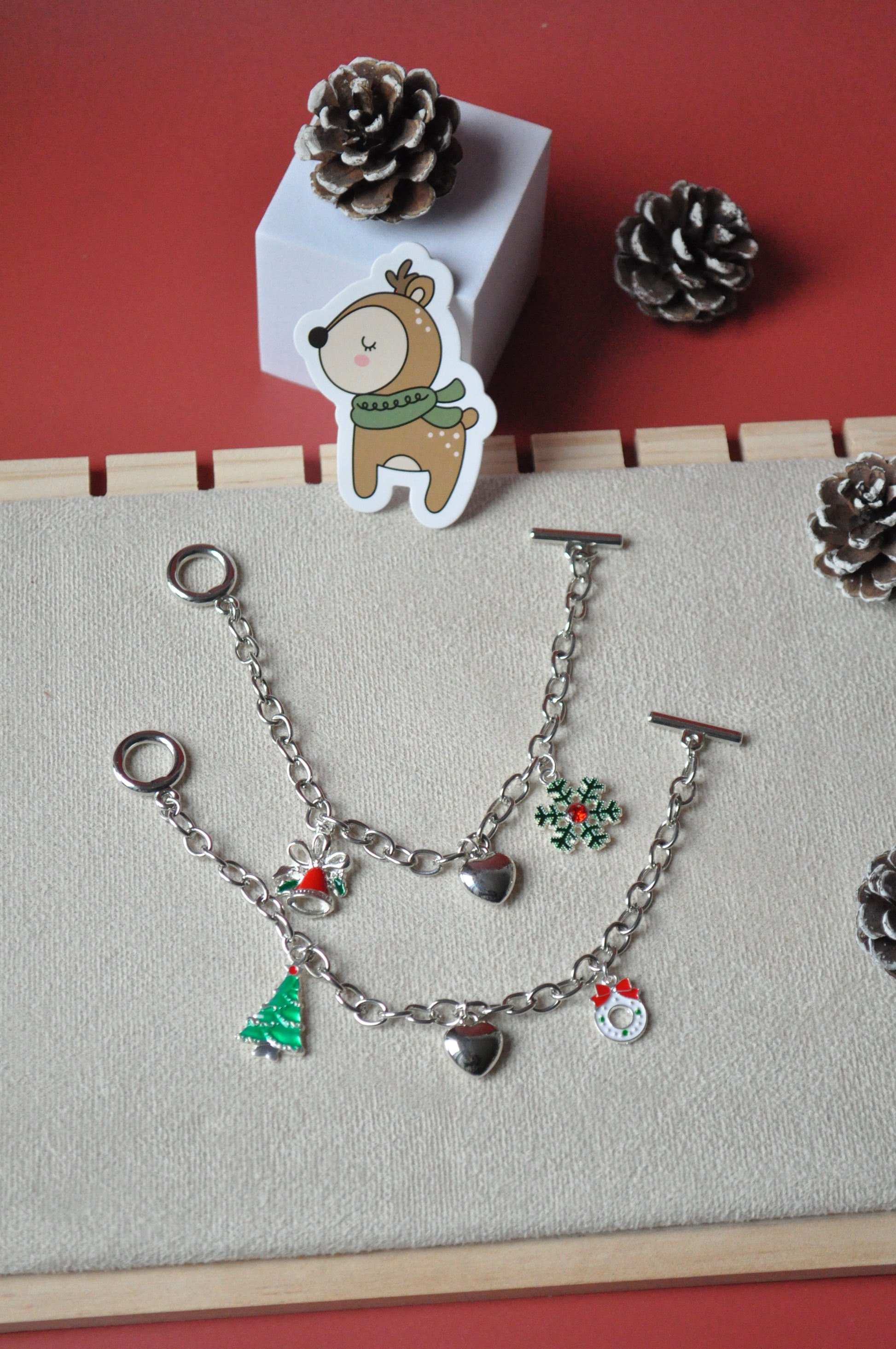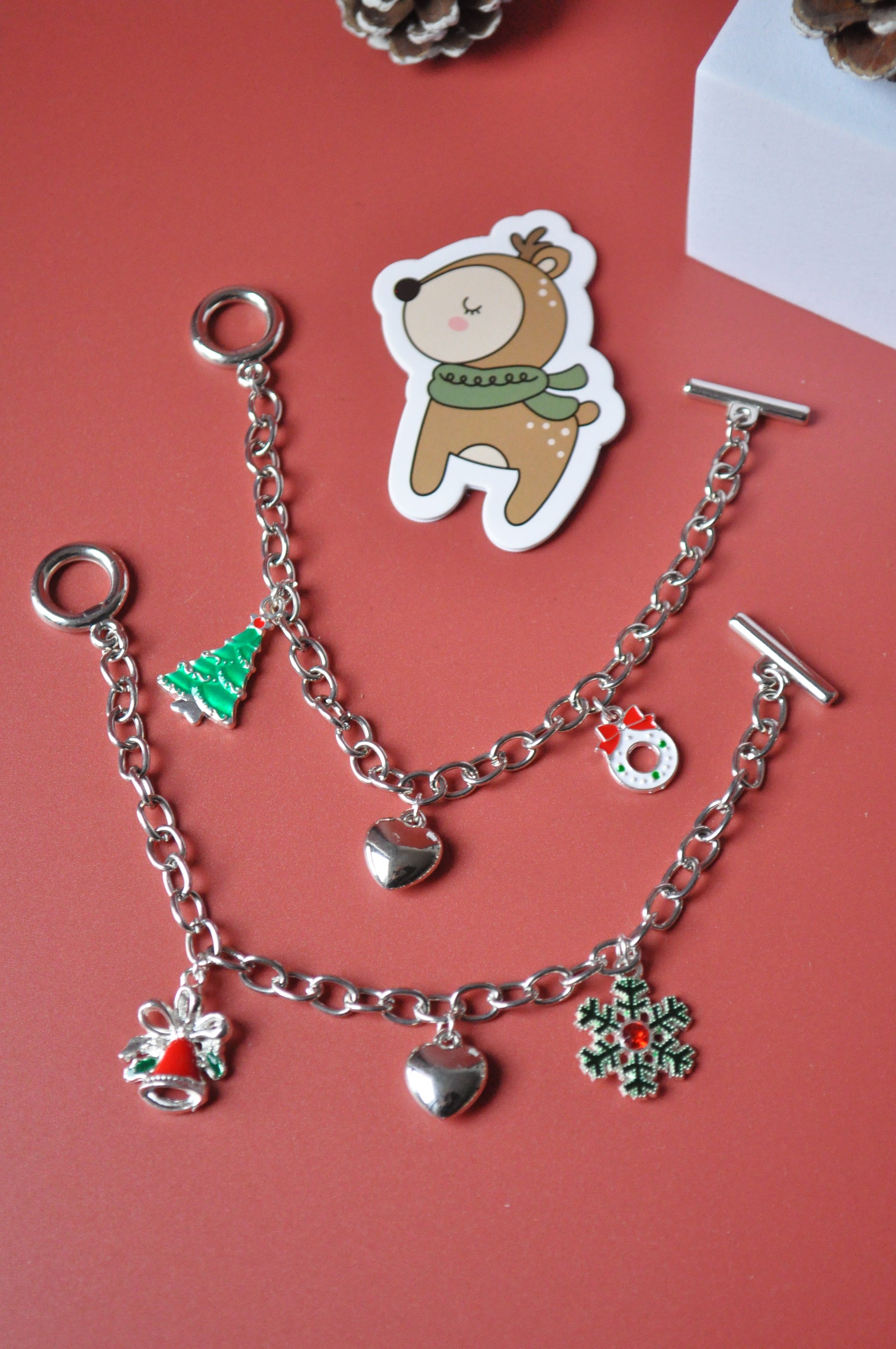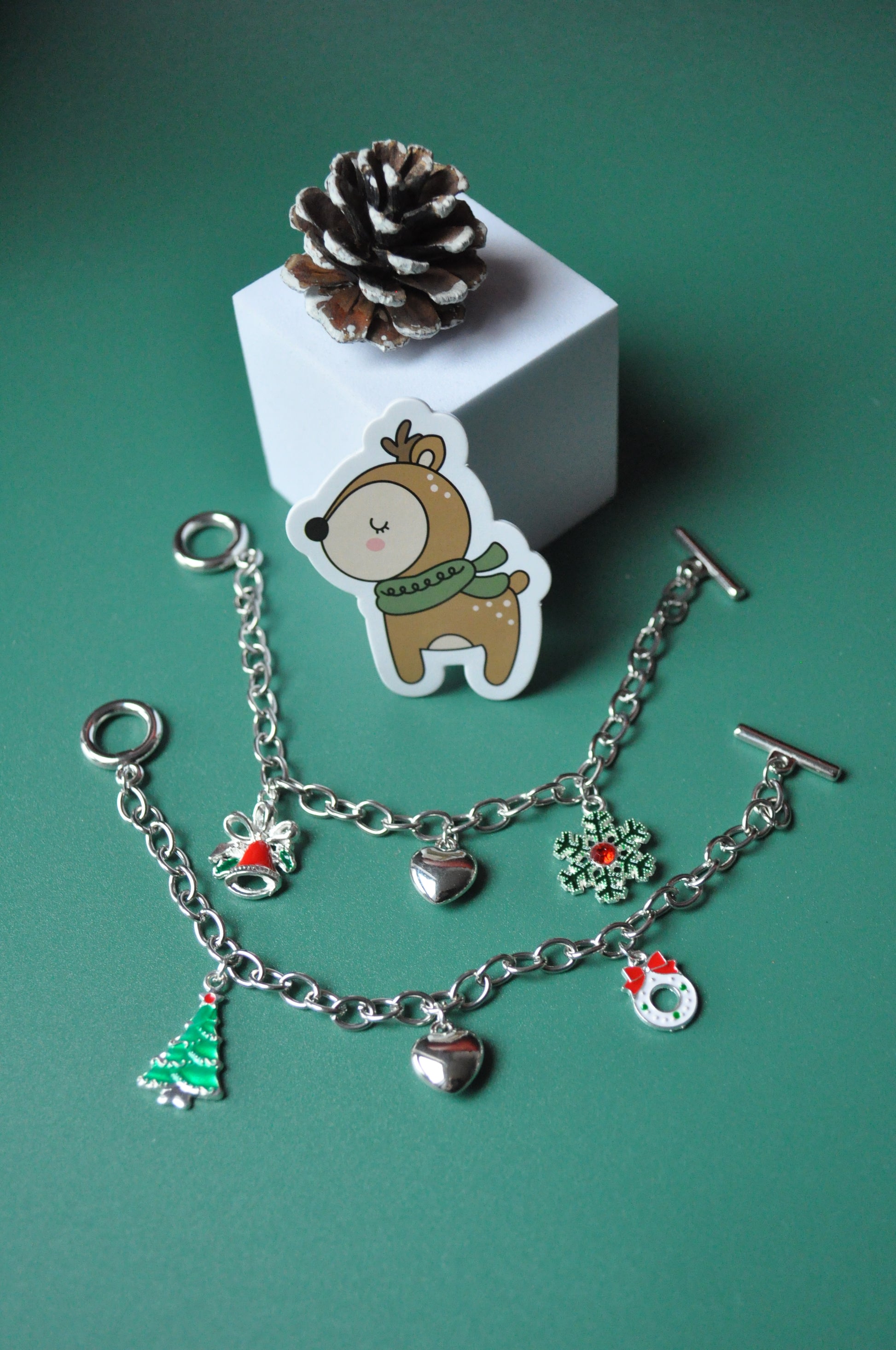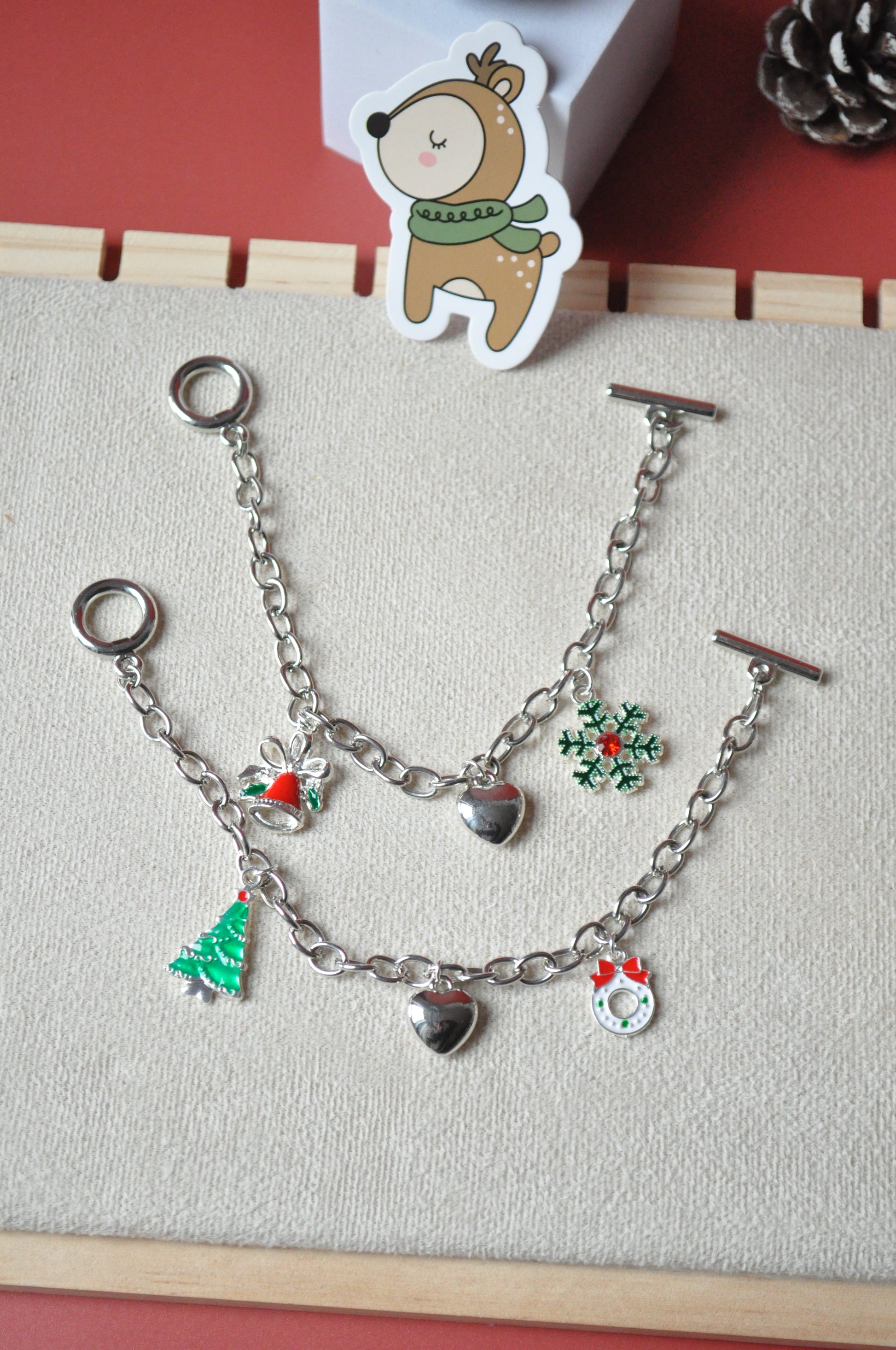 Celebrate the season with this elegant silver-tone Christmas charm bracelet, featuring a convenient toggle clasp for easy wear. This festive bracelet is adorned with three charming Christmas-themed charms, adding a touch of holiday spirit to any outfit. Perfect as a gift or a stylish addition to your own festive wardrobe, this bracelet is designed to bring joy and seasonal cheer.
