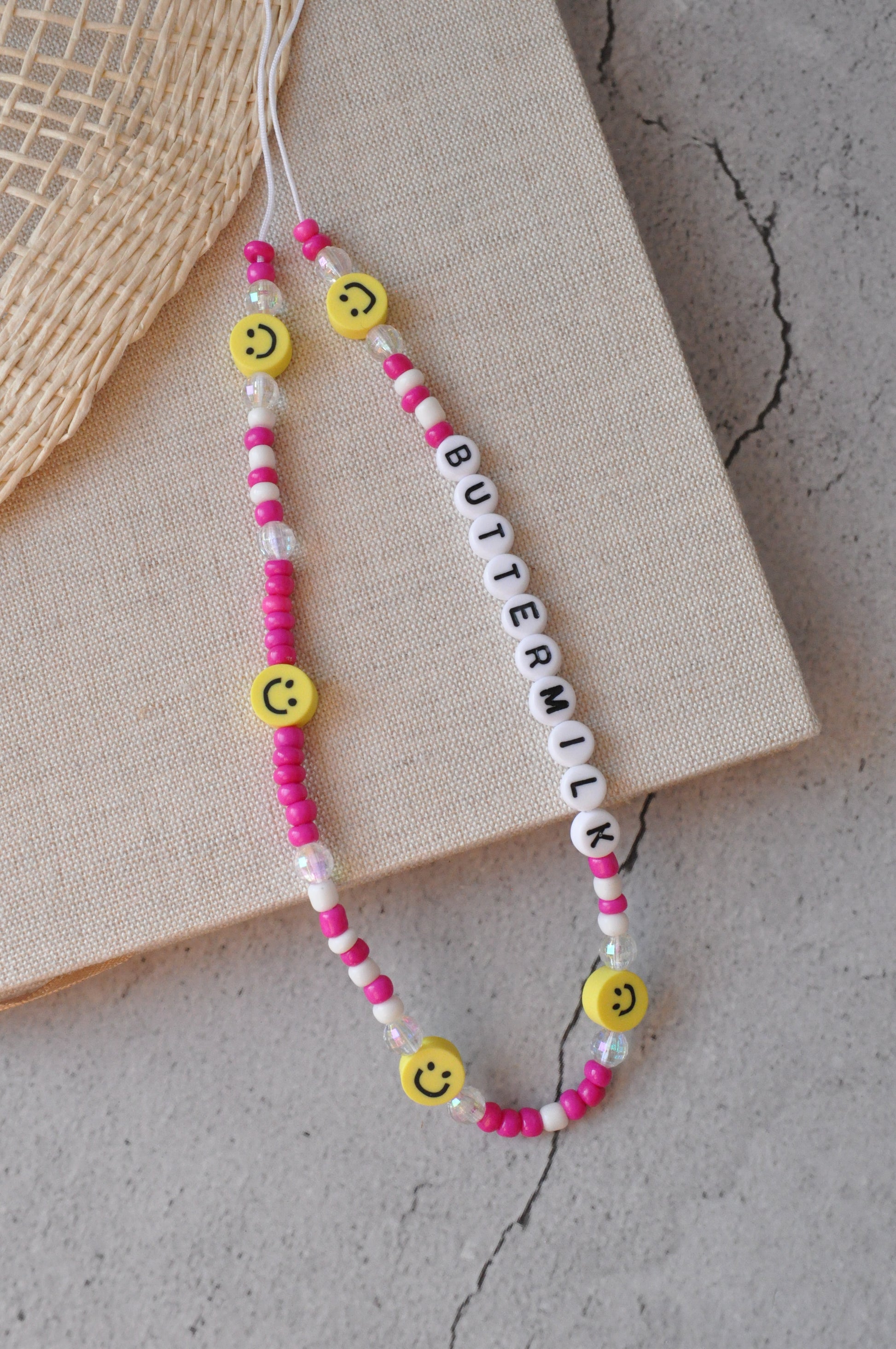 Brighten up your phone with our hot pink & yellow smiley phone charm! Personalised with your choice of letters, this fun beaded accessory adds a playful touch to your device. Perfect as a unique gift or to express your style. Handmade with care.