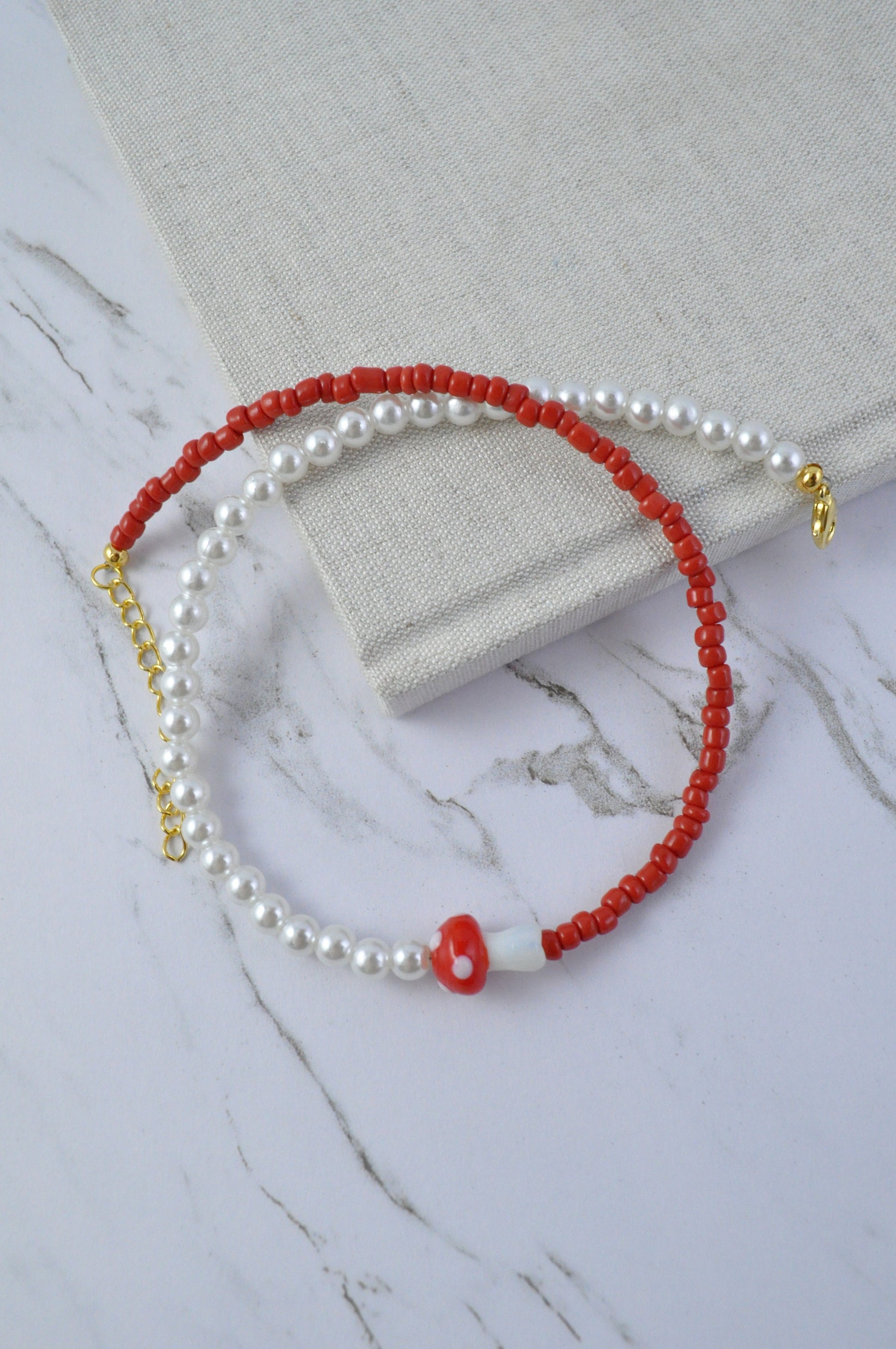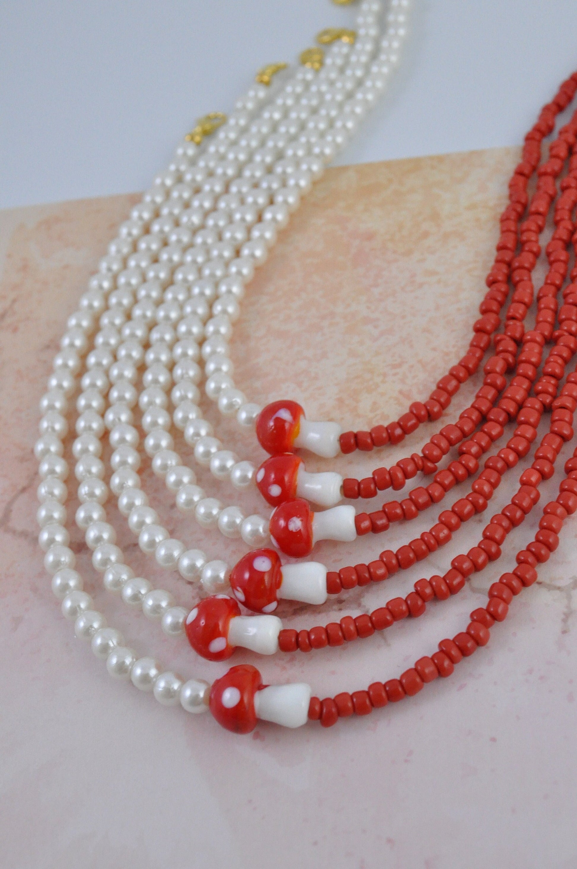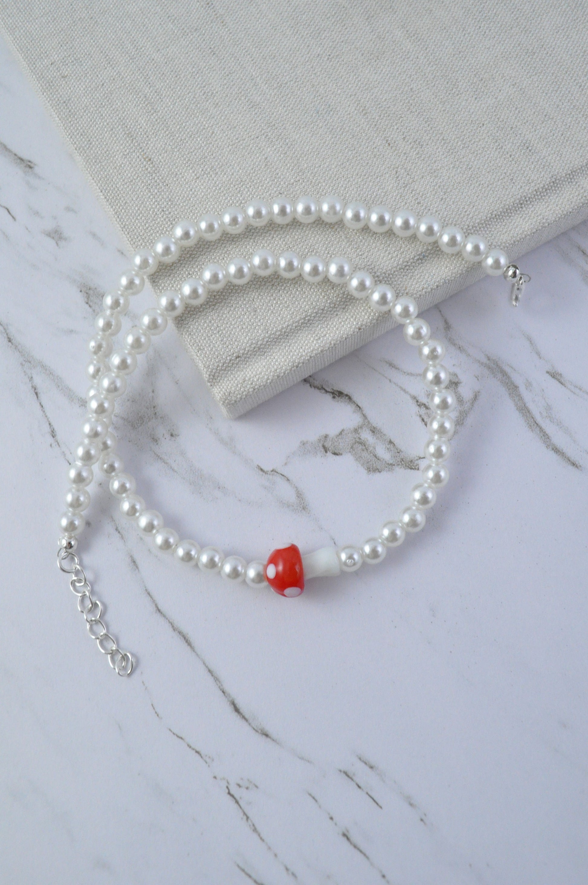 Looking for a unique and chic necklace? Check out our beaded pearl necklace with the cutest glass mushroom bead! Our dainty necklaces are perfect for stacking or wearing alone. The cute mushroom necklace features delicate glass mushroom beads in a y2k style necklace. The lampwork mushroom bead adds an extra touch of interest to this chic necklace.