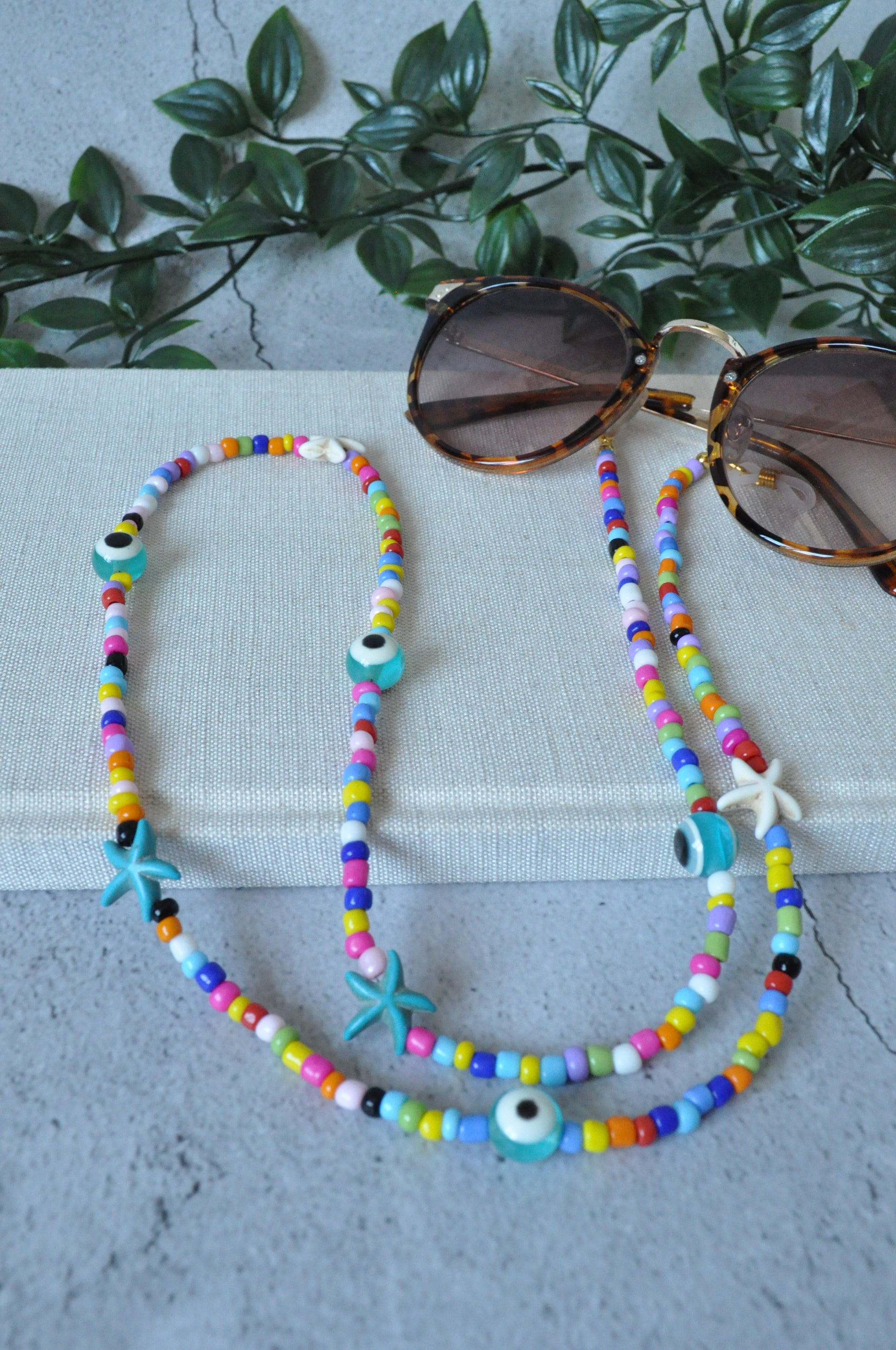 Elevate your eyewear game with our Colourful Evil Eye Beaded Glasses Holder. Handcrafted with intricate glass seed beads and the protective evil eye motif, this vibrant holder secures your glasses while adding a stylish touch to any space. A perfect blend of function and culture, it keeps your eyewear safe from scratches and misplacement.