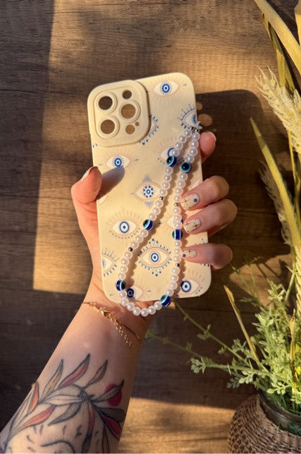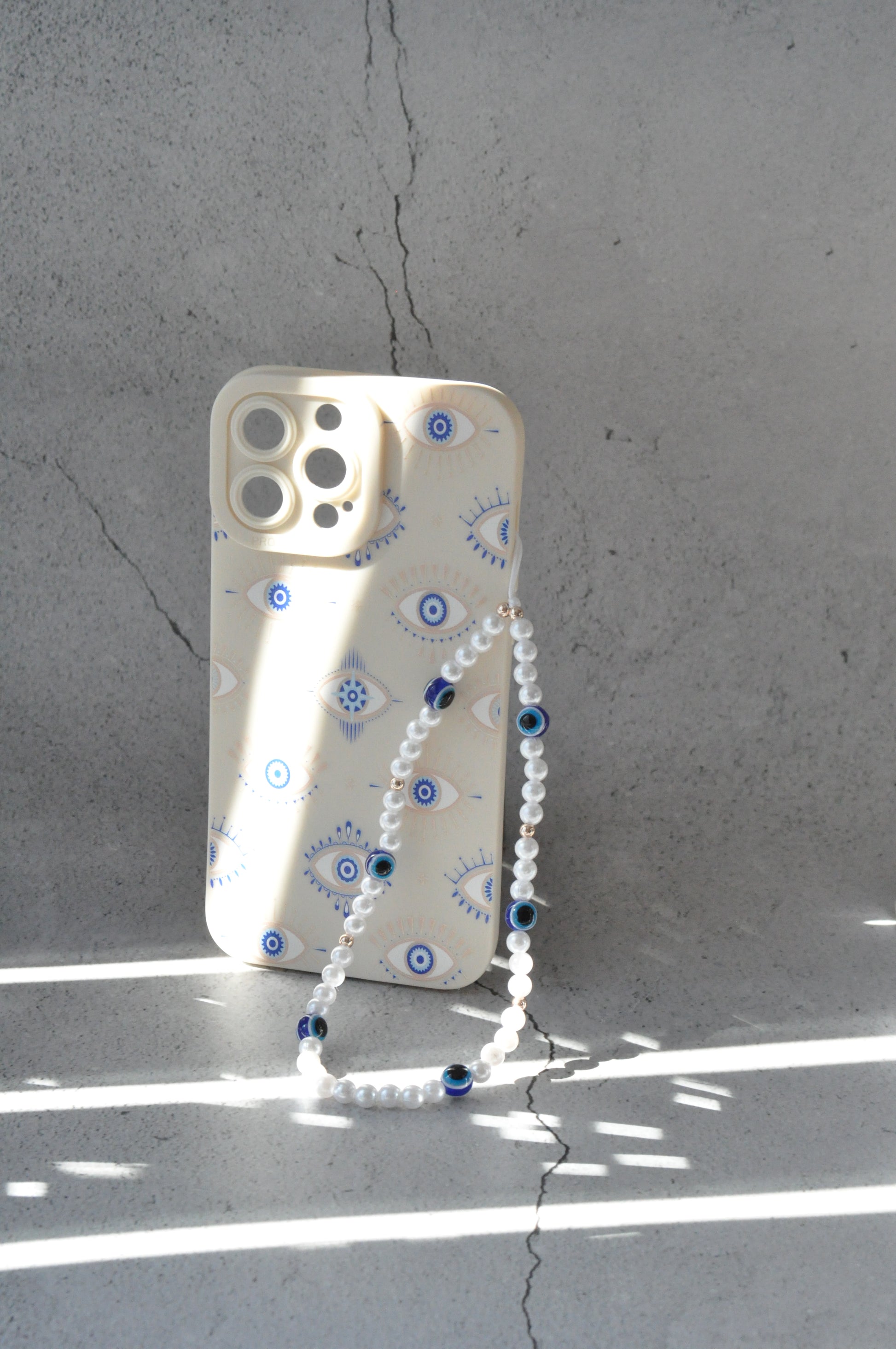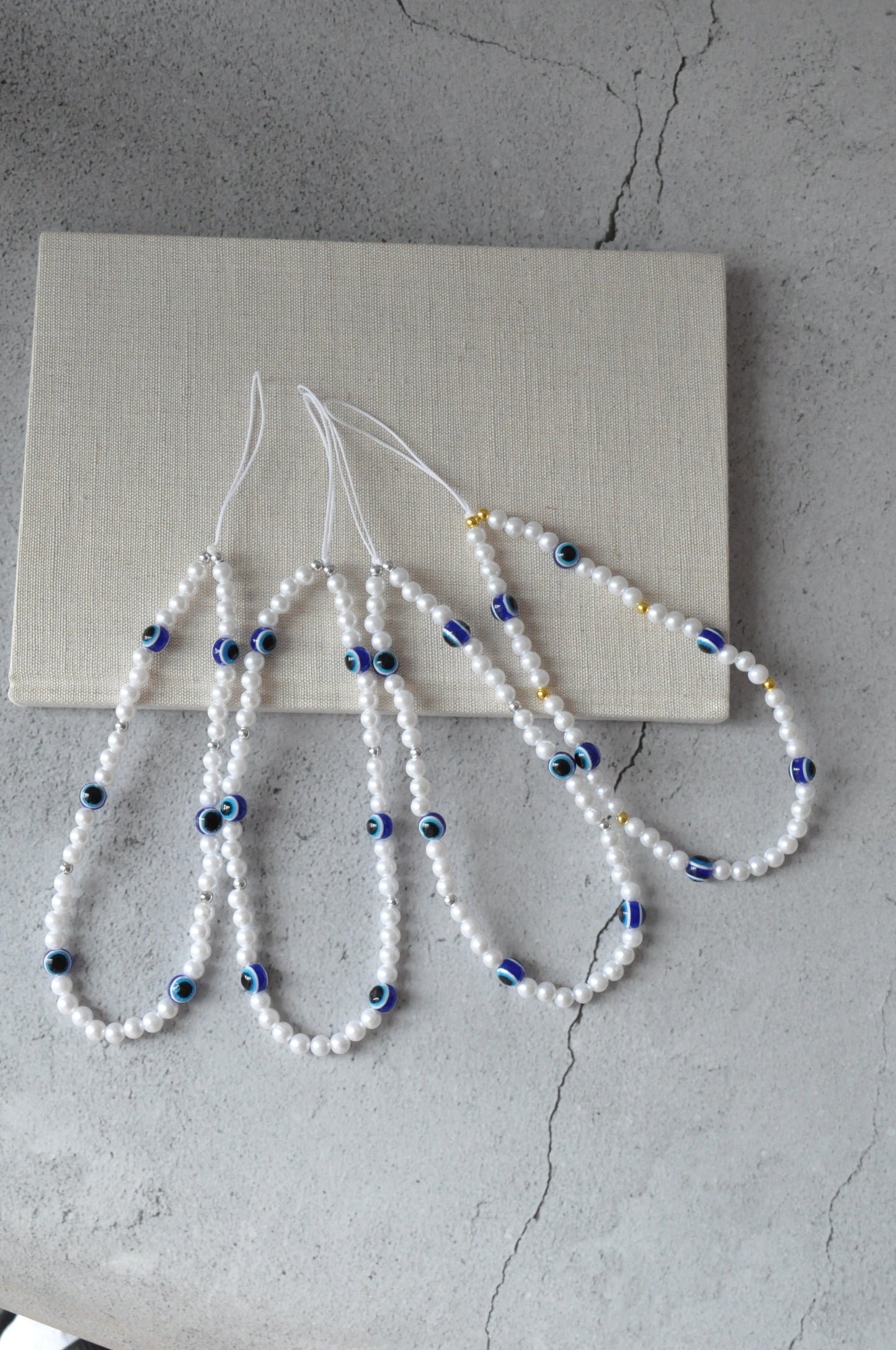 Stay stylish and protected with this handmade evil eye phone charm! Featuring pearl beads and a traditional evil eye charm, it keeps negative energy away while adding a chic touch. The durable cord easily clips onto your phone or bag. Personalise it with names, initials, or favourite words for a unique touch. Perfect for stylish gals who love keeping their phone secure and close!