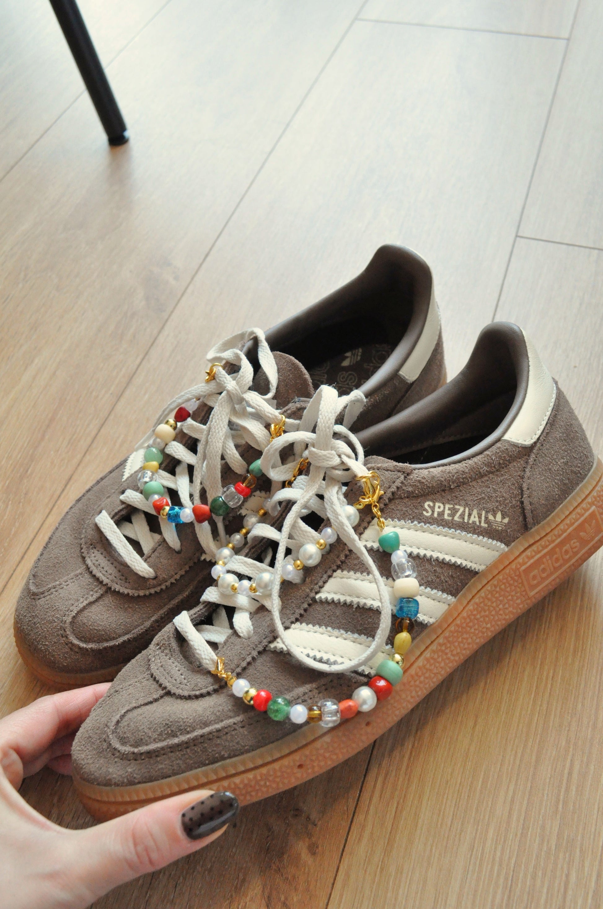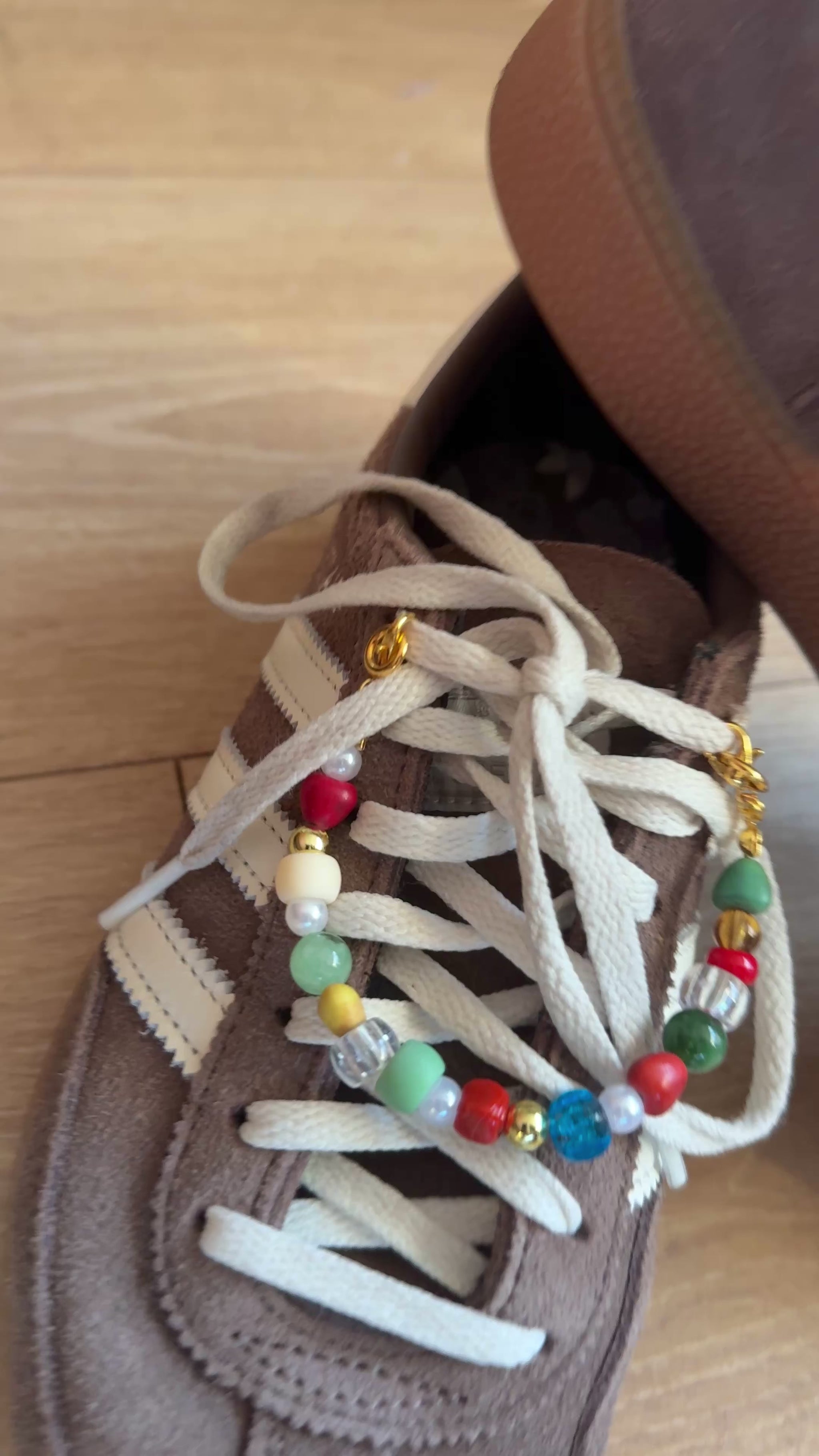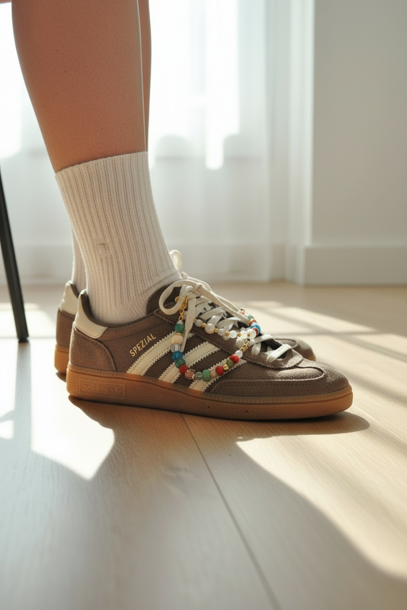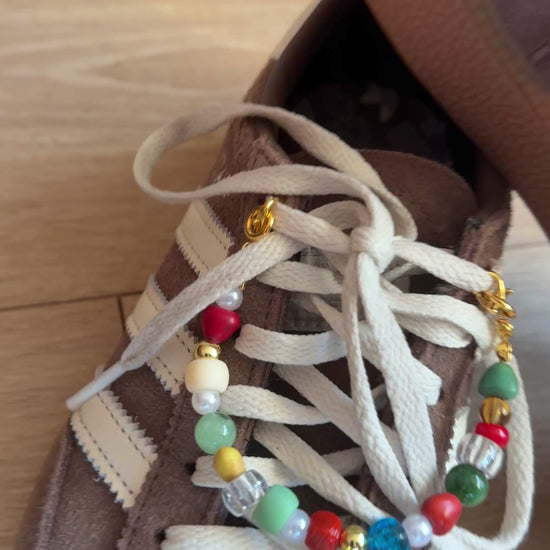 Add a touch of charm to your favourite trainers with this handmade beaded shoe chain. Designed with a mix of glass beads, Murano-style beads, acrylic beads, pearls, and gold-tone details, it brings a fun and stylish finish to any pair of shoes.
