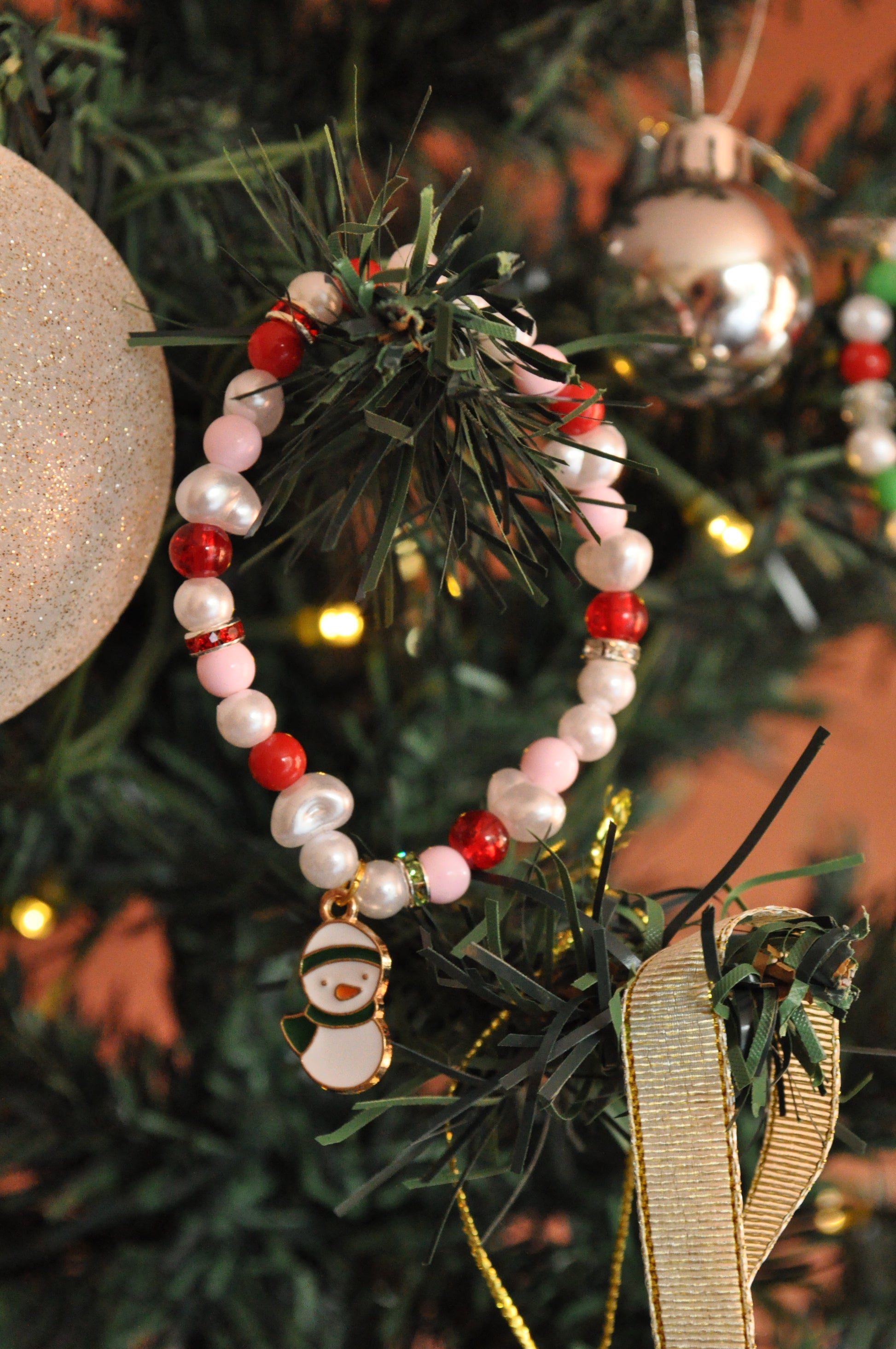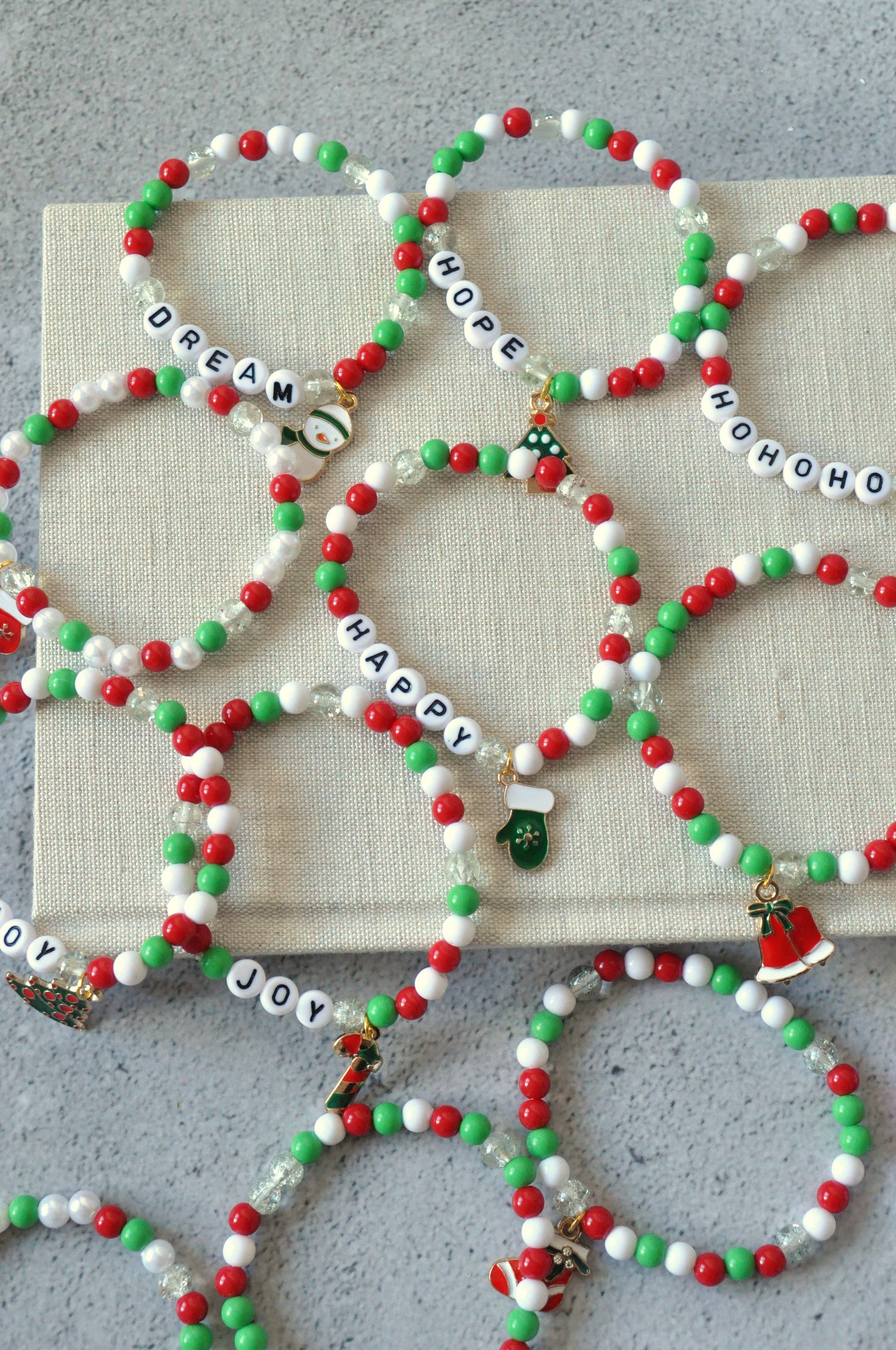 Our festive bracelets feature silver, red, green, and rhinestone beads, with enamel or plated charms.