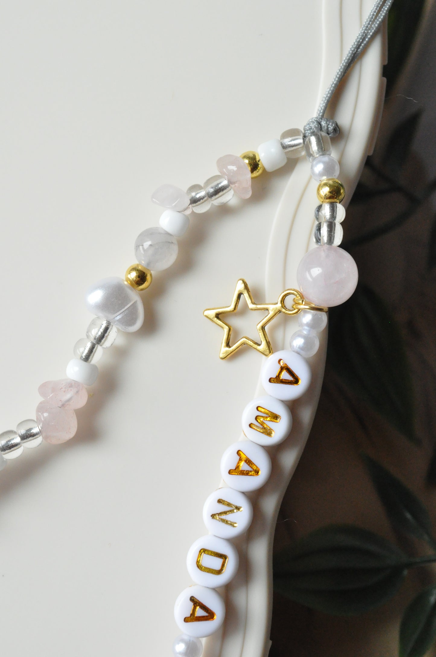 Experience the elegance of our Rose Quartz Gemstone Phone Strap. Crafted with genuine Rose Quartz beads and faux freshwater pearls, this sophisticated charm promotes self-love and emotional healing. Personalise it with your initials for a unique, meaningful accessory that adds tranquility and style to your phone