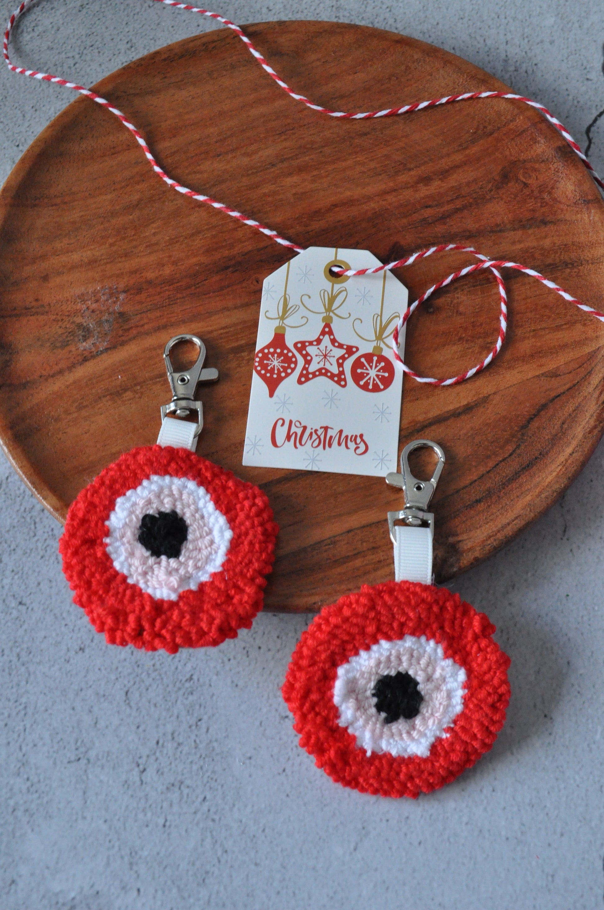 Ward off negativity in style with our Tufted Evil Eye Bag Charm Keychain! Handmade with precision, this charm is available in vibrant red and calming green options, making it a chic and meaningful accessory for your bag or keys. Crafted using the punch needle technique, its plush texture and eye-catching design ensure it stands out. A perfect gift or addition to your daily essentials, blending charm and protection effortlessly.