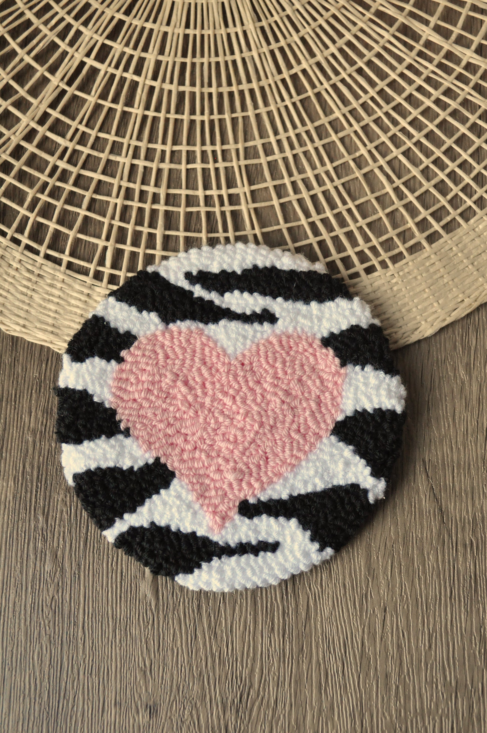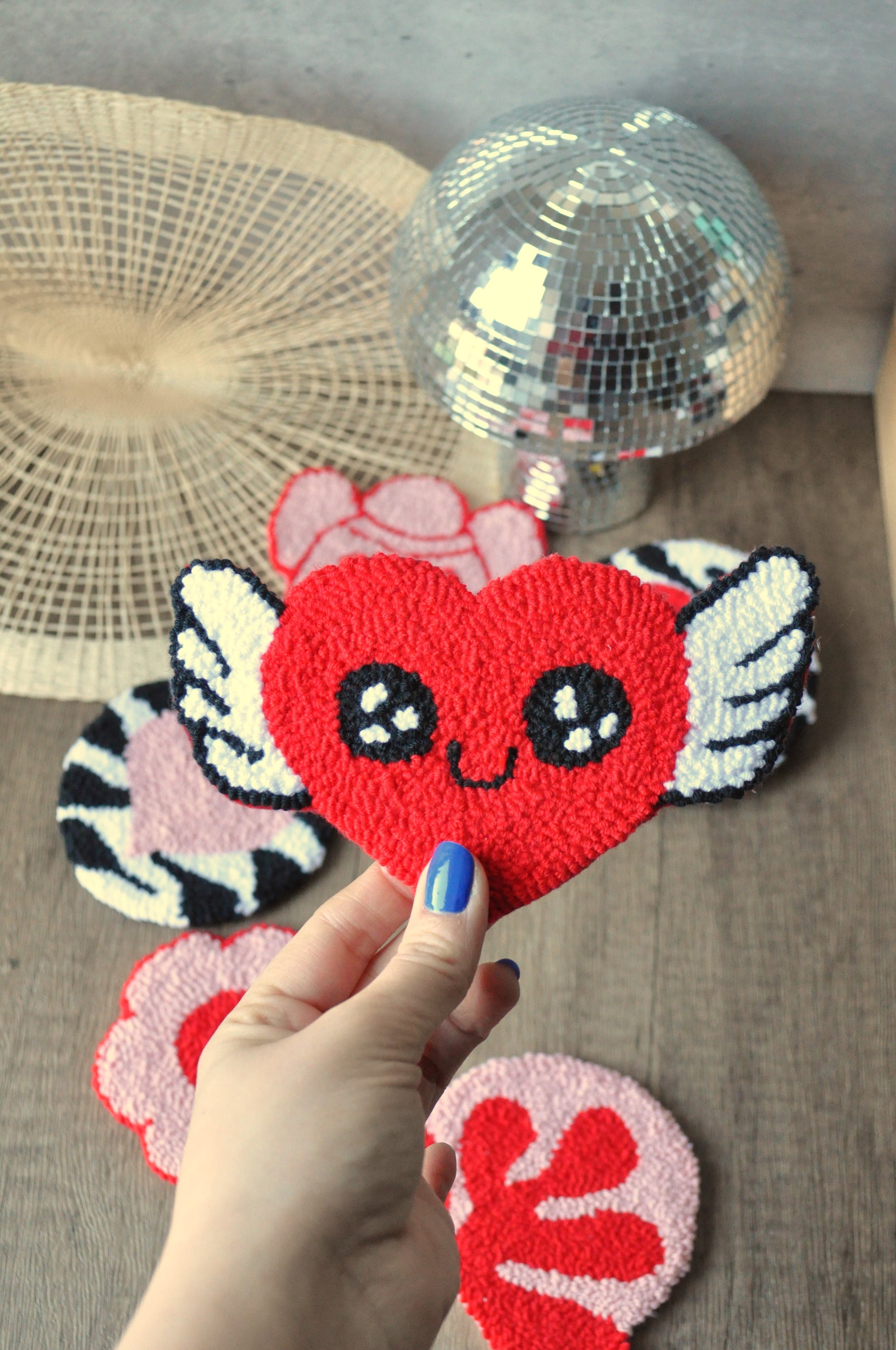 Handcrafted punch needle mug rugs in a variety of designs, including Winged Heart, Pink or Red Heart on Zebra, Cowboy Face with Heart Eyes, and Cute Flower. Made with durable yarn on linen fabric, each coaster is unique and backed with plain felt.