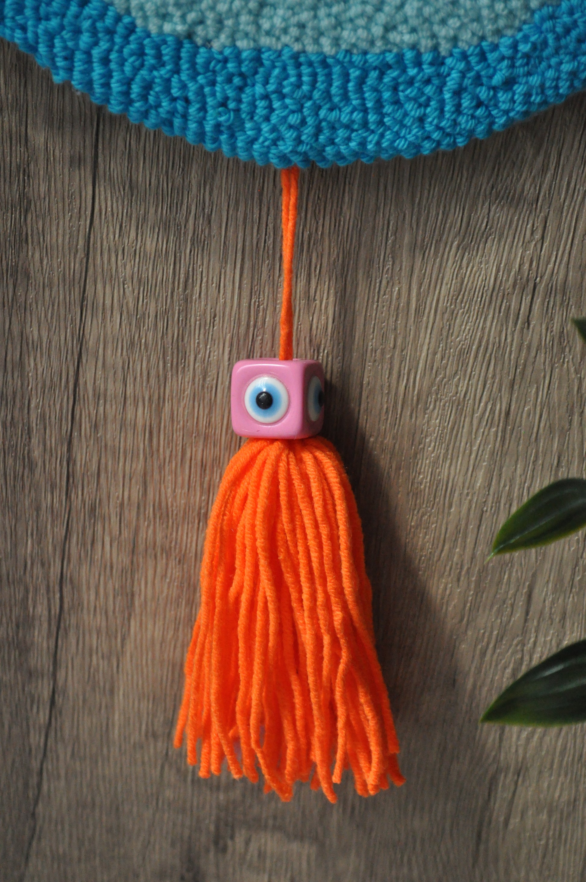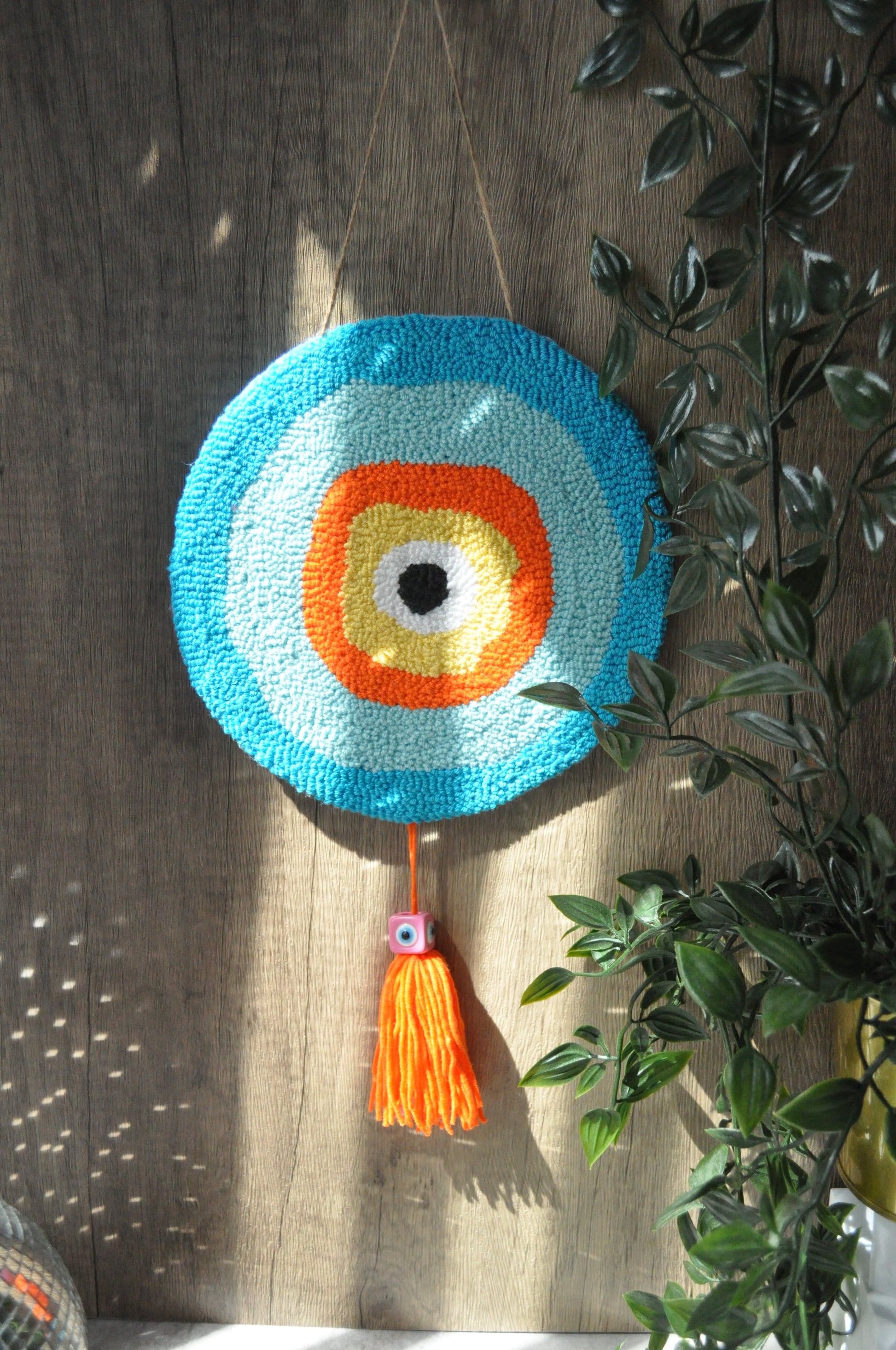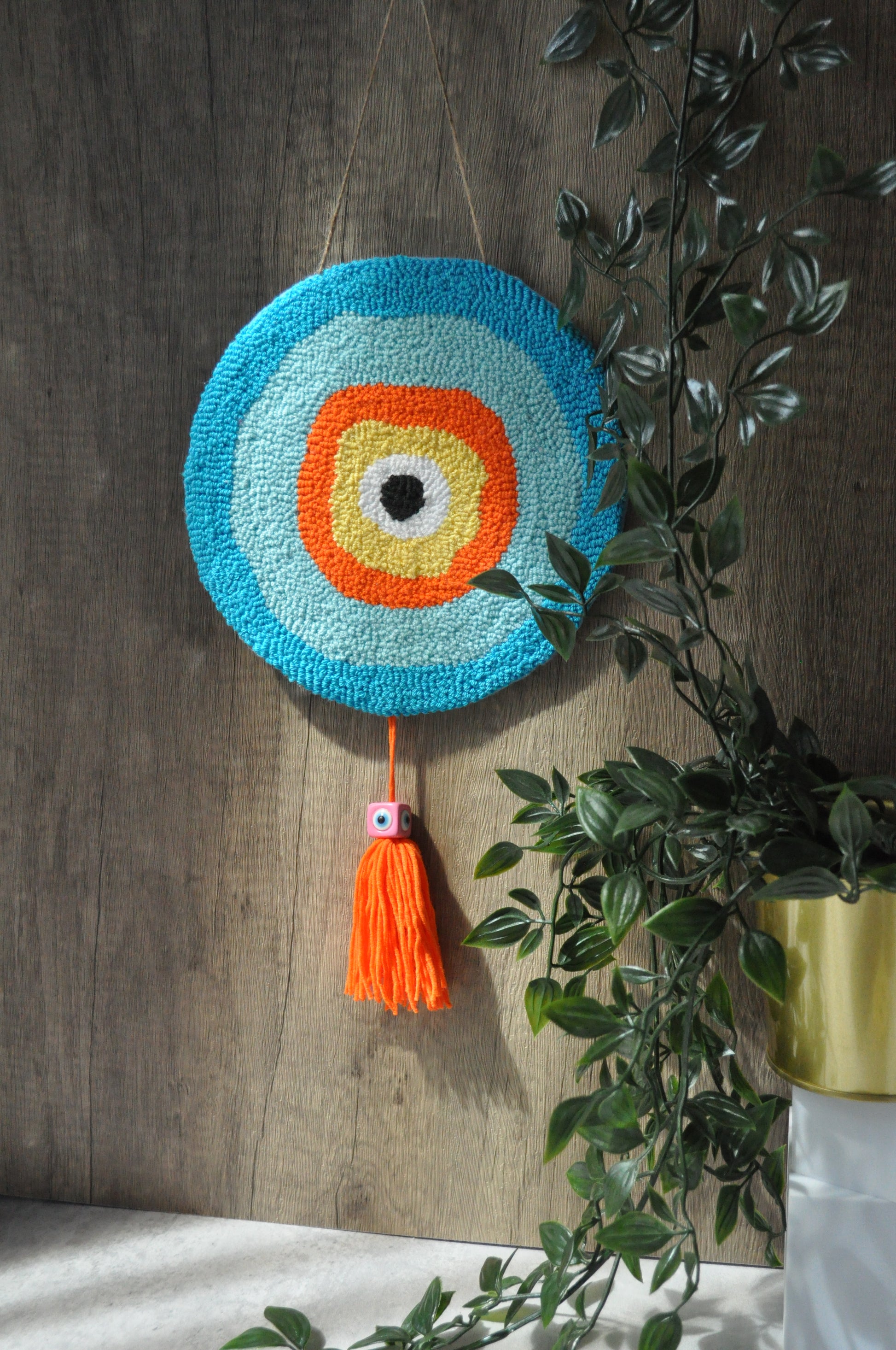 Enhance your space with our unique handmade punch needle wall art, featuring a stunning evil eye design believed to ward off negativity. Crafted with shades of blue, bright orange, and yellow, this intricate piece adds a bold and eye-catching touch to any room. The vibrant orange tassel and pink evil eye bead bring extra charm, making it a standout décor piece.