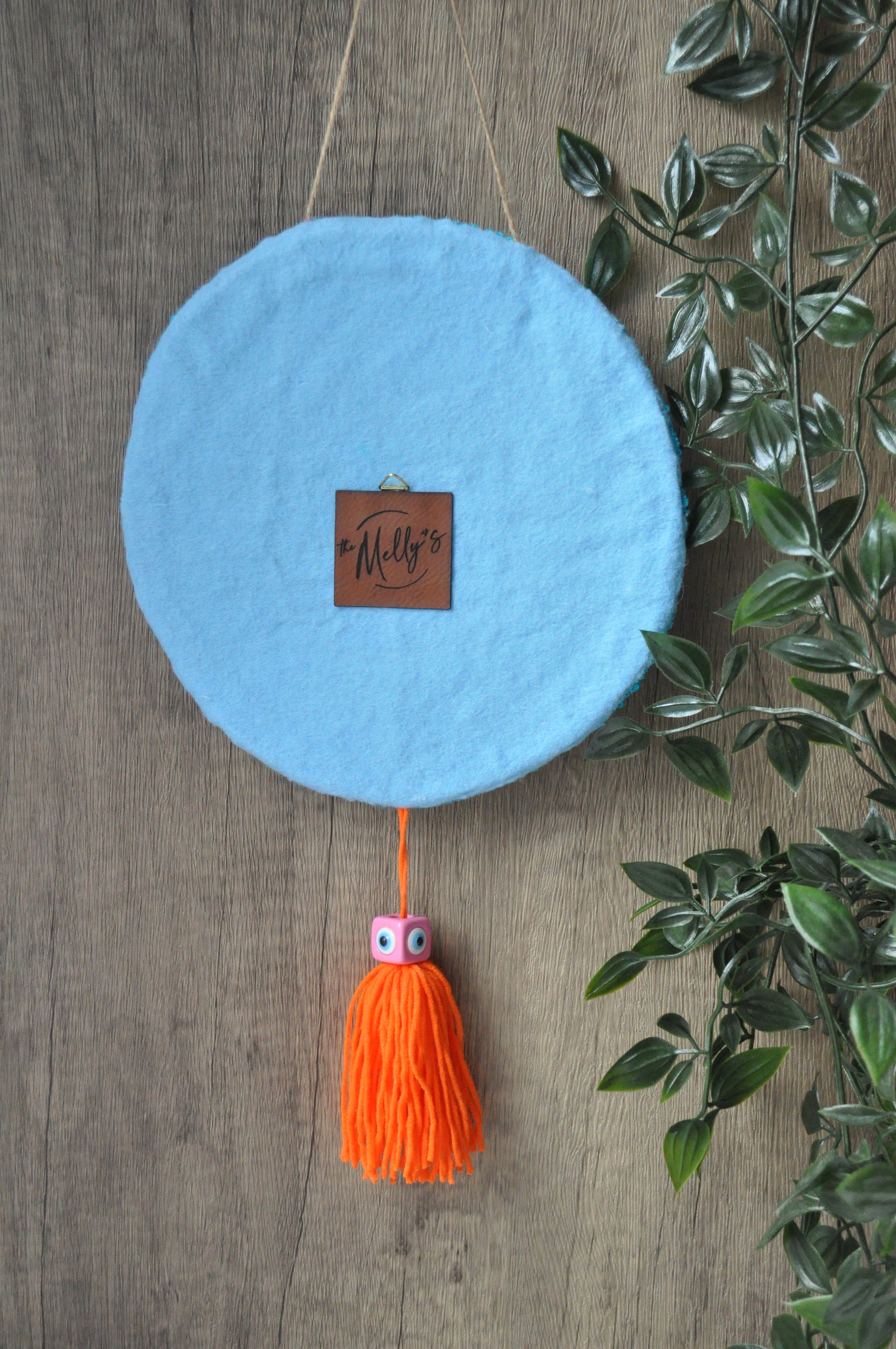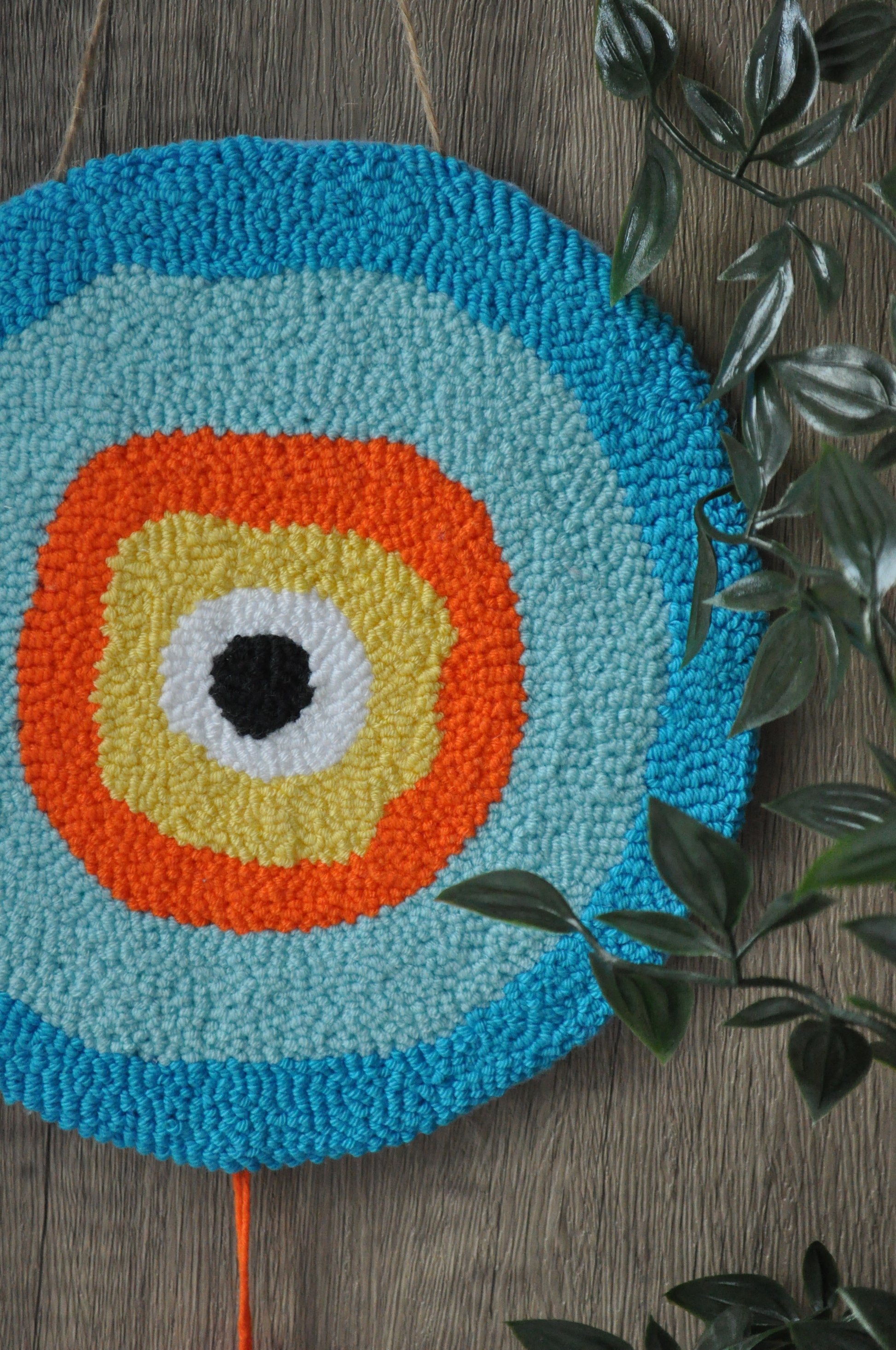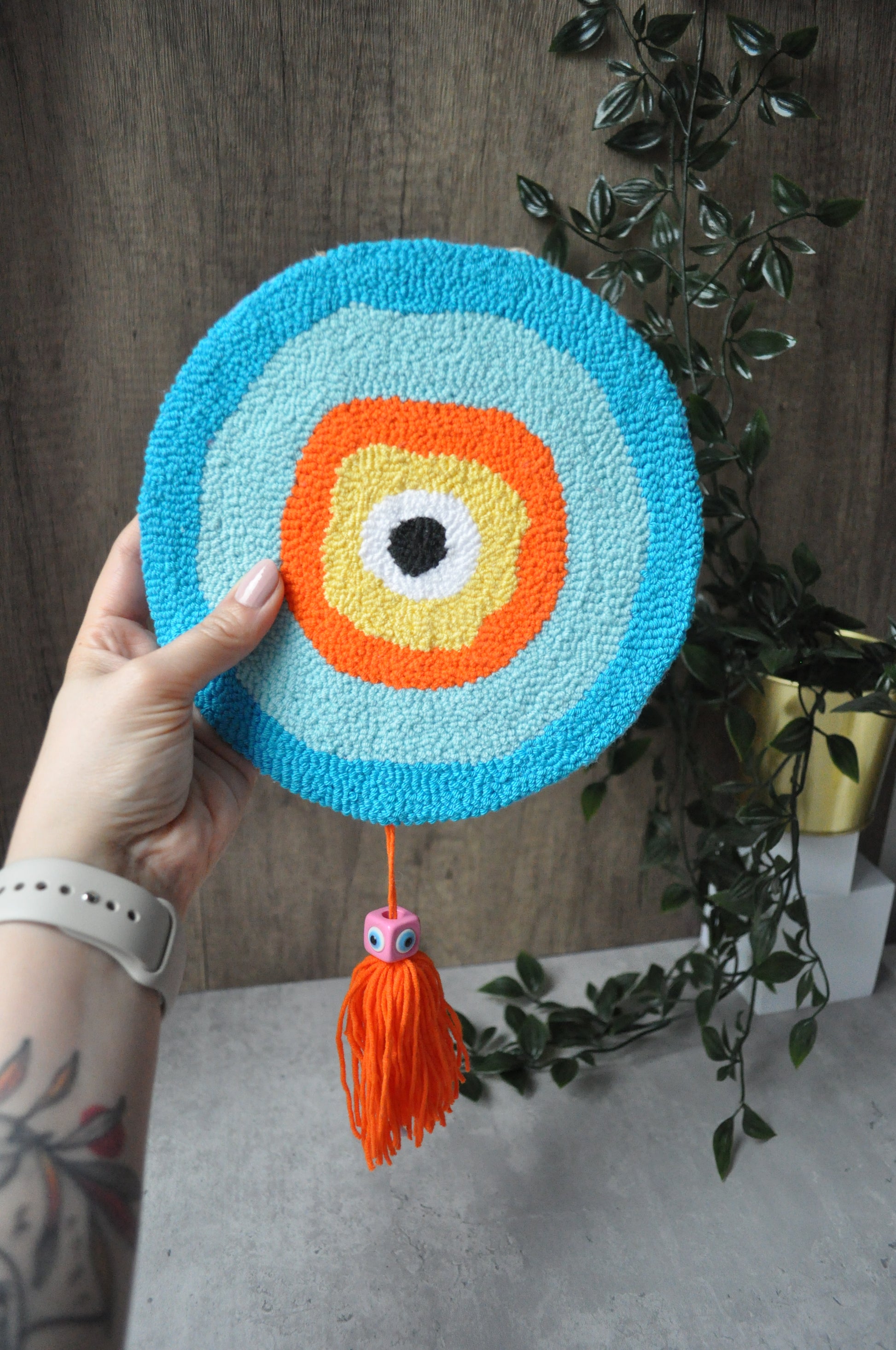 Enhance your space with our unique handmade punch needle wall art, featuring a stunning evil eye design believed to ward off negativity. Crafted with shades of blue, bright orange, and yellow, this intricate piece adds a bold and eye-catching touch to any room. The vibrant orange tassel and pink evil eye bead bring extra charm, making it a standout décor piece.