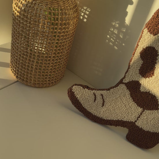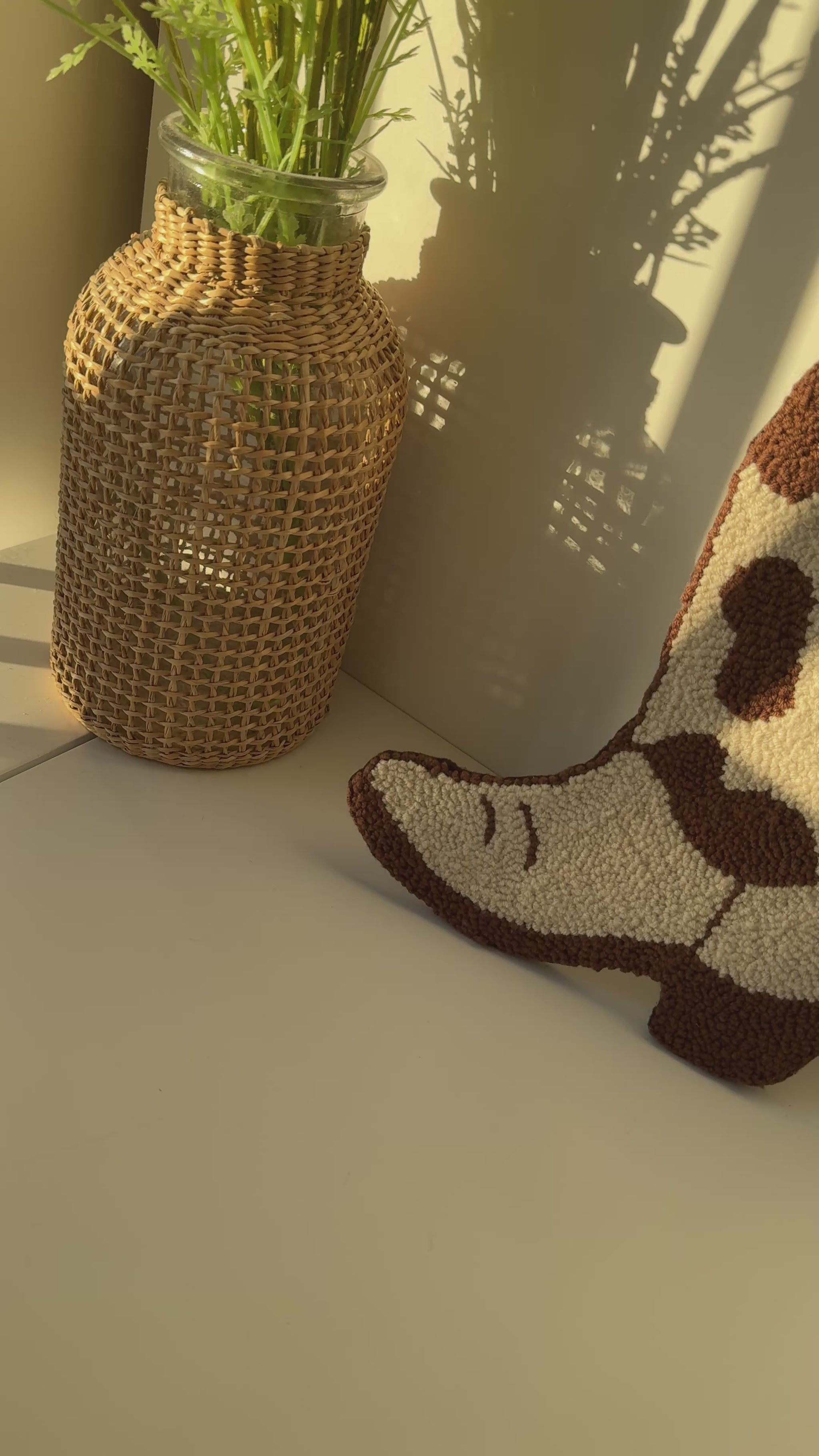 Bring a western touch to your space with this handmade cowboy boot wall hanging. Designed in warm brown and cream cow-print tones, this tufted décor piece adds a cosy rustic feel to any room. It also features a small circular mirror — perfect as a cute accent rather than a functional mirror.