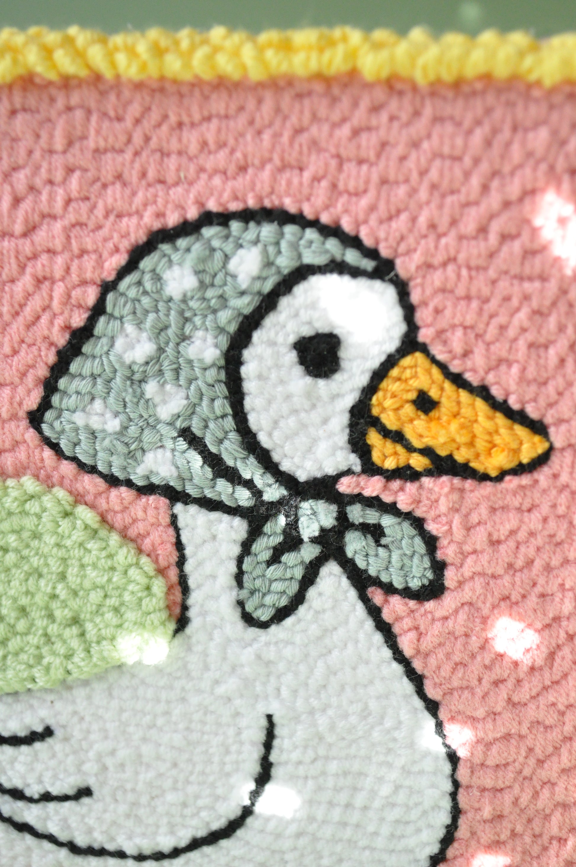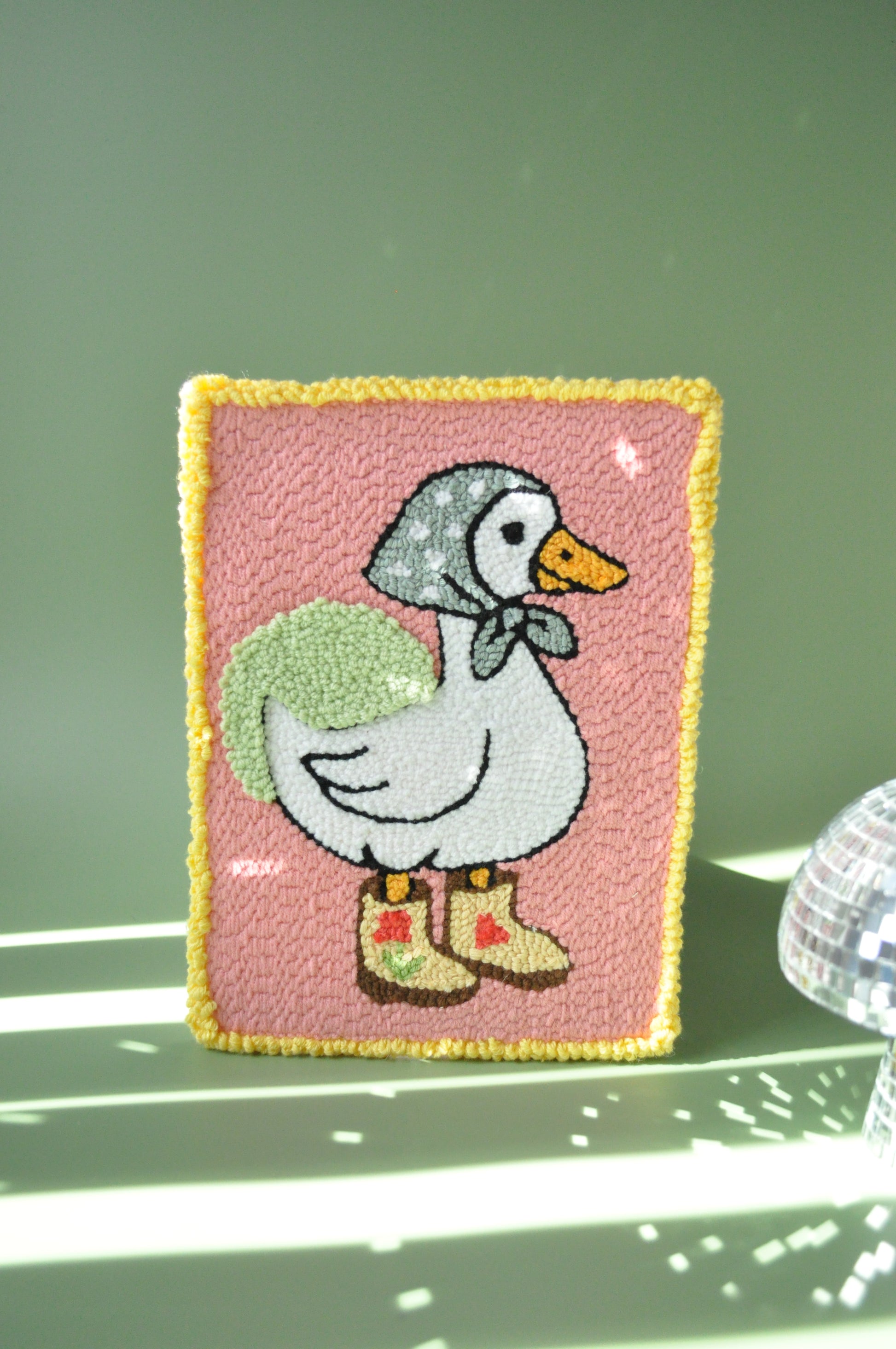 Bring some playful charm to your walls with this handmade punch needle artwork featuring a duck in a colourful headscarf and mismatched boots. Set against a pink background with bold yellow sides, this quirky piece is perfect for fans of TikTok trends, animal lovers, and anyone who enjoys unique, cheerful home decor.