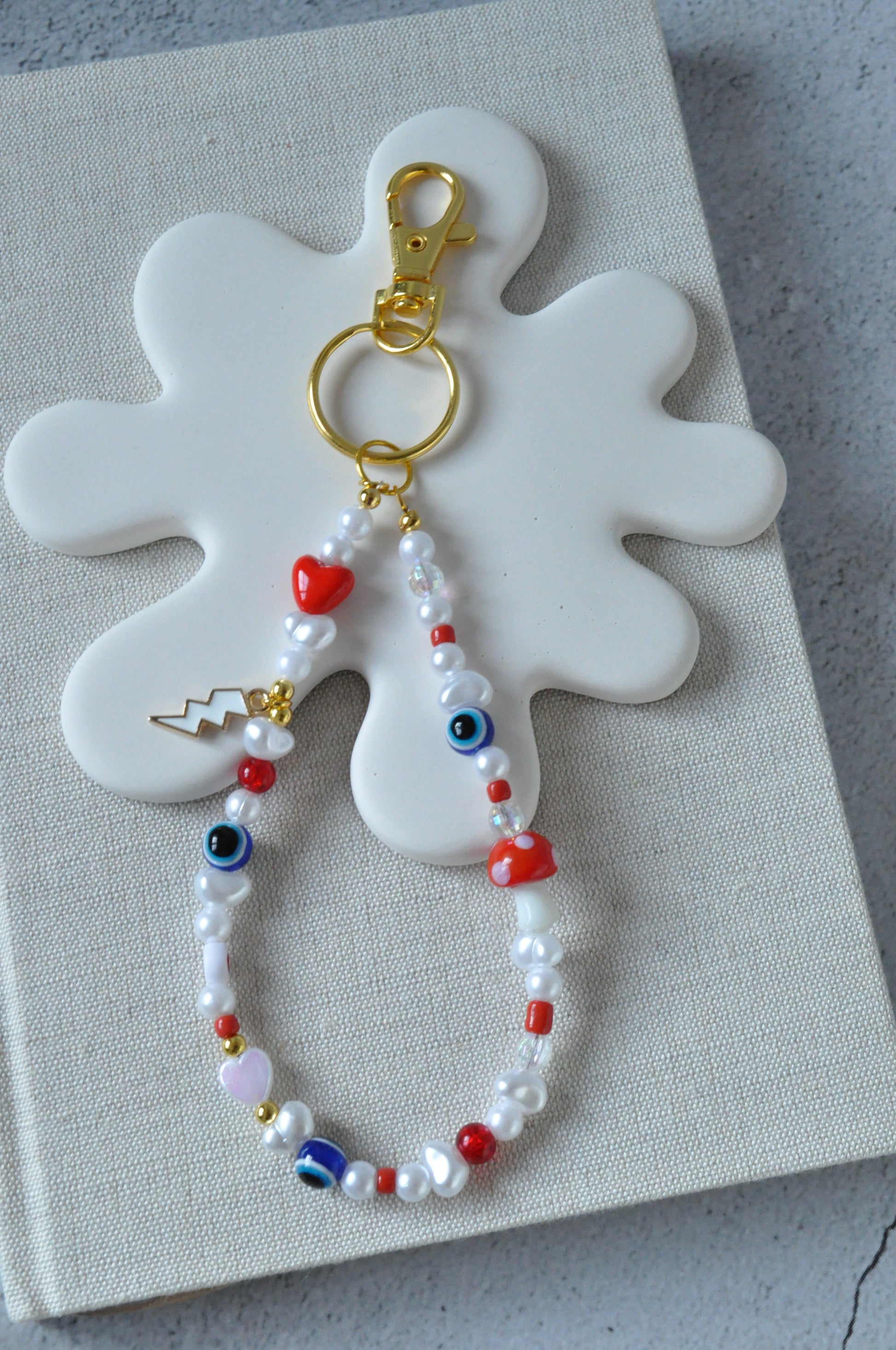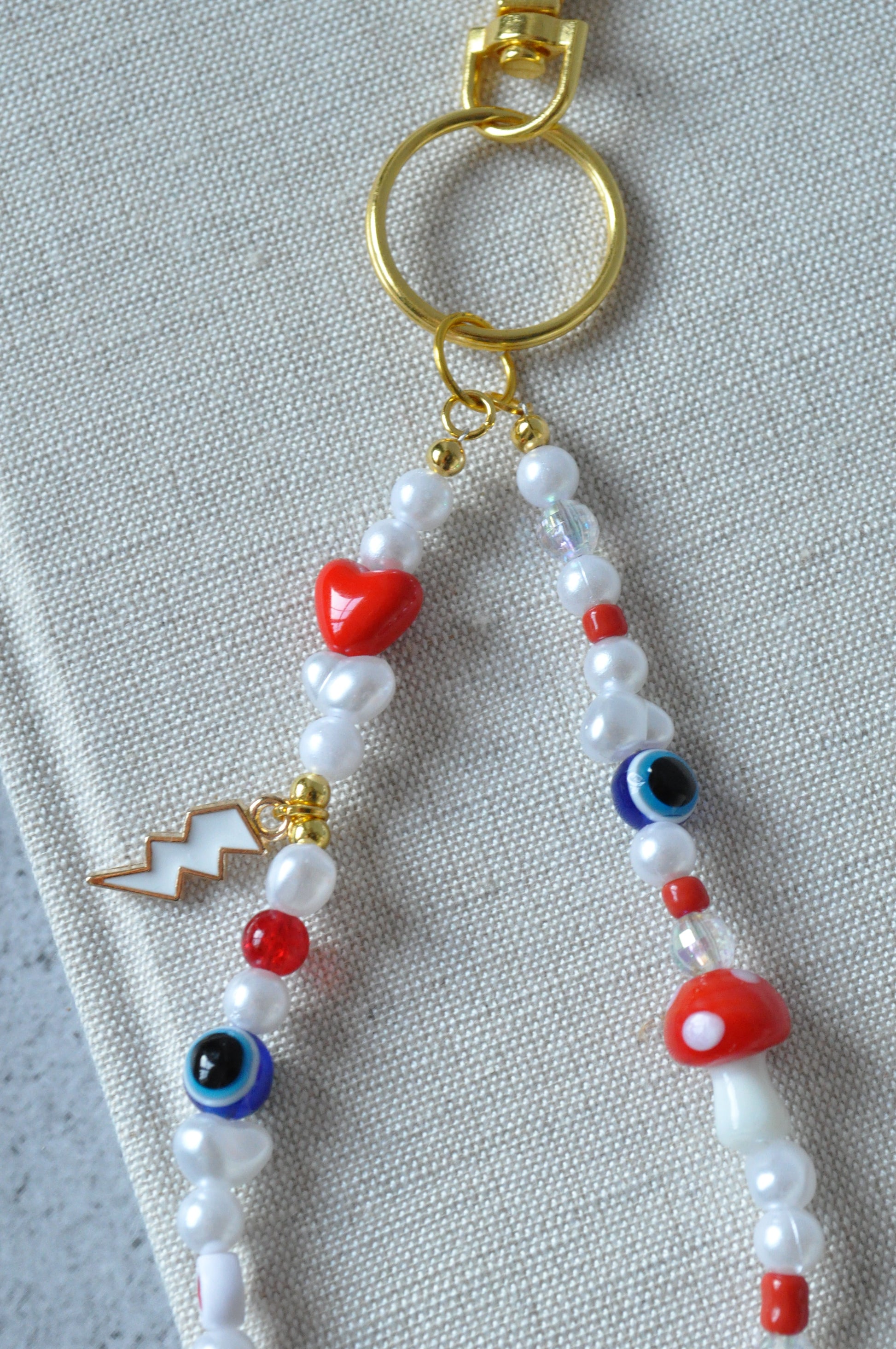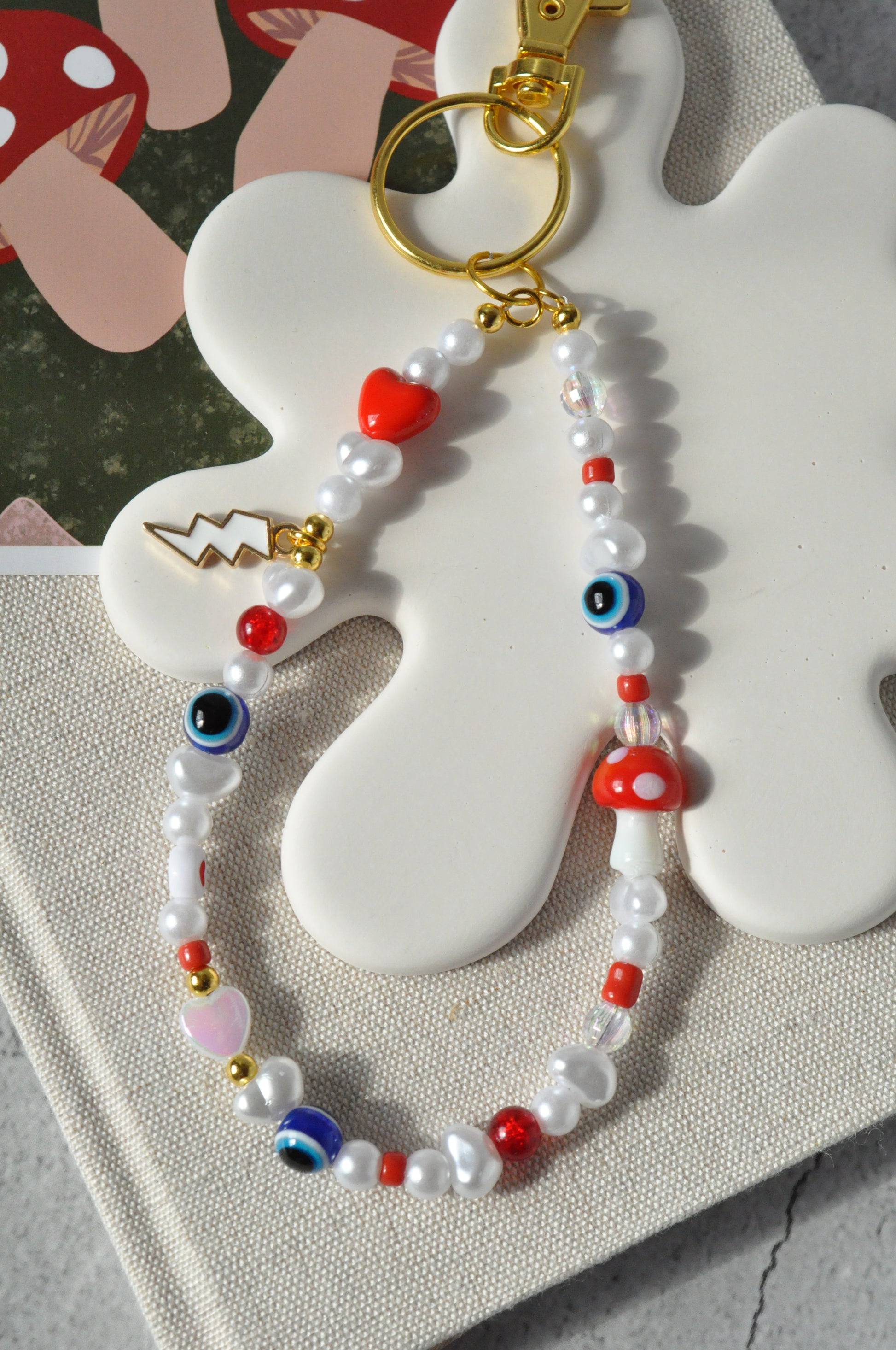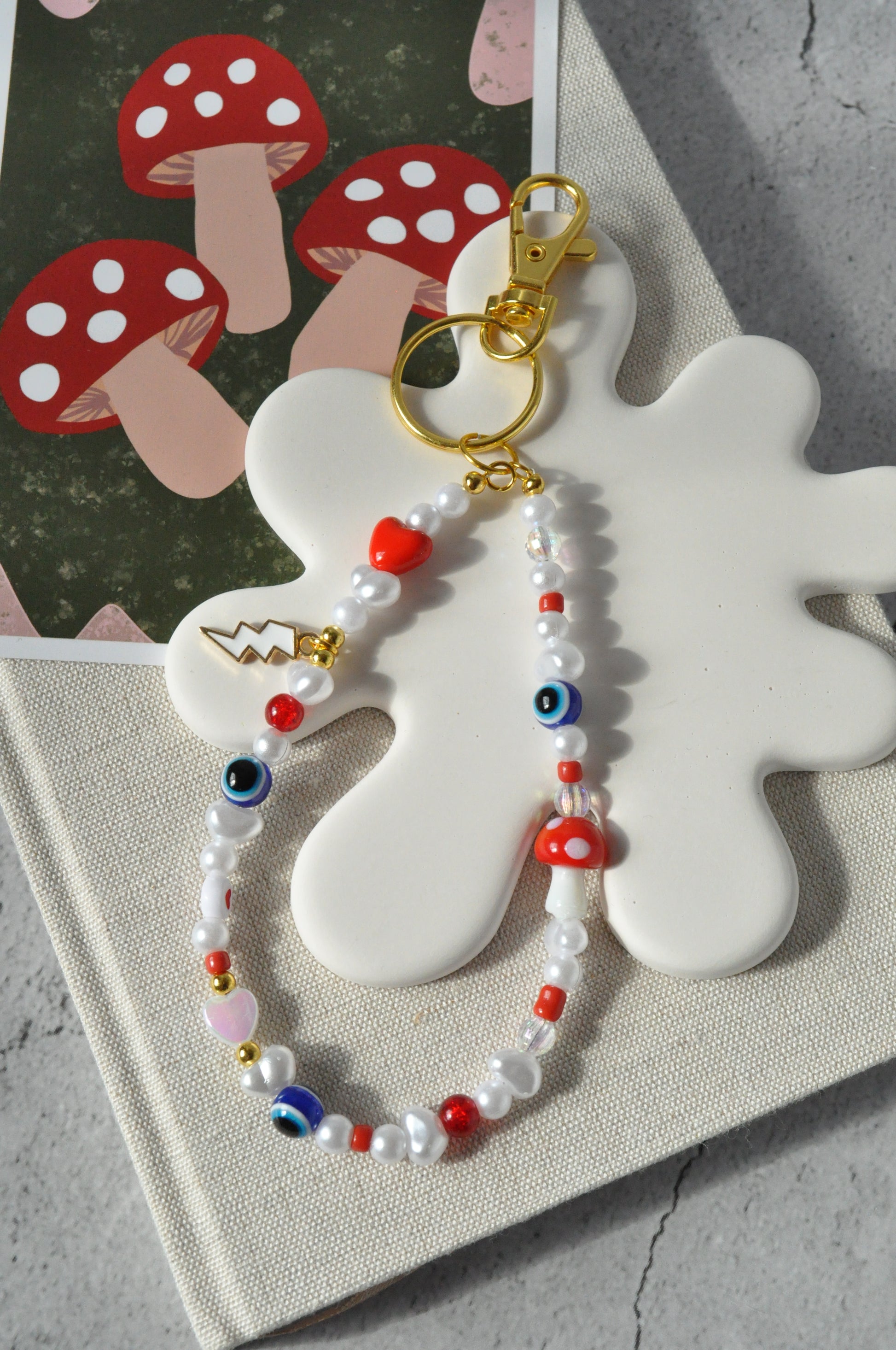 Looking for a unique and stylish addition to your keychain collection? Look no further than our Y2K-style beaded keychain, featuring a stunning red mushroom made of lampwork glass and a variety of beads in different shapes and sizes.